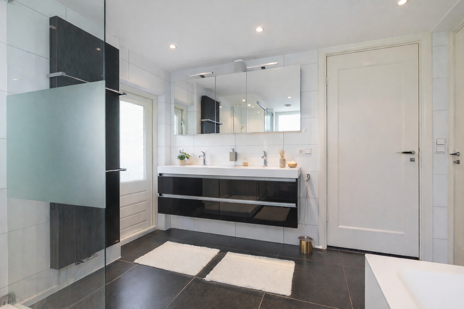 The second floor offers a fully functional and flexible living level, comprising a spacious landing, two large bedrooms and a third room with a skylight. Both main bedrooms have access to a second bathroom, fitted with a walk-in shower, vanity unit and toilet. Thanks to its layout and facilities, this floor is ideally suited for use as a self-contained guest accommodation or apartment.