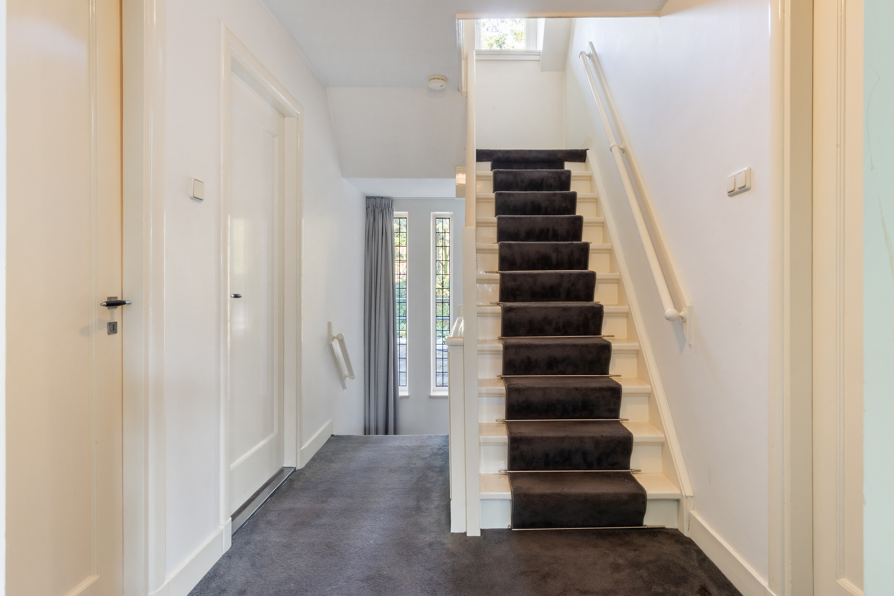 The staircase with landing and stained-glass windows leads to the first floor. Here you will find the spacious principal bedroom with access to the balcony, fitted wardrobes and air conditioning. The adjoining bathroom is luxuriously appointed and includes a bathtub, walk-in shower, double vanity unit, designer radiator and toilet. The bathroom also provides access to the roof terrace.