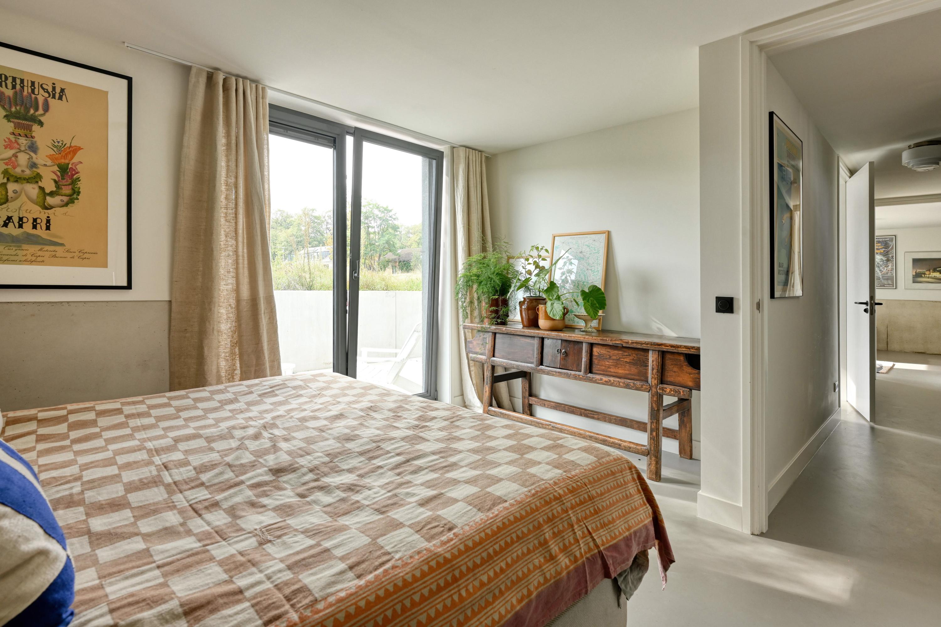 Entree, ruime hal met zicht op de vide. Deze ruimte is met het biljart in gebruik als hobbyruimte met terrasdeuren die geheel opengeschoven kunnen worden naar het terras. Dubbele stalen deuren bieden toegang tot de woonkeuken als ‘het kloppend hart’ van het huis. Het modern vormgegeven kookeiland met marmeren aanrecht staat centraal in de ruimte. Zodra de terrasdeuren over de gehele breedte zijn geopend is heerlijk om in de ochtend te genieten van de ochtendzon en het buitenleven met vrij zicht over een open veld. In combinatie met de groene kleurstelling van de keuken en de muur die tot aan het plafond is getegeld met Marrokkaanse tegeltjes is een geraffineerde mix van luxe materialen en sfeer ontstaan. Uiteraard is de keuken voorzien van de benodigde inbouwapparatuur. Een grote berging/bijkeuken doet dienst als provisieruimte en was- en linnenruimte. Een houten trap brengt u naar de woonkamer met ramen en deuren naar de vloer met vrij uitzicht over de natuur aan de zuidzijde van het huis. Een trap brengt u een niveau lager naar een gang met kledingkasten waaraan de slaapvertrekken en de badkamer zijn gesitueerd. 3 Ruime slaapkamers zijn voorzien van terrasdeuren naar het naastgelegen terras. Een luxe badkamer is gerealiseerd met ligbad, douche, toilet en een wastafel voor 2 personen. Een trap brengt u naar de 4e slaapkamer aan de zuidzijde van het huis. Deze kamer is voorzien van een wastafel. Omdat overal de ramen en deuren van glas tot de vloer doorlopen staat u in direct contact met de natuur. Vanuit de keuken is een vaste trap naar de vide.