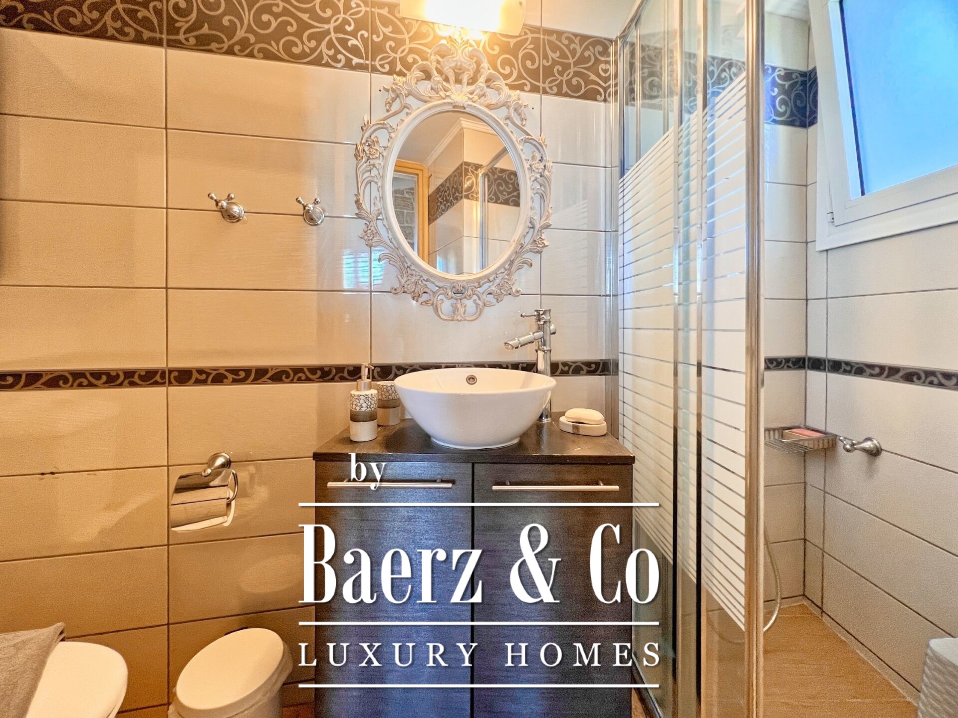 Natural light and carefully selected finishes elevate the atmosphere, while double glazing, sound insulation, autonomous heating with heat pump, air conditioning, and a solar water system address energy comfort throughout. Security measures include a security door, alarm, and cameras.