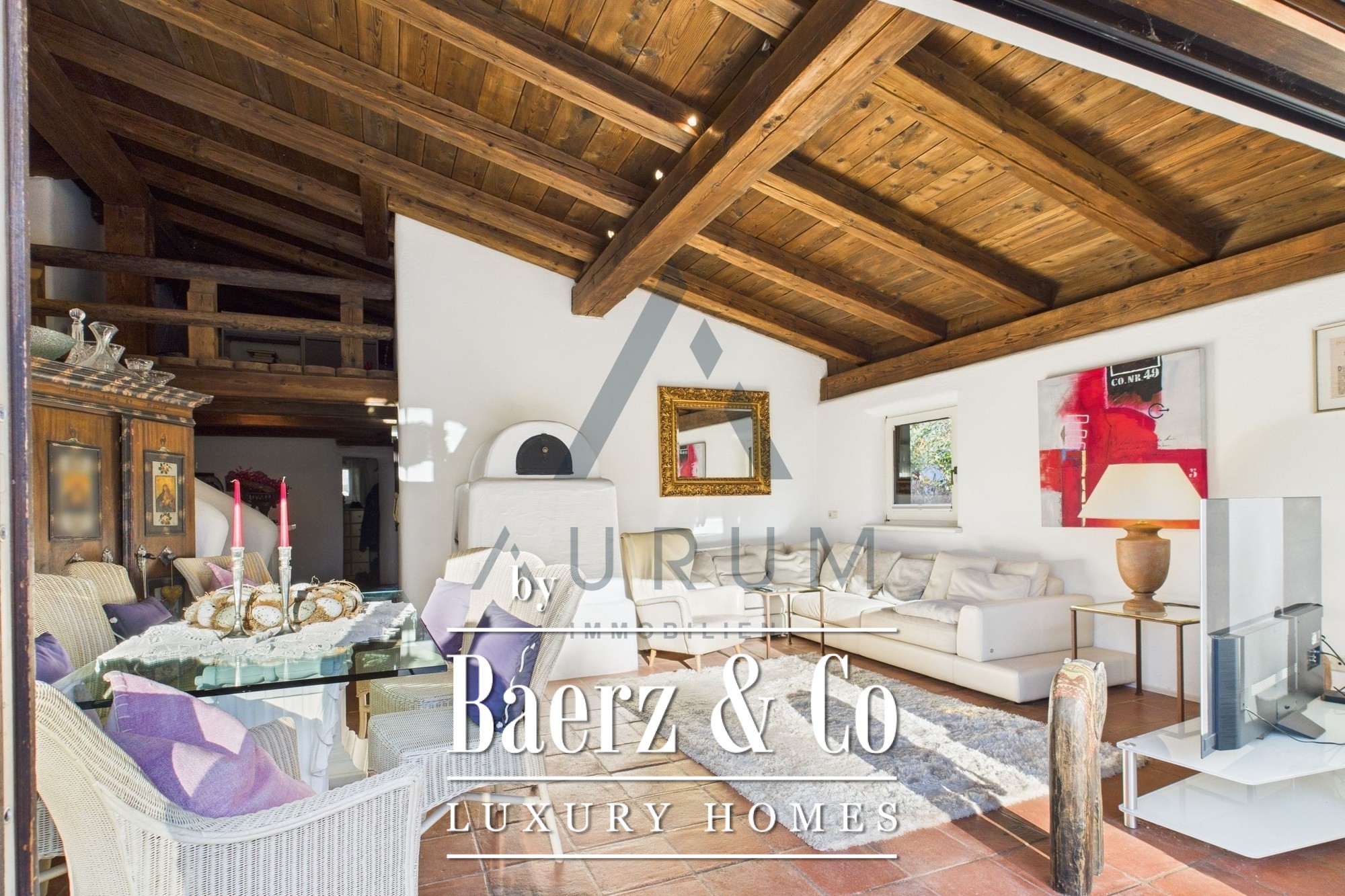 The heart of the house unfolds upstairs, where exposed roof beams, a tiled stove, and Italian floor tiles frame the 50 m² living room. Daylight moves through a large sliding door onto the southwest-facing terrace, connecting seamlessly to the meticulously kept garden. A traditional eat-in kitchen, complete with paneling, a dining area, additional oven, and pantry, creates space for convivial meals. This floor is completed by a bedroom, a dressing room, and a bathroom. Downstairs, two more bedrooms open directly to the garden, joined by a second bathroom with a bathtub.