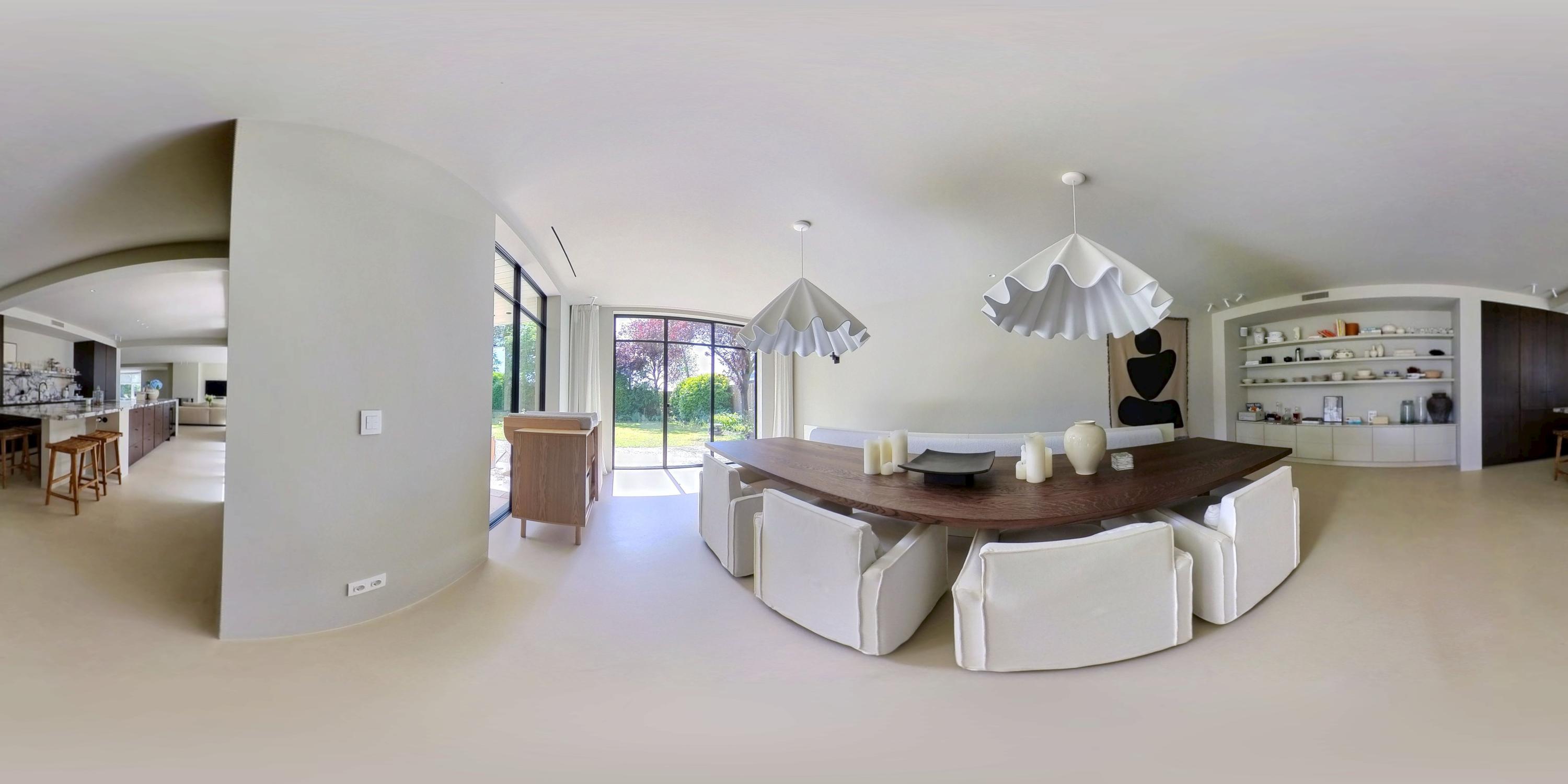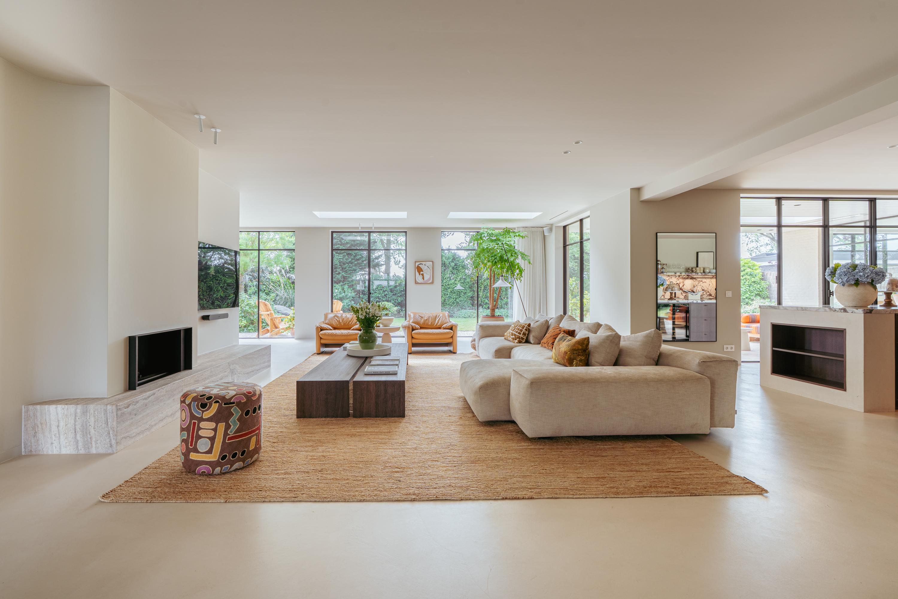 The expansive living room, featuring floor-to-ceiling windows and a stunning round bay window, is bathed in natural light, instantly creating a sense of space and tranquillity. The elegant fireplace forms a central feature of the open-plan living area, which flows seamlessly into the luxurious kitchen. The kitchen is equipped with high-end built-in appliances and modern conveniences, including a generous island of approx. 5 metres, Quooker tap, dishwasher, fridge/freezer combination, and an induction hob with integrated extractor. The exclusive book-matched marble worktop extends into the sink, giving the kitchen a refined and sophisticated finish. French steel doors open onto the delightful covered terrace and beautifully landscaped garden. Adjoining the kitchen is the spacious dining room.