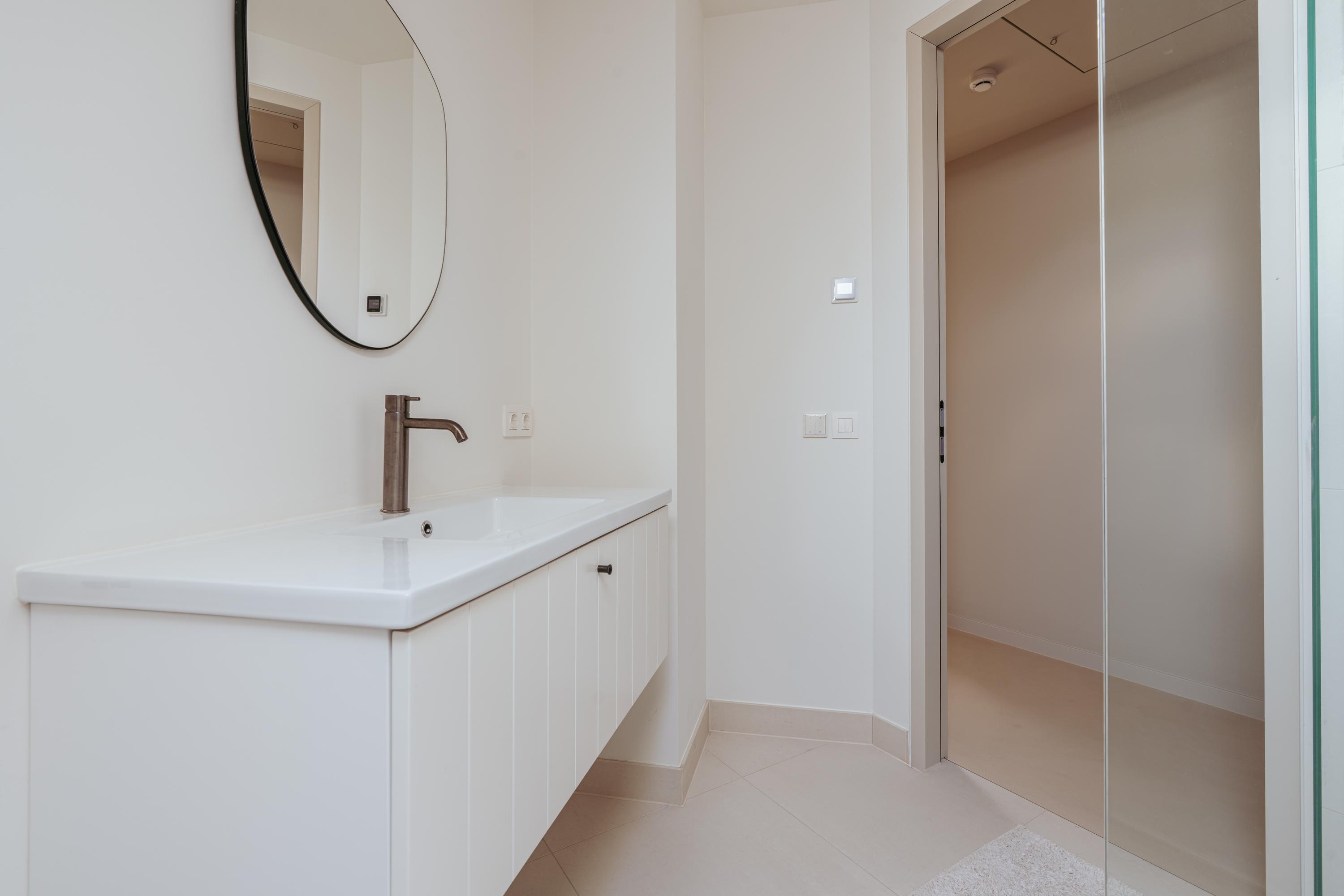 A staircase in the hallway leads to the first floor, where you will find three generously sized bedrooms. Thanks to their large dimensions, it would be simple to create a fourth or even fifth bedroom. The luxurious master bedroom features a freestanding bathtub, an en-suite bathroom, built-in wardrobes, and a spacious walk-in closet. The large bathroom is fitted with a double washbasin, walk-in shower, and WC. On the opposite side of the hallway, the second bathroom is also equipped with a walk-in shower, WC, and washbasin.