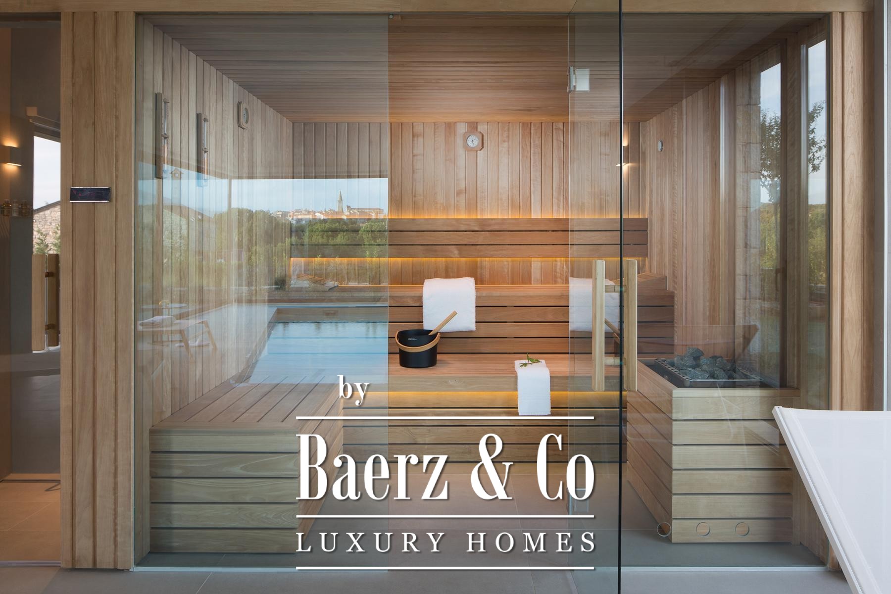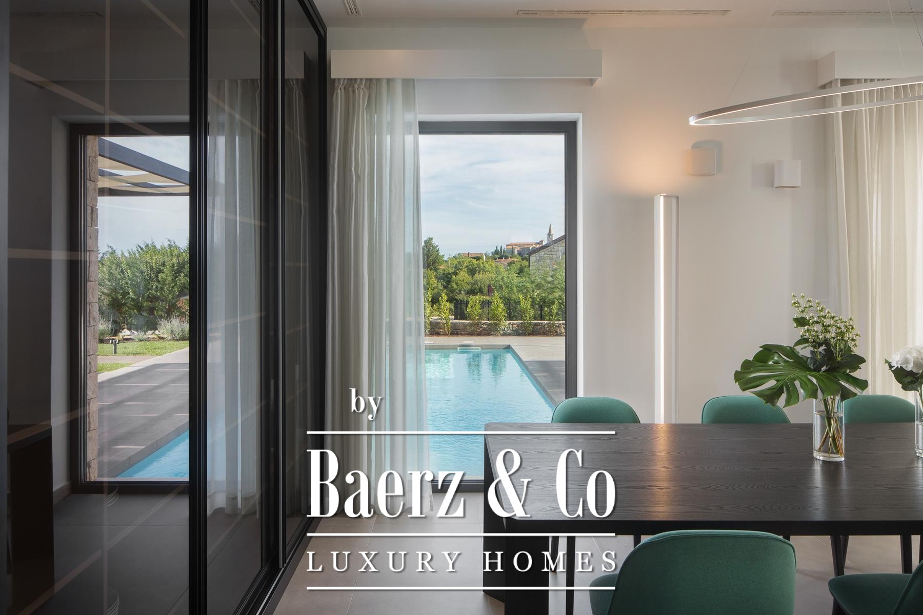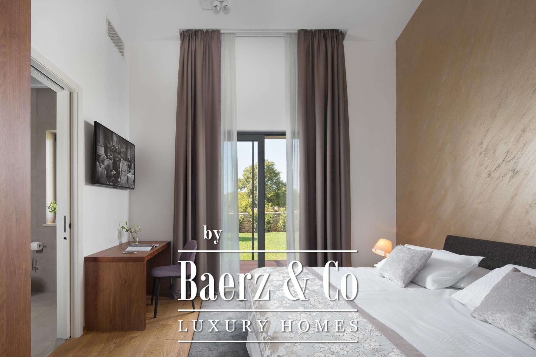 Each of the four bedrooms, ranging from 22 m² to 37 m², is paired with a private bathroom and king-size bed, while three rooms enjoy access to covered terraces. The wellness zone, measuring 61 m², includes an indoor heated pool with hydromassage, Finnish sauna, and panoramic views of Bale. Outdoors, residents benefit from a second pool, summer kitchen, barbecue area, and well-planned leisure spaces for private retreat or entertaining.