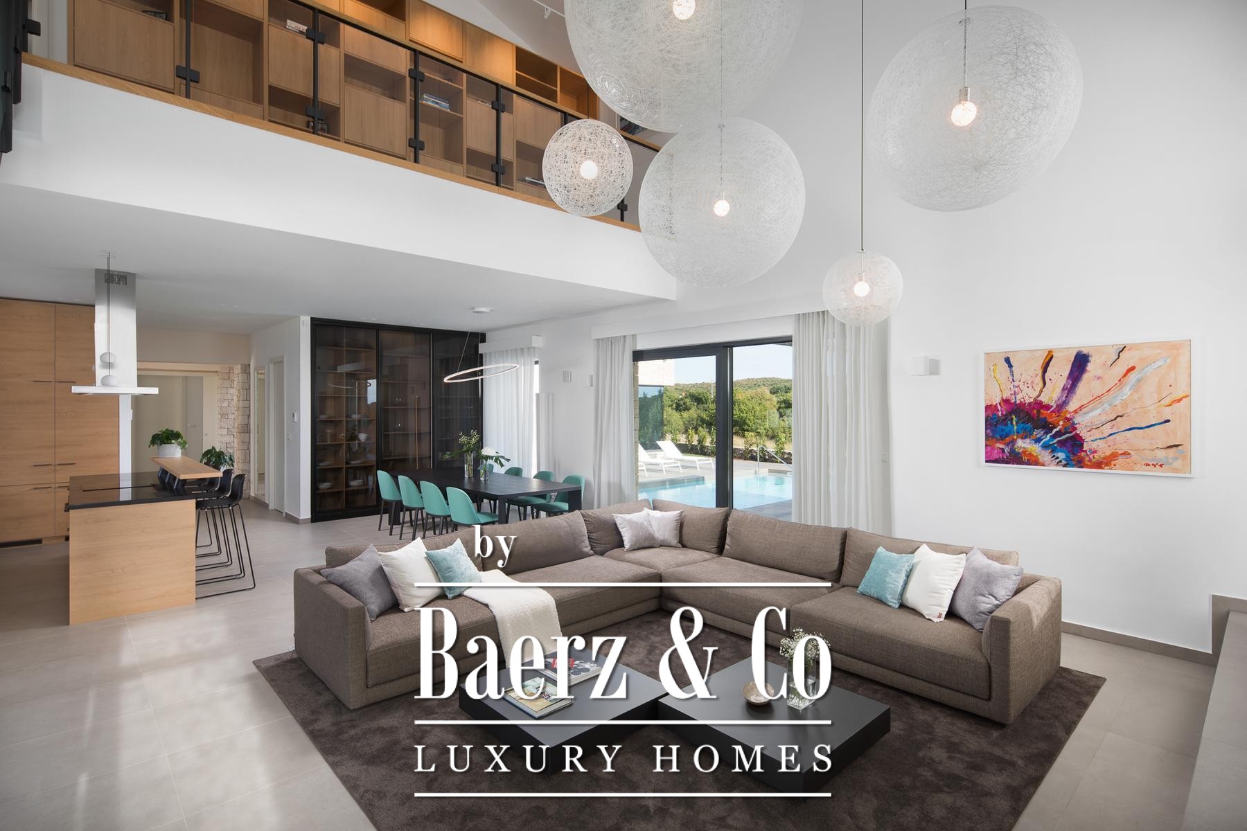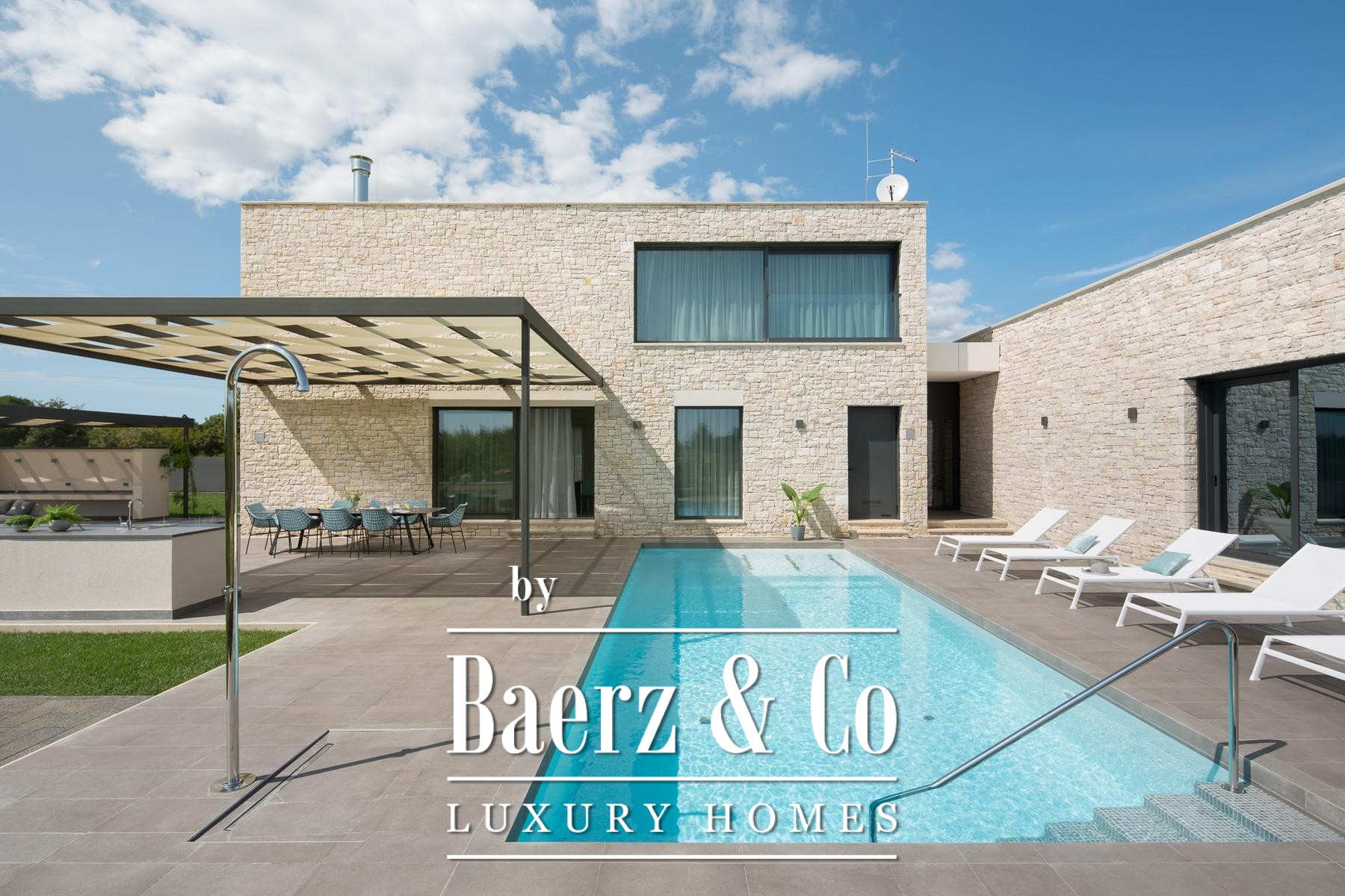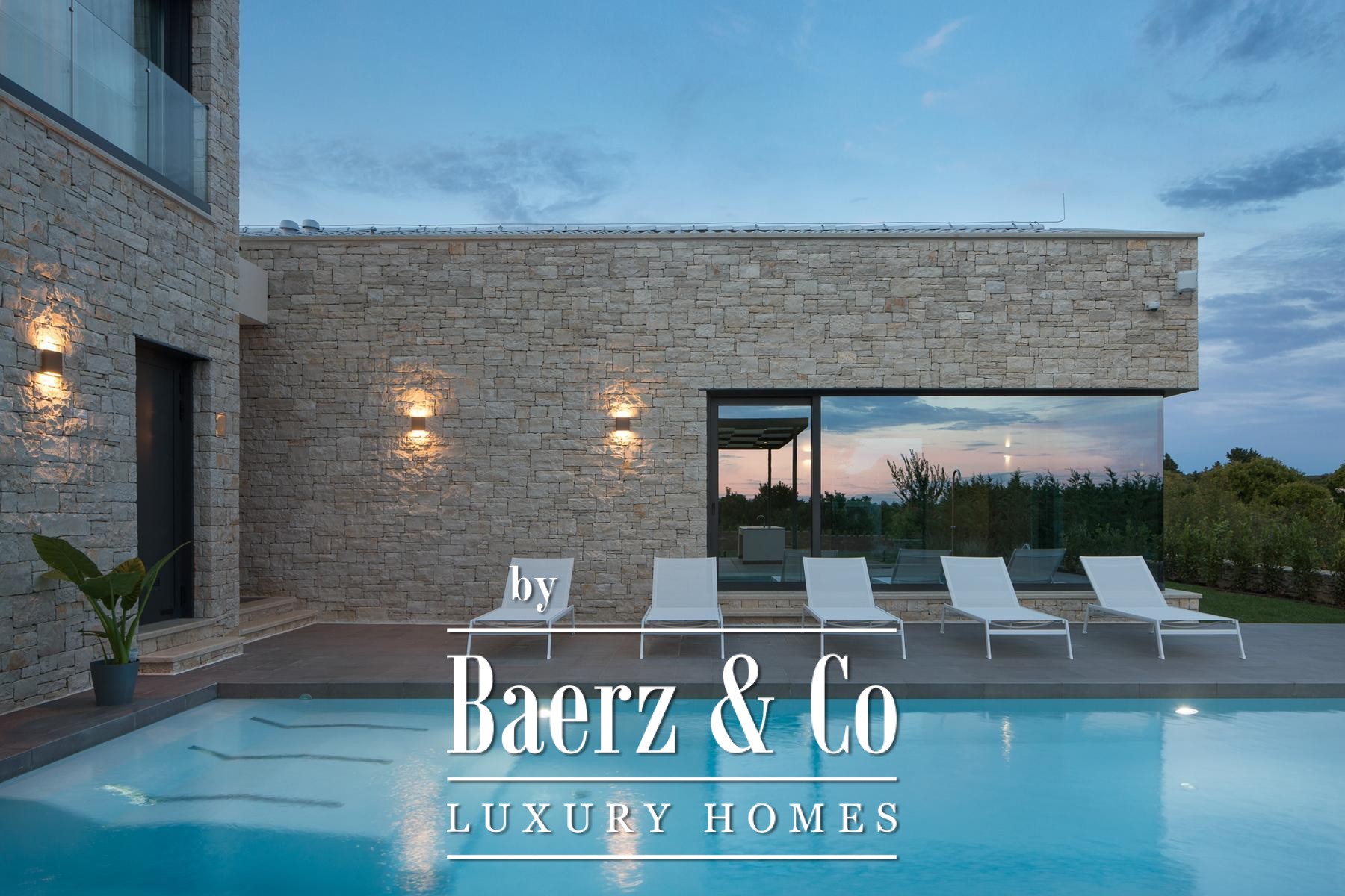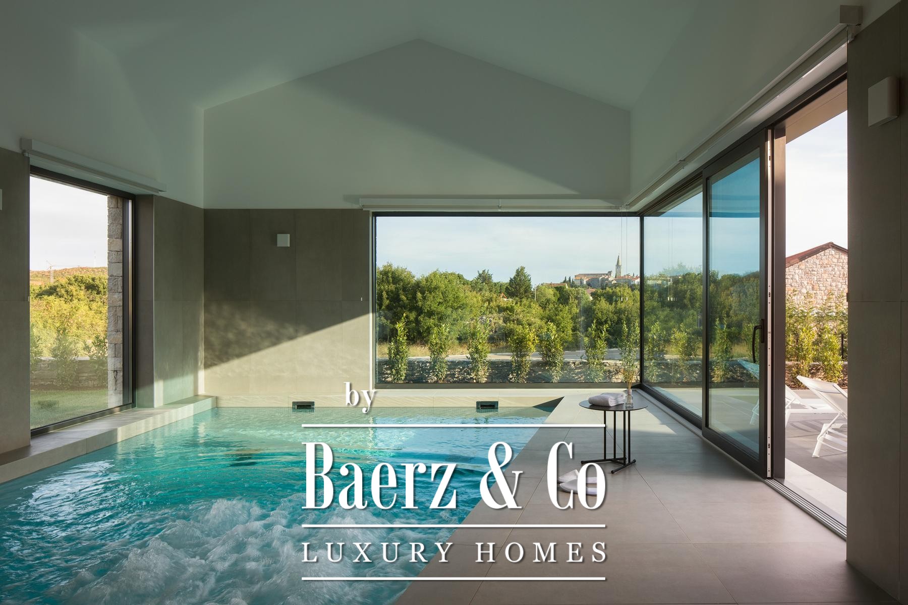 Each of the four bedrooms, ranging from 22 m² to 37 m², is paired with a private bathroom and king-size bed, while three rooms enjoy access to covered terraces. The wellness zone, measuring 61 m², includes an indoor heated pool with hydromassage, Finnish sauna, and panoramic views of Bale. Outdoors, residents benefit from a second pool, summer kitchen, barbecue area, and well-planned leisure spaces for private retreat or entertaining.