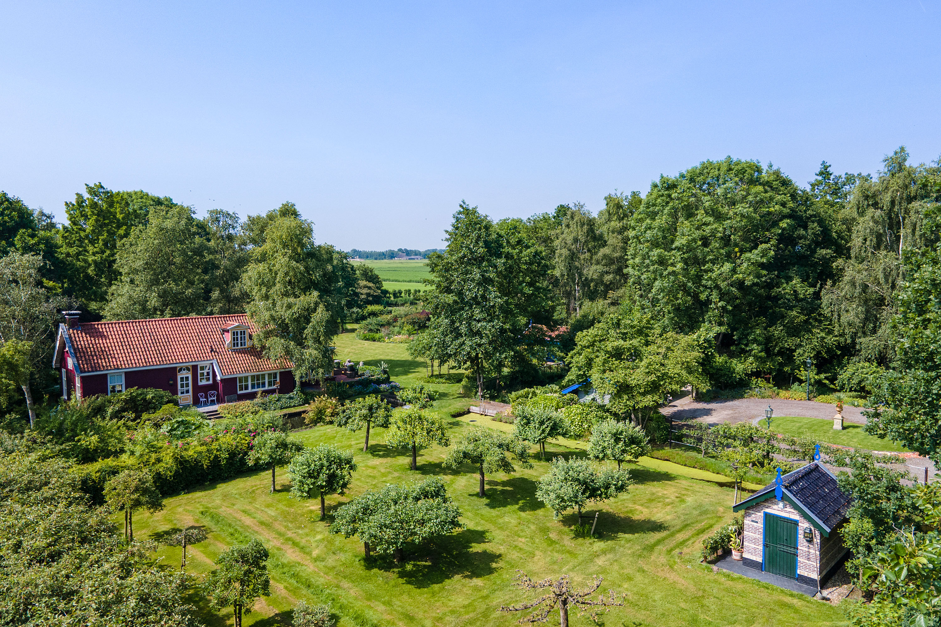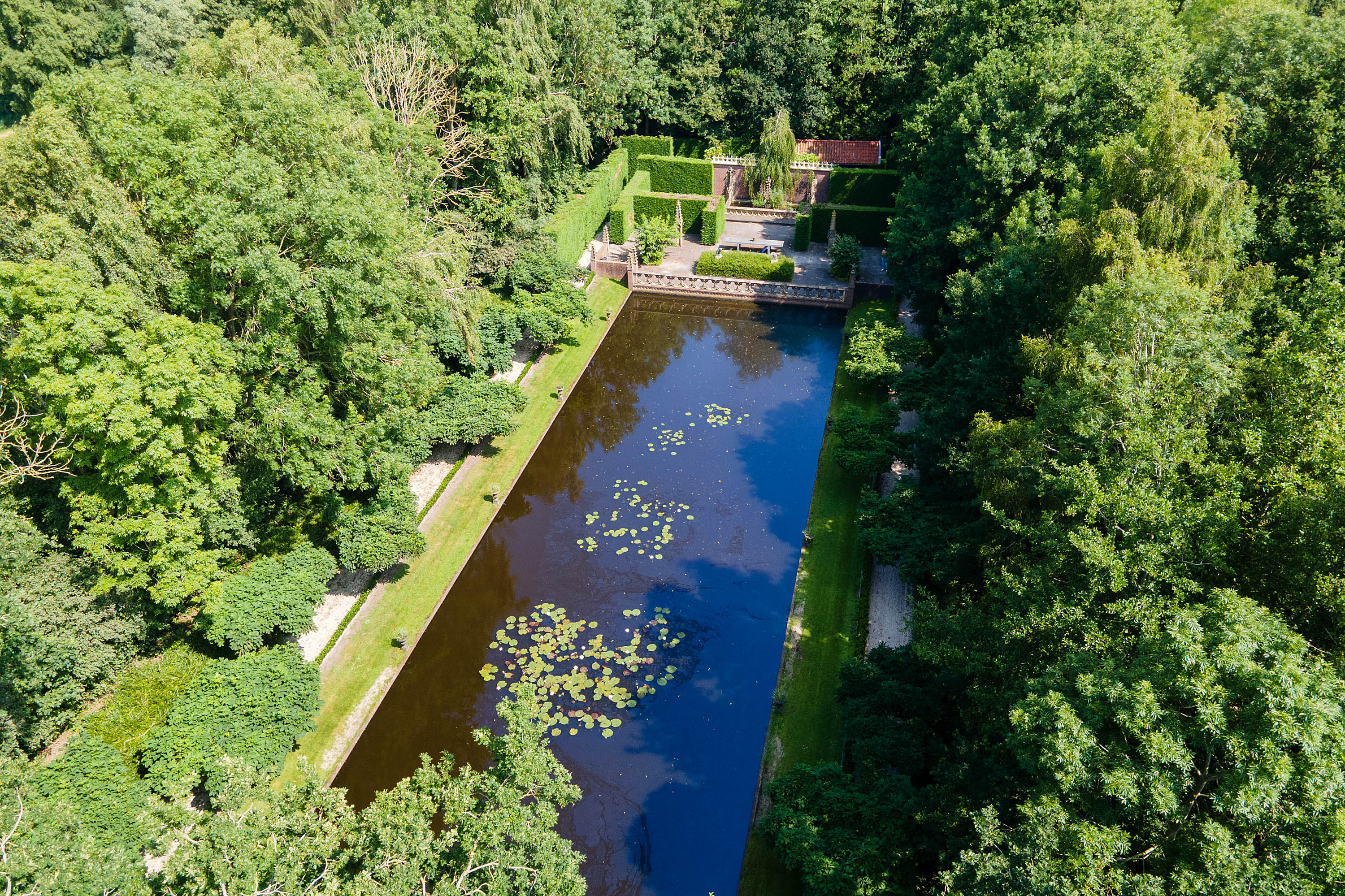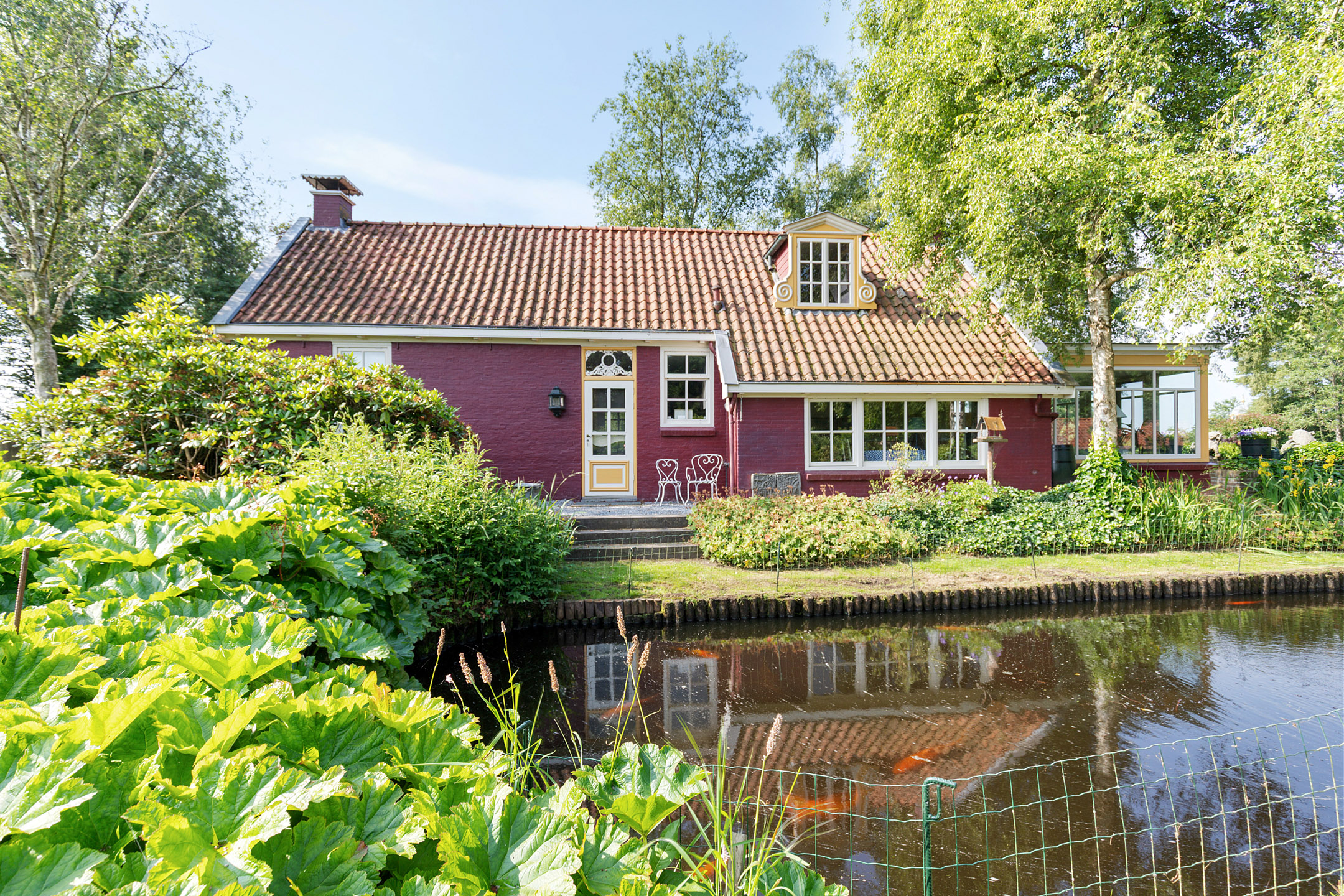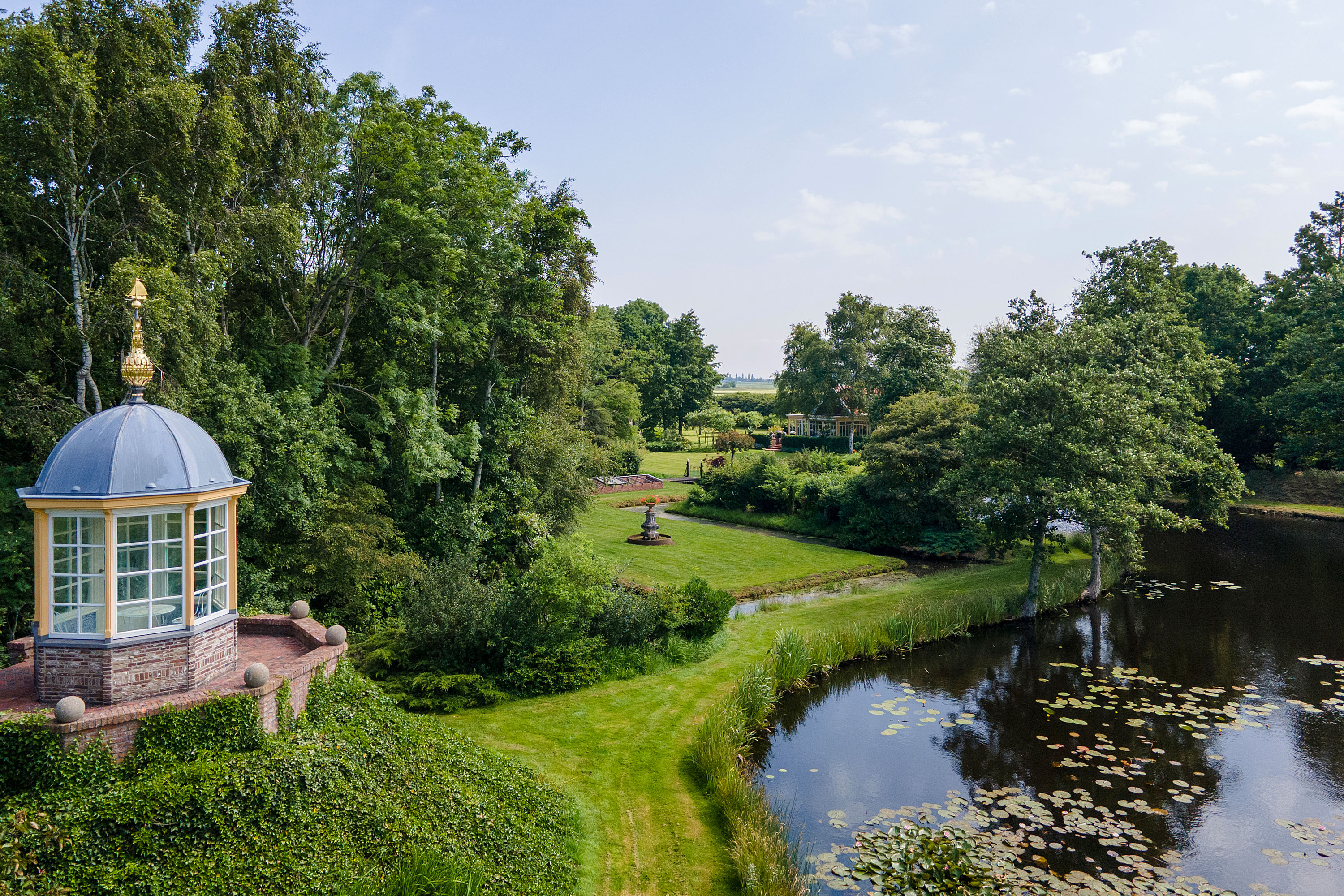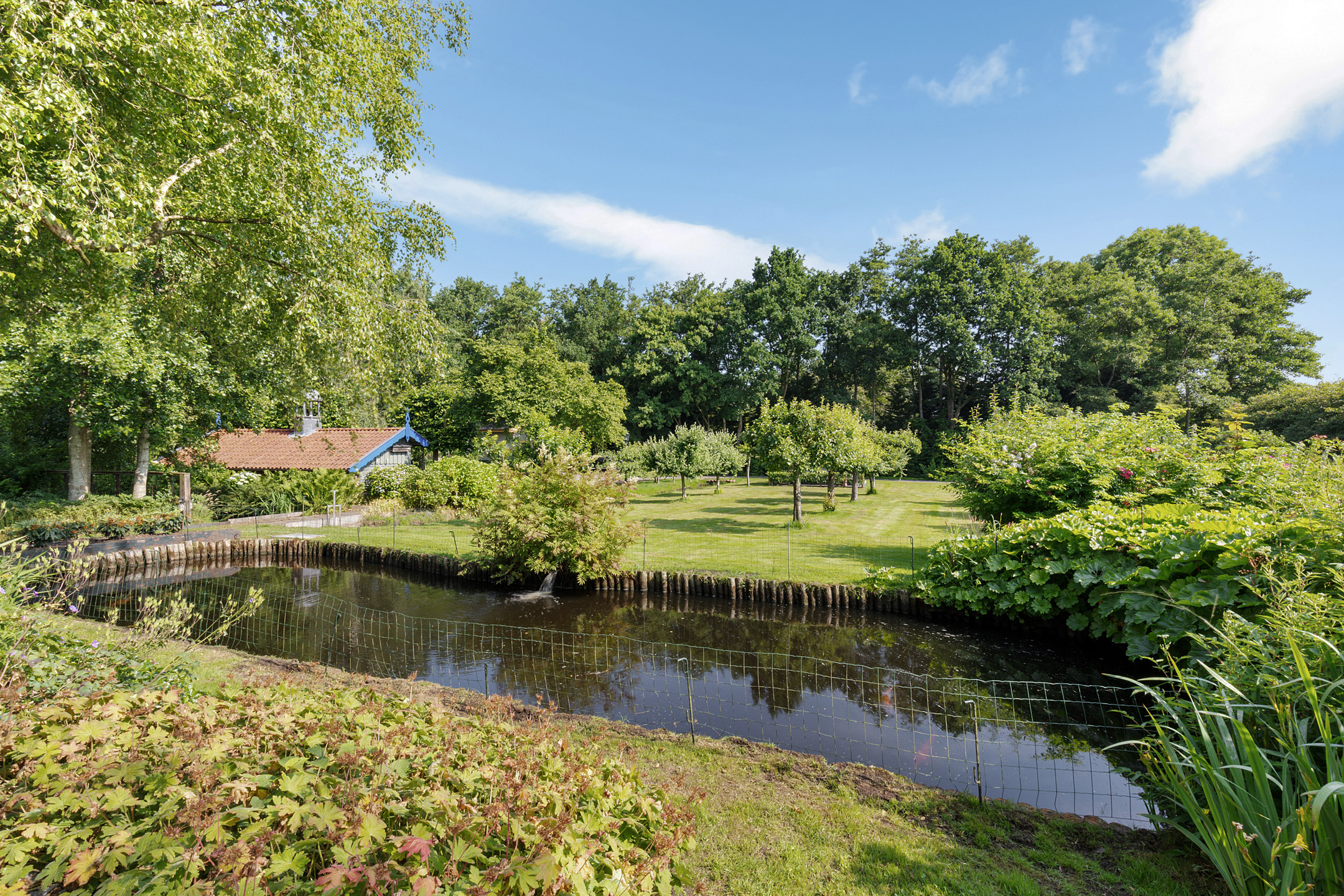 What began as a plot of approximately 1,600 m² has grown into a remarkable estate of approximately 3.18 hectares. The gardens were carefully designed to combine formal and natural elements, including two (swimming) ponds, multiple terraces, garden houses, a conservatory with vegetable garden, wooded areas, and expansive lawns.