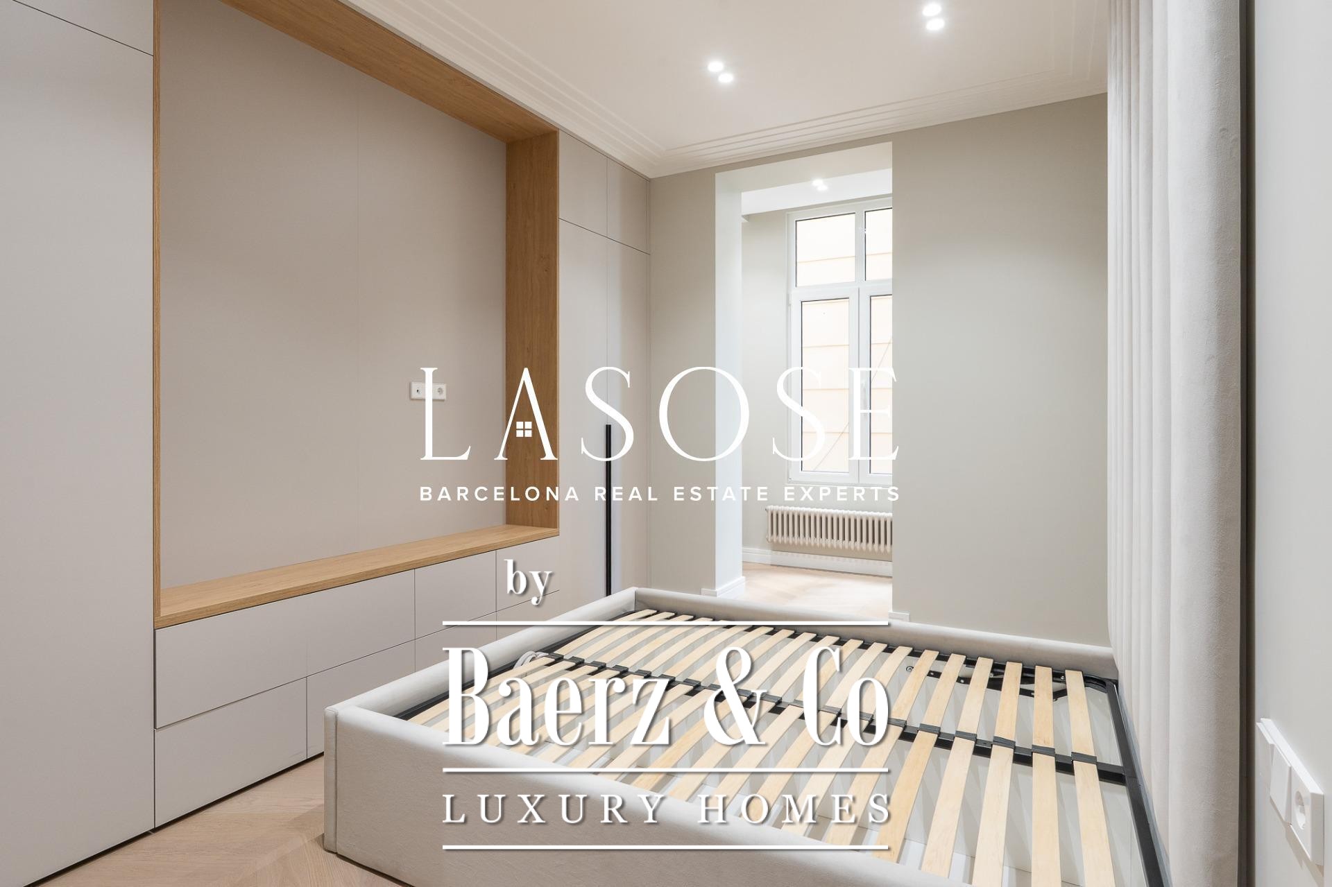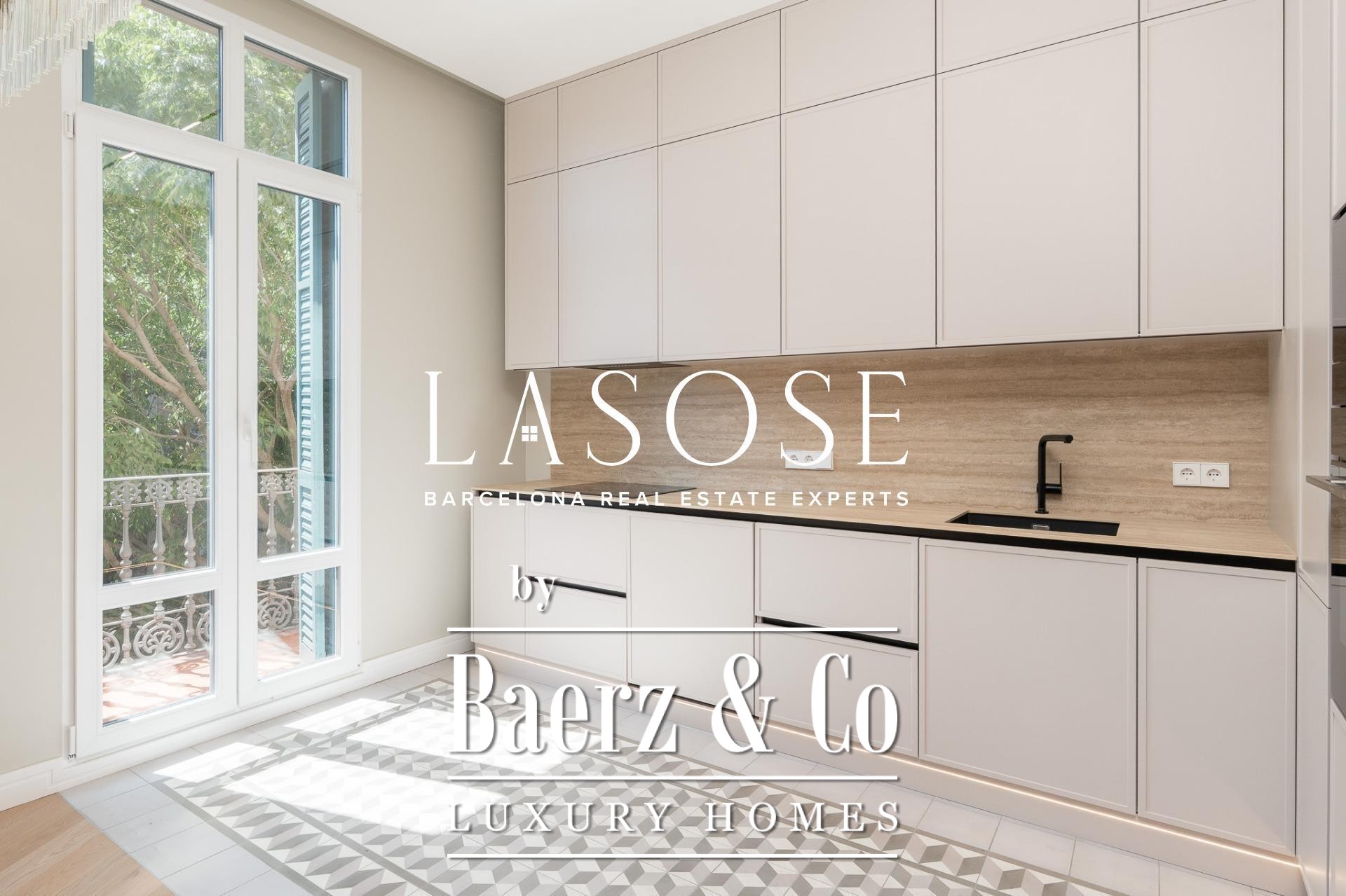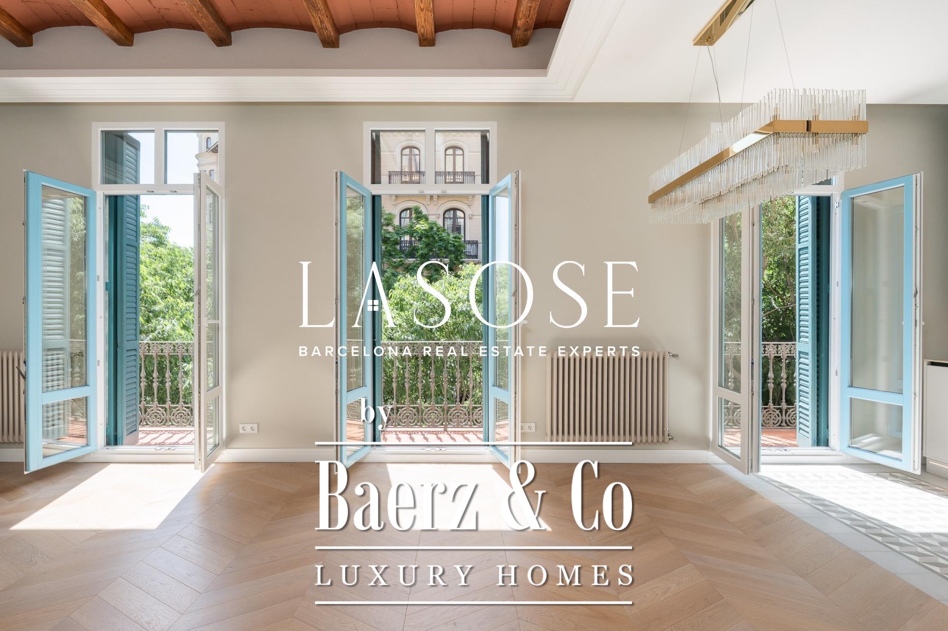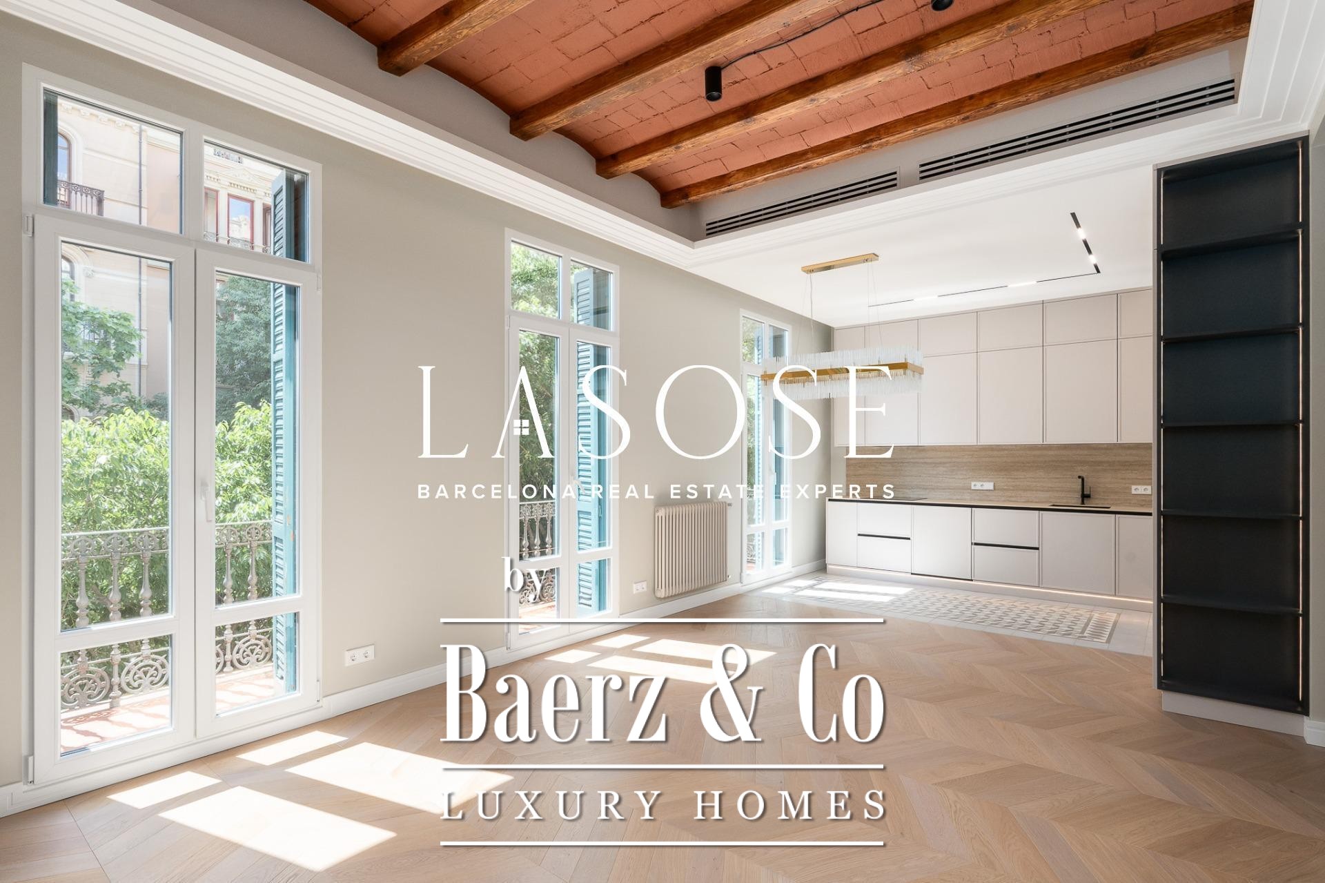 We present you a spectacular property in a regal estate dating back to 1910, located on a corner with privileged views of the Paseo de Sant Joan. This flat has been refurbished with an exquisite interior design project that combines the best of the original architecture with a modern and sophisticated design.. . With a built area of 124m2 distributed in a night area and a day area. We begin with the heart of this home; the spacious living-kitchen-dining room that opens onto three charming balconies, flooding the room with natural light. . . The kitchen is fully equipped with top of the range Bosch appliances and integrated furniture, ensuring functionality and style. The high ceilings, which reach 3.30 metres, boast an impressive vaulted ceiling with wooden beams in the living room area, giving a feeling of spaciousness and elegance like no other. Herringbone natural wood floors add warmth, while the original hydraulic flooring in the entrance and kitchen, along with porcelain finishes in the bathrooms, offer a touch of distinction and character.. . The property has 3 spacious bedrooms, including a suite that includes a dressing room, private bathroom and a comfortable desk area. It also has 2 complete bathrooms with designer showers, designed to