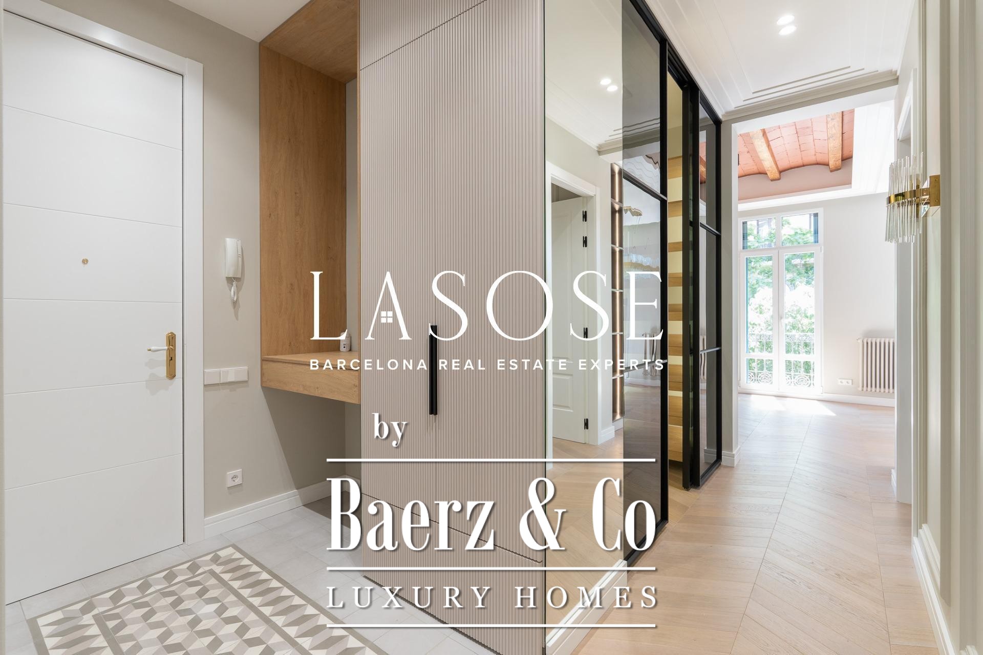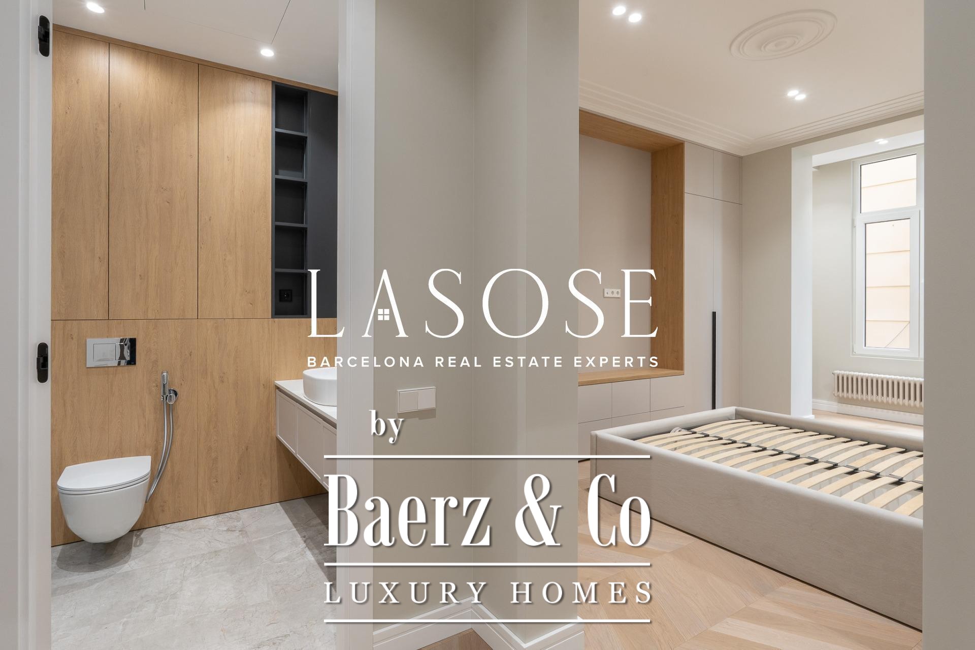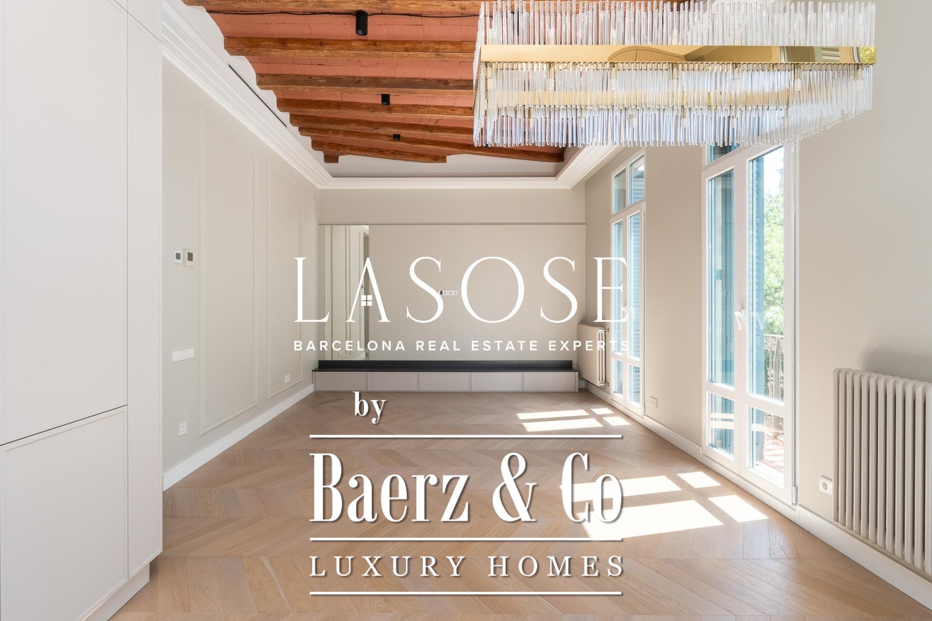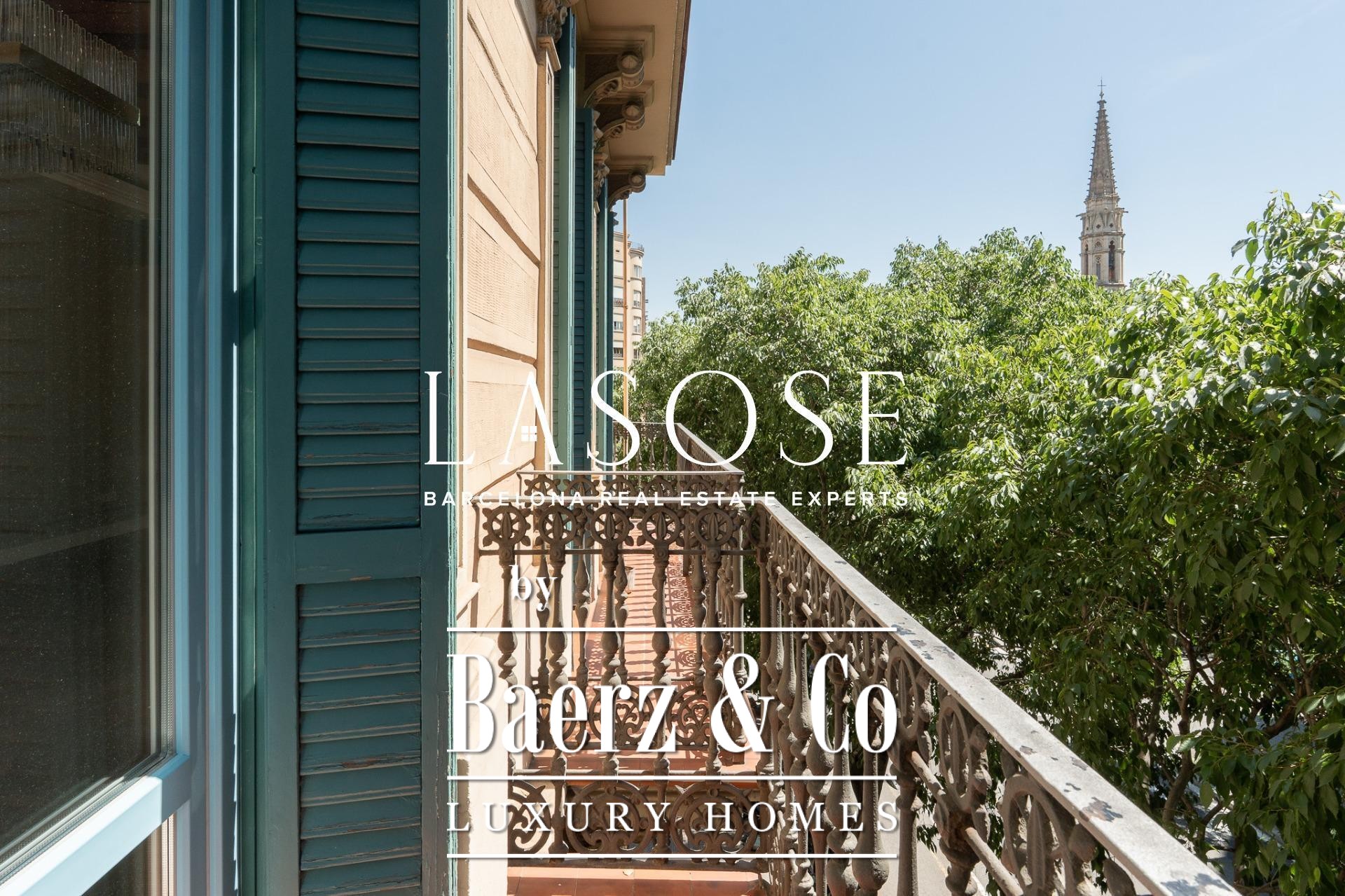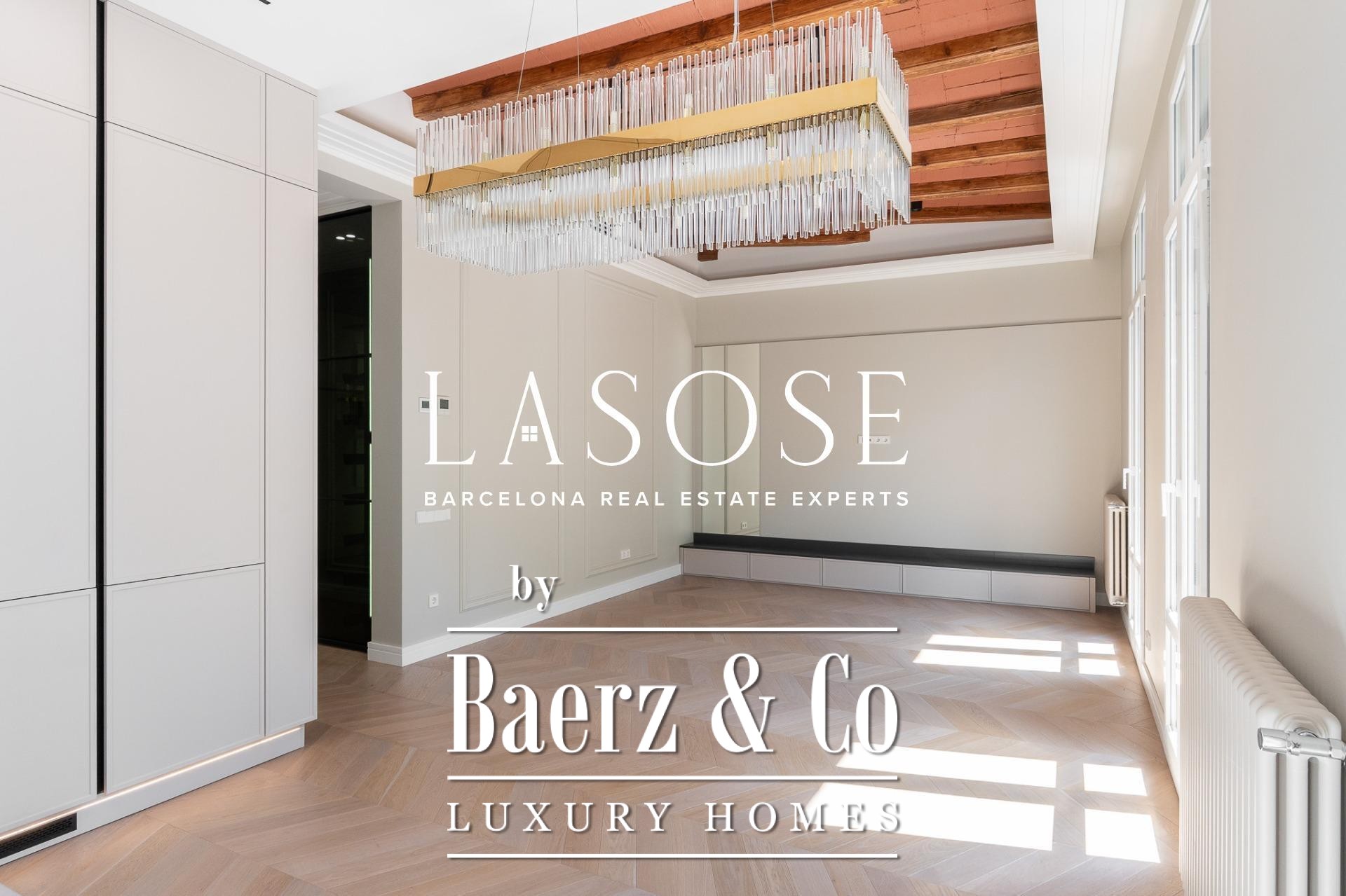 We present you a spectacular property in a regal estate dating back to 1910, located on a corner with privileged views of the Paseo de Sant Joan. This flat has been refurbished with an exquisite interior design project that combines the best of the original architecture with a modern and sophisticated design.. . With a built area of 124m2 distributed in a night area and a day area. We begin with the heart of this home; the spacious living-kitchen-dining room that opens onto three charming balconies, flooding the room with natural light. . . The kitchen is fully equipped with top of the range Bosch appliances and integrated furniture, ensuring functionality and style. The high ceilings, which reach 3.30 metres, boast an impressive vaulted ceiling with wooden beams in the living room area, giving a feeling of spaciousness and elegance like no other. Herringbone natural wood floors add warmth, while the original hydraulic flooring in the entrance and kitchen, along with porcelain finishes in the bathrooms, offer a touch of distinction and character.. . The property has 3 spacious bedrooms, including a suite that includes a dressing room, private bathroom and a comfortable desk area. It also has 2 complete bathrooms with designer showers, designed to