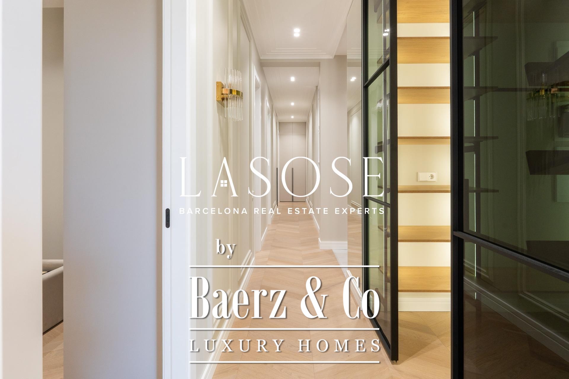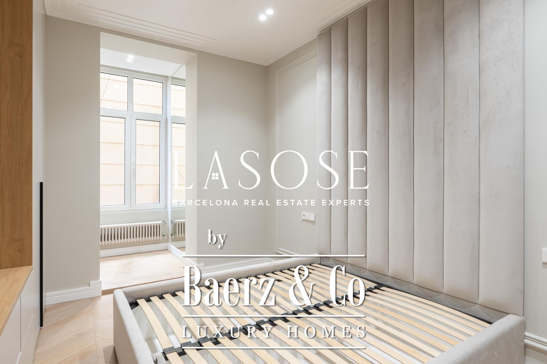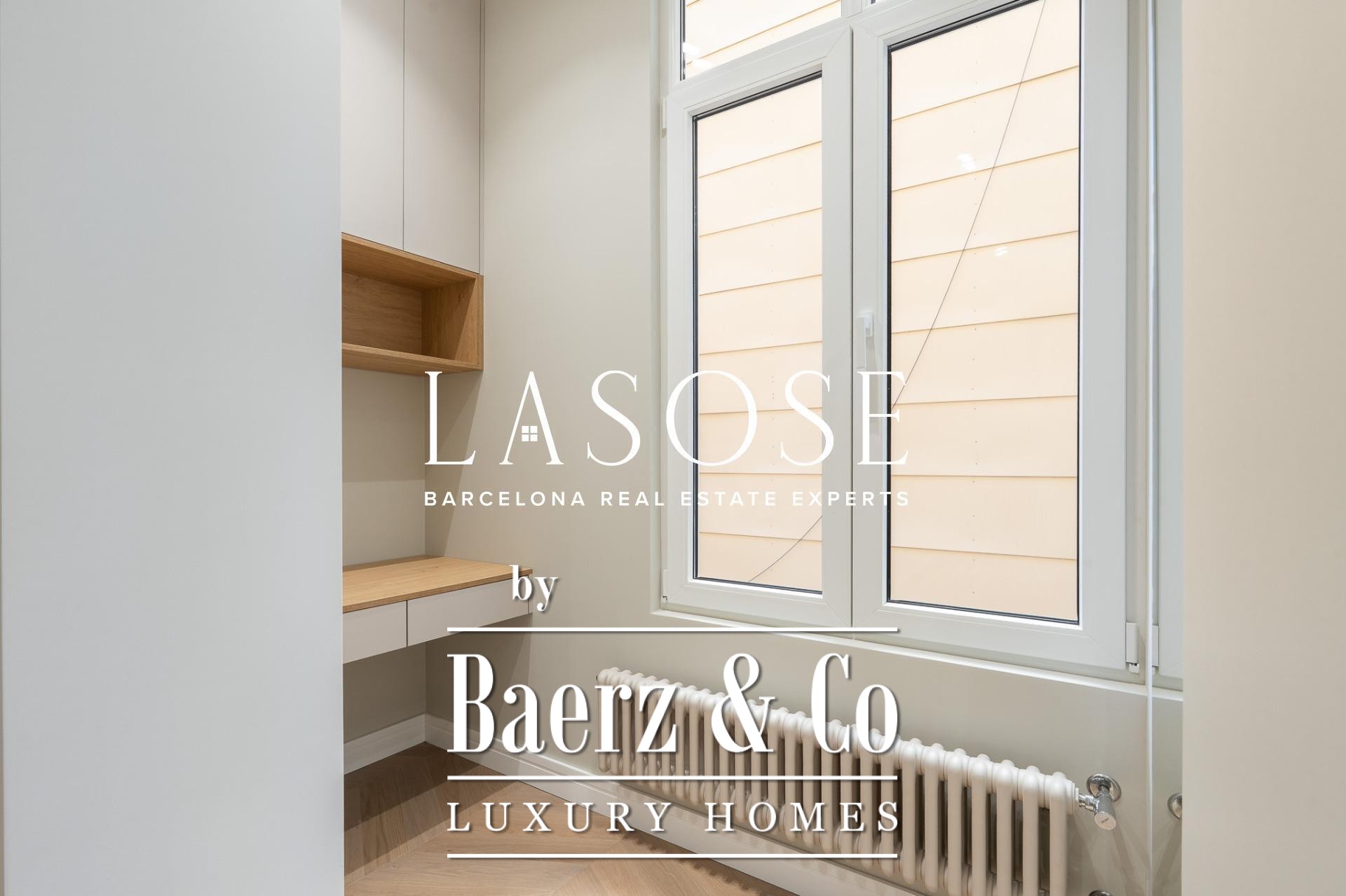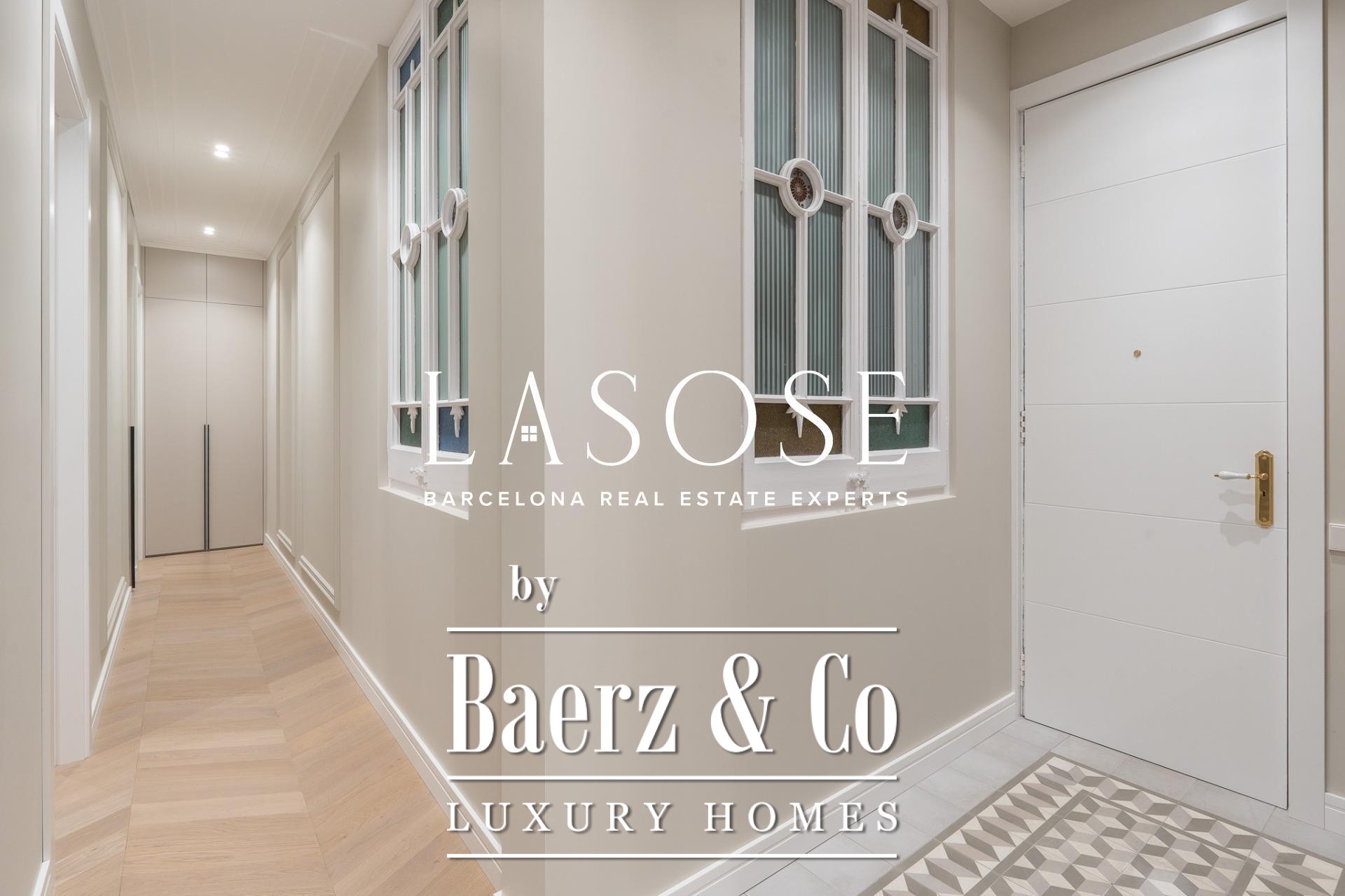 We present you a spectacular property in a regal estate dating back to 1910, located on a corner with privileged views of the Paseo de Sant Joan. This flat has been refurbished with an exquisite interior design project that combines the best of the original architecture with a modern and sophisticated design.. . With a built area of 124m2 distributed in a night area and a day area. We begin with the heart of this home; the spacious living-kitchen-dining room that opens onto three charming balconies, flooding the room with natural light. . . The kitchen is fully equipped with top of the range Bosch appliances and integrated furniture, ensuring functionality and style. The high ceilings, which reach 3.30 metres, boast an impressive vaulted ceiling with wooden beams in the living room area, giving a feeling of spaciousness and elegance like no other. Herringbone natural wood floors add warmth, while the original hydraulic flooring in the entrance and kitchen, along with porcelain finishes in the bathrooms, offer a touch of distinction and character.. . The property has 3 spacious bedrooms, including a suite that includes a dressing room, private bathroom and a comfortable desk area. It also has 2 complete bathrooms with designer showers, designed to