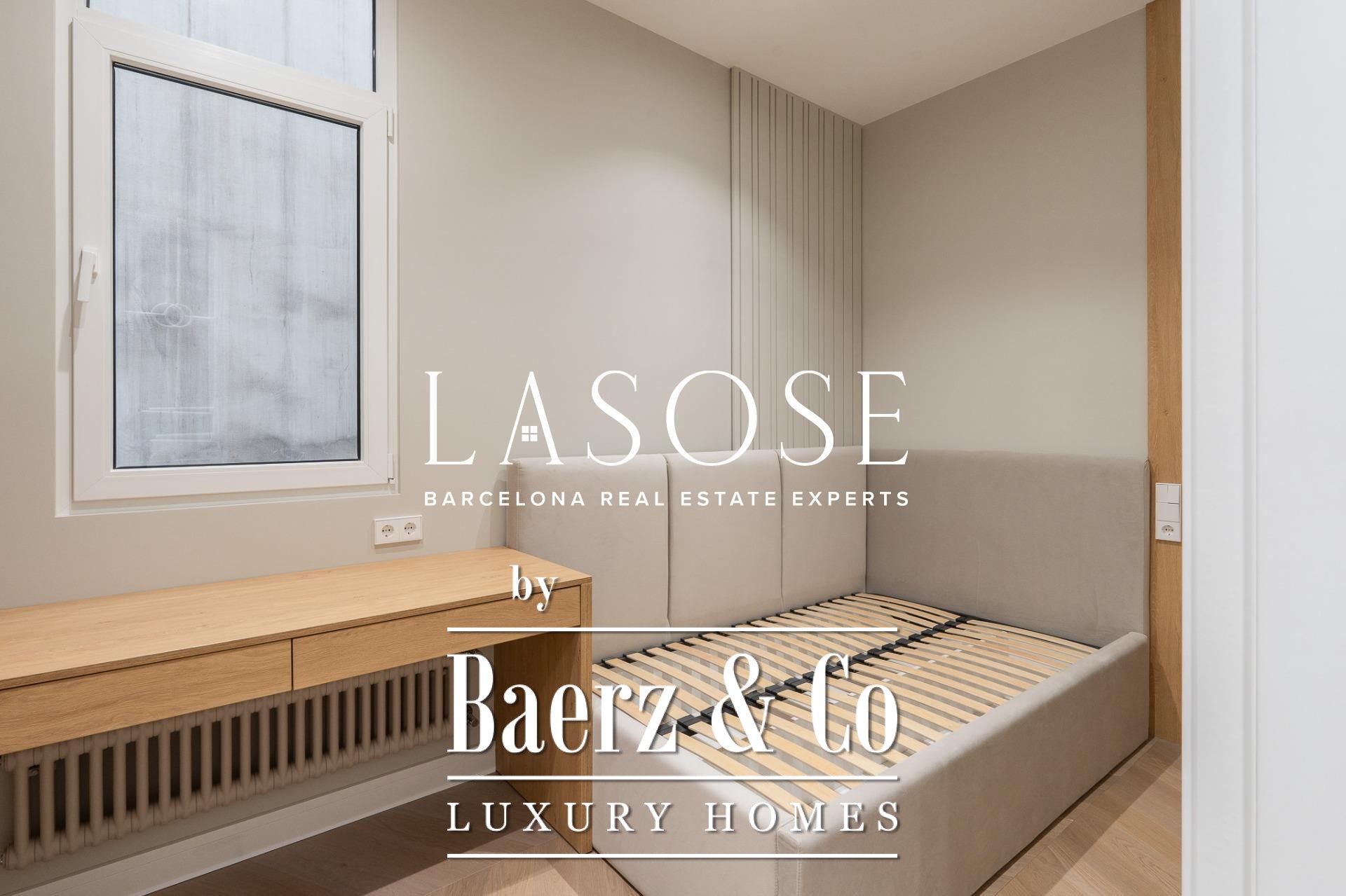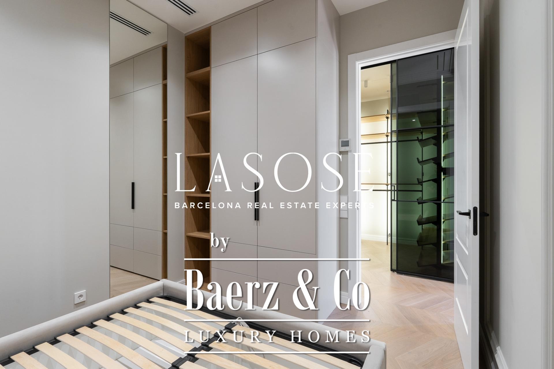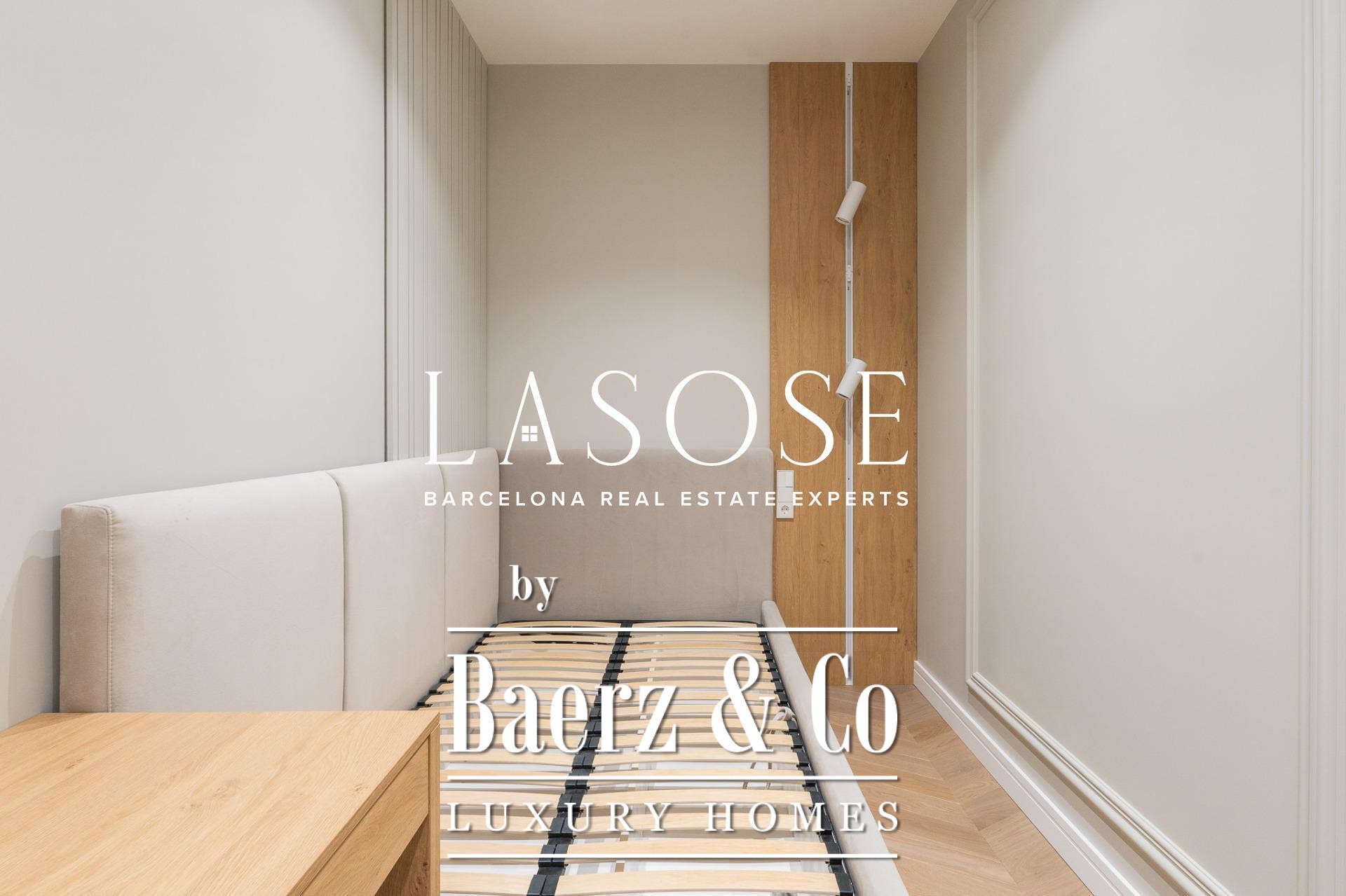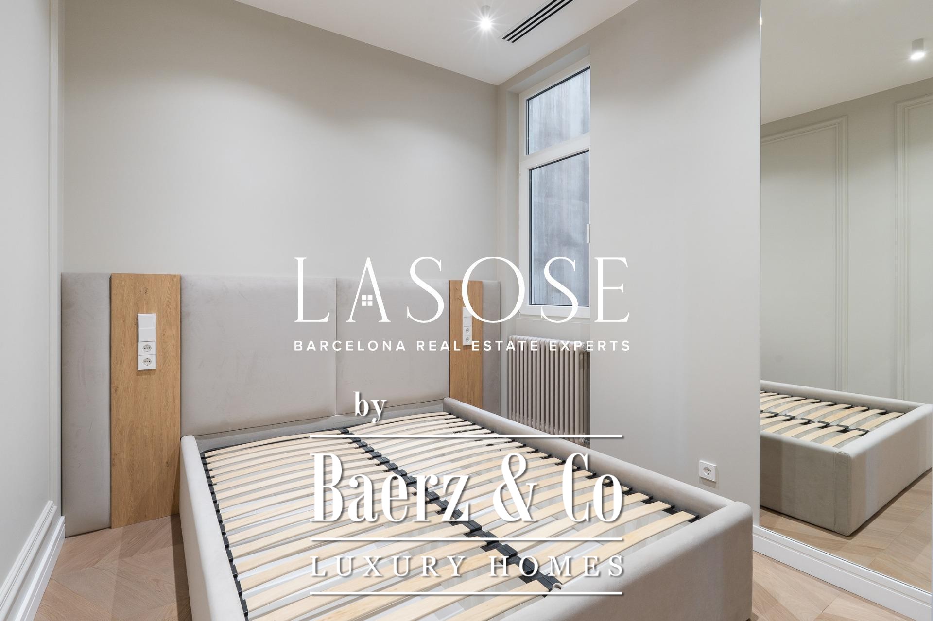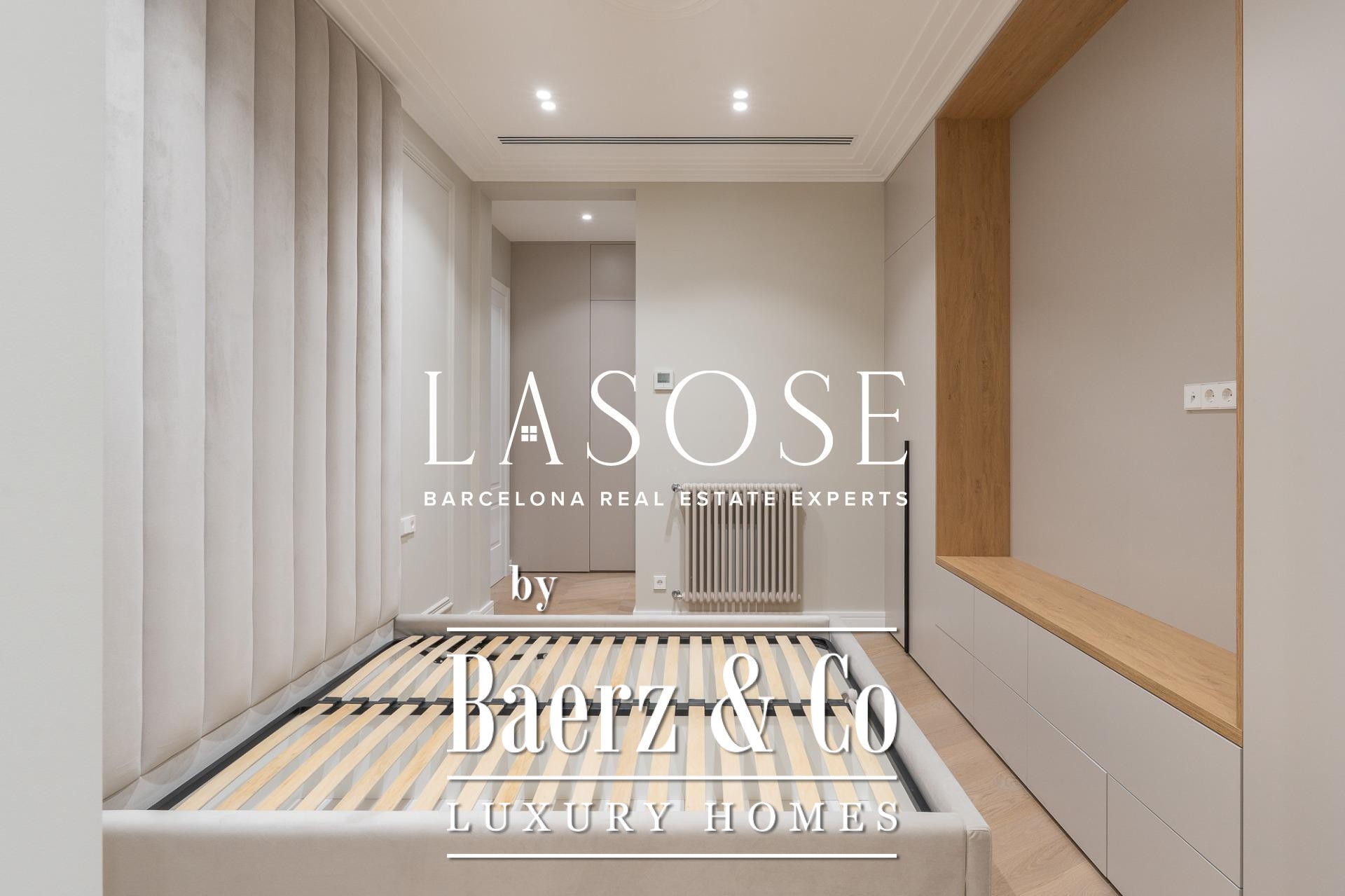 We present you a spectacular property in a regal estate dating back to 1910, located on a corner with privileged views of the Paseo de Sant Joan. This flat has been refurbished with an exquisite interior design project that combines the best of the original architecture with a modern and sophisticated design.. . With a built area of 124m2 distributed in a night area and a day area. We begin with the heart of this home; the spacious living-kitchen-dining room that opens onto three charming balconies, flooding the room with natural light. . . The kitchen is fully equipped with top of the range Bosch appliances and integrated furniture, ensuring functionality and style. The high ceilings, which reach 3.30 metres, boast an impressive vaulted ceiling with wooden beams in the living room area, giving a feeling of spaciousness and elegance like no other. Herringbone natural wood floors add warmth, while the original hydraulic flooring in the entrance and kitchen, along with porcelain finishes in the bathrooms, offer a touch of distinction and character.. . The property has 3 spacious bedrooms, including a suite that includes a dressing room, private bathroom and a comfortable desk area. It also has 2 complete bathrooms with designer showers, designed to