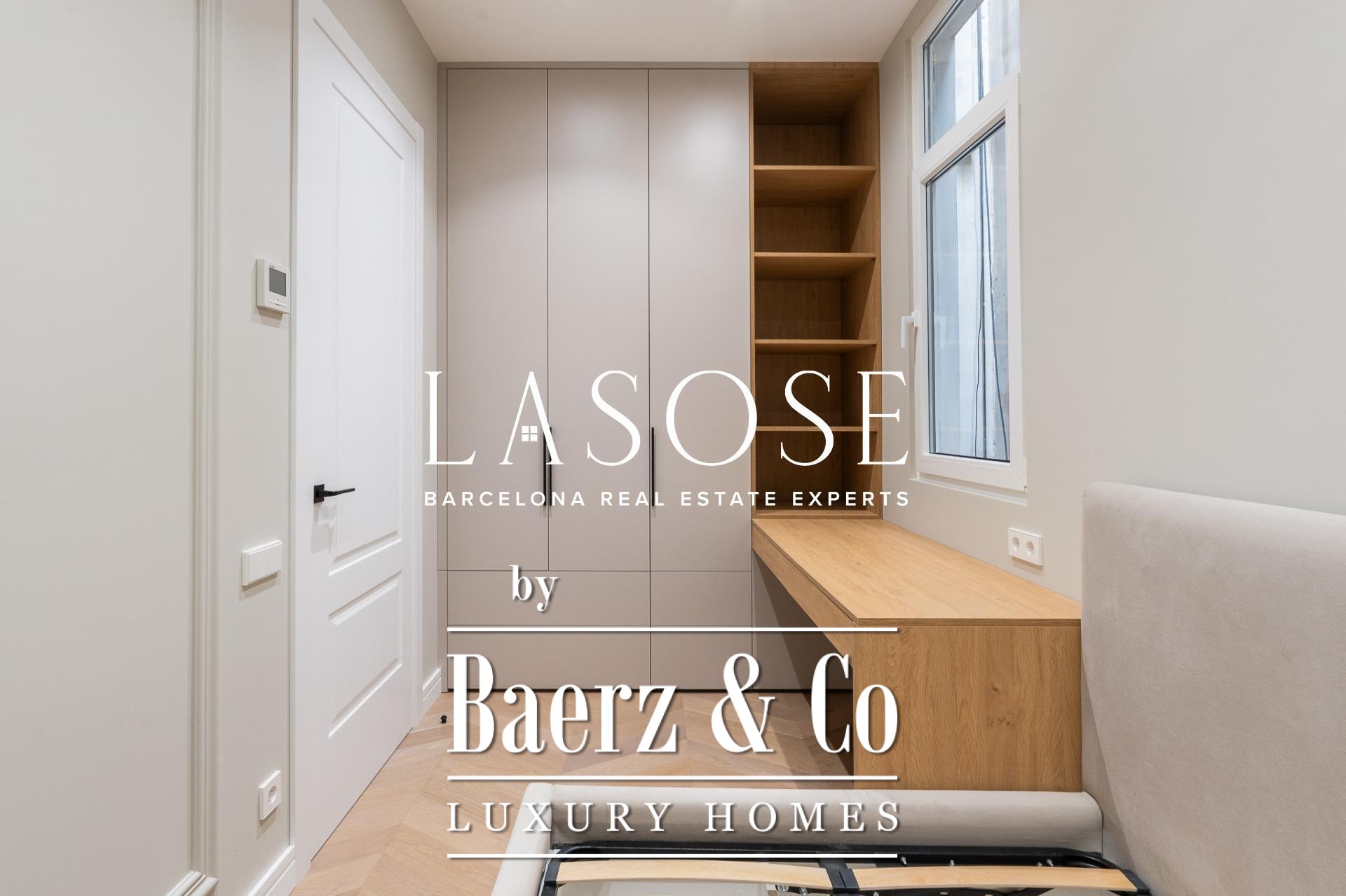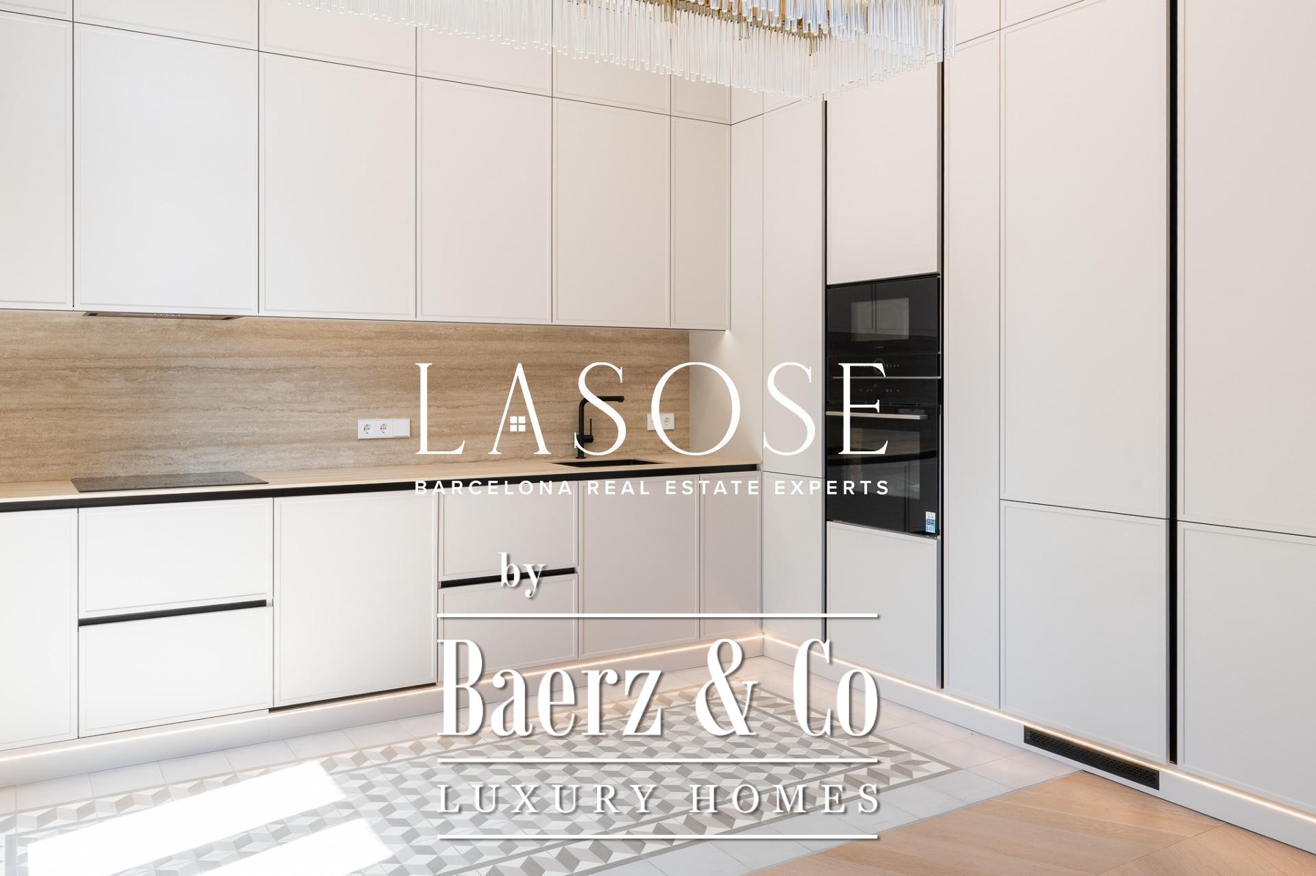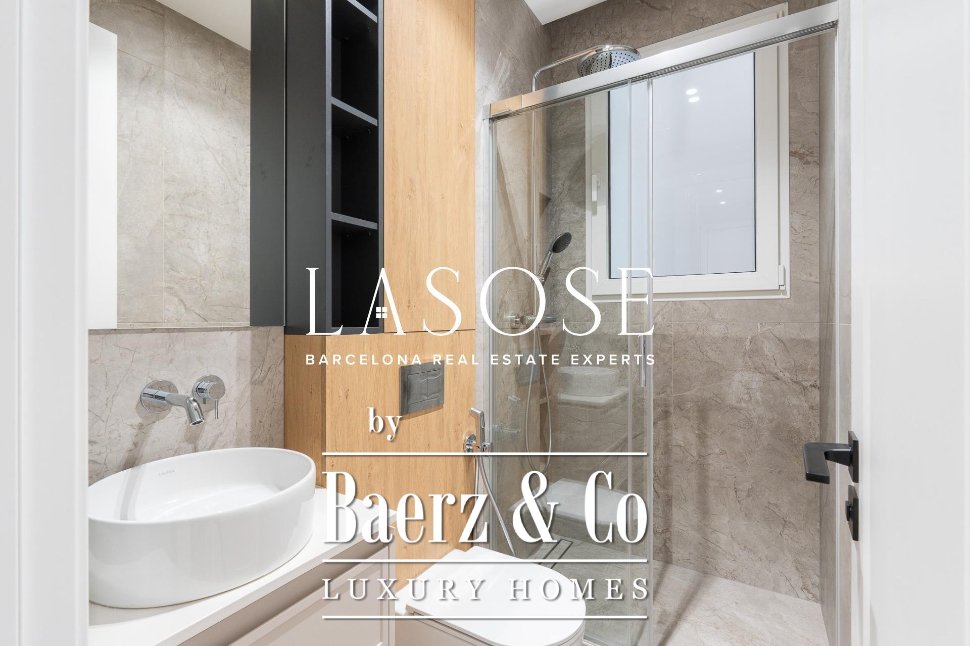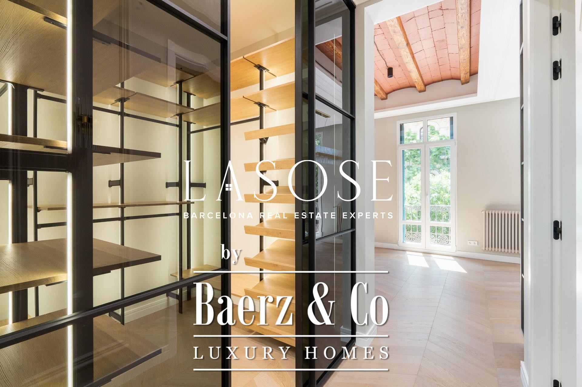 We present you a spectacular property in a regal estate dating back to 1910, located on a corner with privileged views of the Paseo de Sant Joan. This flat has been refurbished with an exquisite interior design project that combines the best of the original architecture with a modern and sophisticated design.. . With a built area of 124m2 distributed in a night area and a day area. We begin with the heart of this home; the spacious living-kitchen-dining room that opens onto three charming balconies, flooding the room with natural light. . . The kitchen is fully equipped with top of the range Bosch appliances and integrated furniture, ensuring functionality and style. The high ceilings, which reach 3.30 metres, boast an impressive vaulted ceiling with wooden beams in the living room area, giving a feeling of spaciousness and elegance like no other. Herringbone natural wood floors add warmth, while the original hydraulic flooring in the entrance and kitchen, along with porcelain finishes in the bathrooms, offer a touch of distinction and character.. . The property has 3 spacious bedrooms, including a suite that includes a dressing room, private bathroom and a comfortable desk area. It also has 2 complete bathrooms with designer showers, designed to