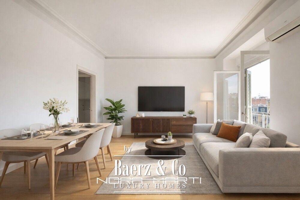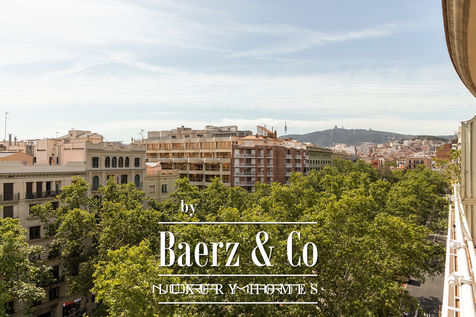 Apartment Barcelona is offered in the heart of the city’s most sought-after promenade, where Passeig de Sant Joan meets the distinctive atmosphere of Gràcia. This 90 m² apartment on the sixth floor enjoys expansive light, carrying the warmth of the midday sun and an enveloping calm through the afternoon. The living-dining room, oriented towards a 10 m² terrace, invites both city and Mediterranean sea views that stretch toward Tibidabo, with the terrace providing an ideal setting for quiet rituals or convivial gatherings.