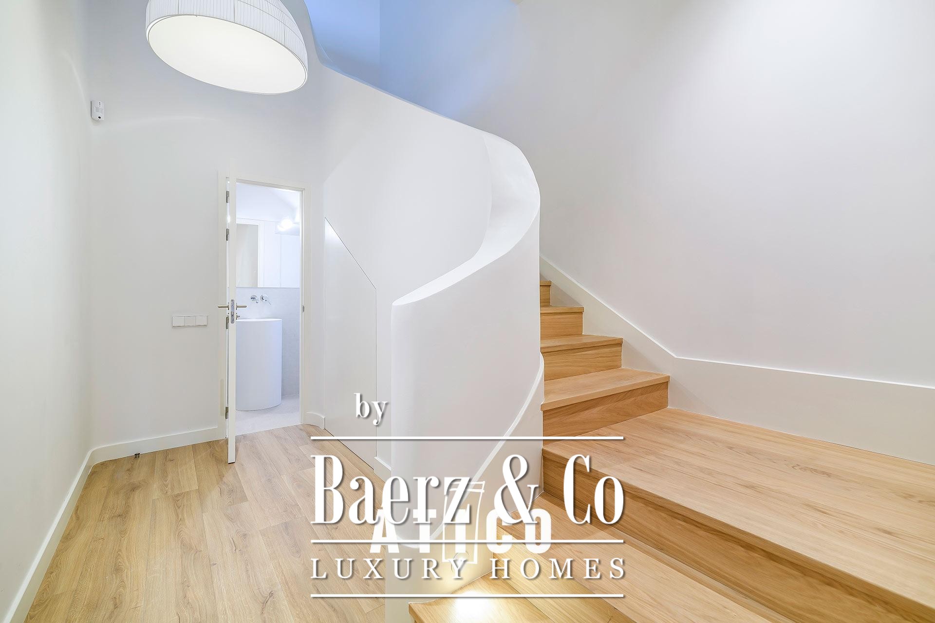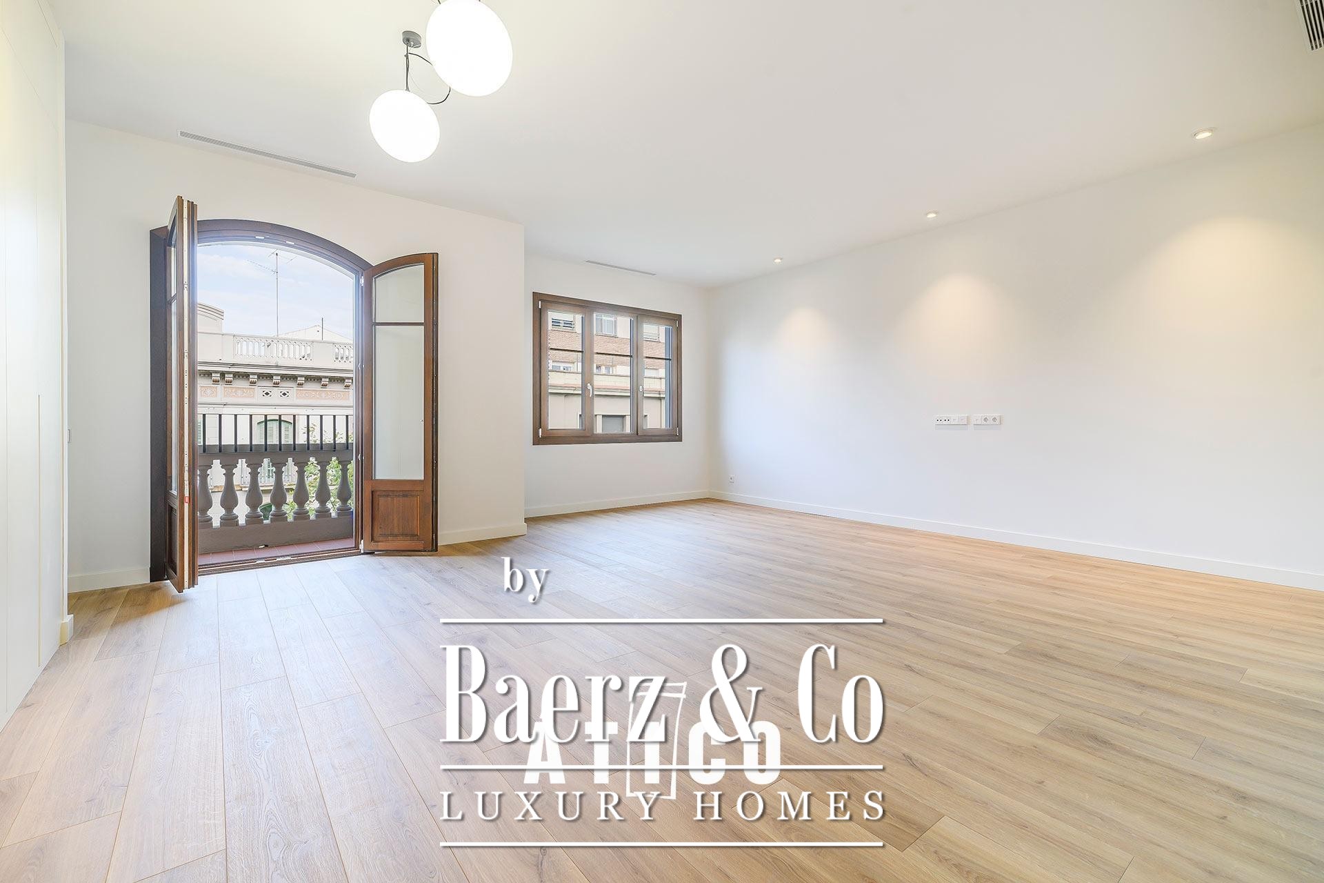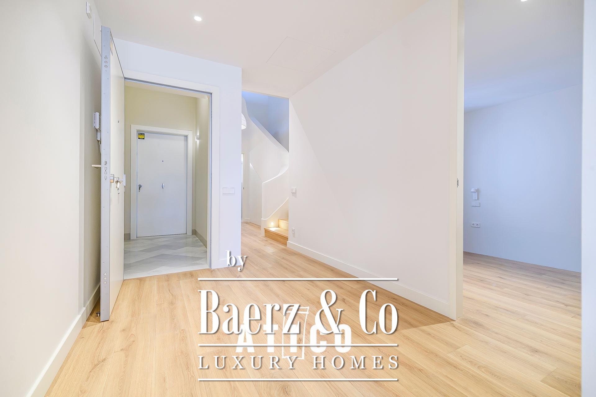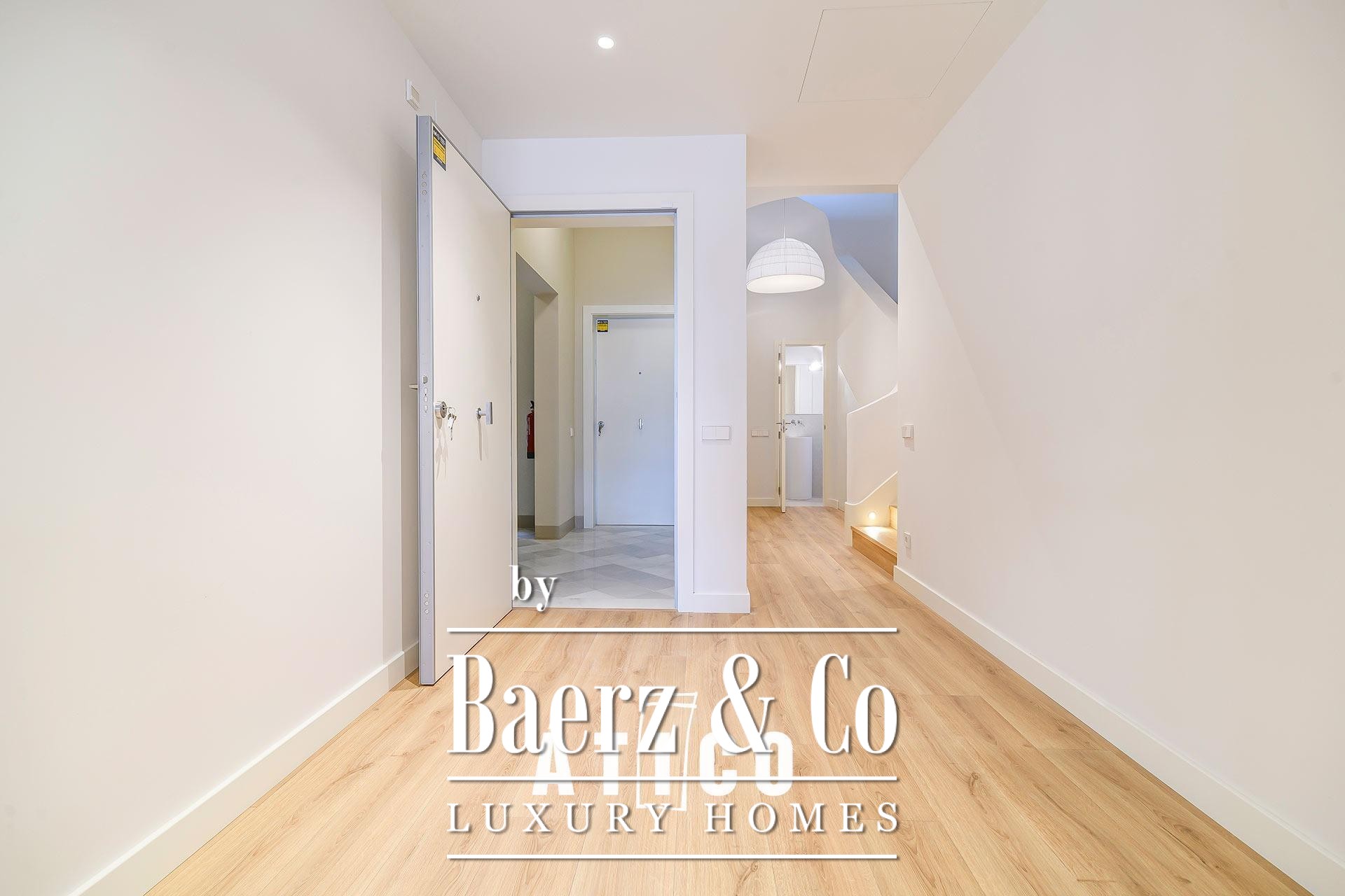 This duplex apartment Barcelona stands as a testament to refined urban living, offering 212.51 m² of newly renovated space across two distinct floors. Designed with flexibility in mind, its independent entrances provide options for privacy, work, or hospitality, allowing seamless transitions between day and night zones or dual-purpose living. Upon entry, a modern staircase defines the interior, lending the home a confident architectural rhythm and connecting both levels.