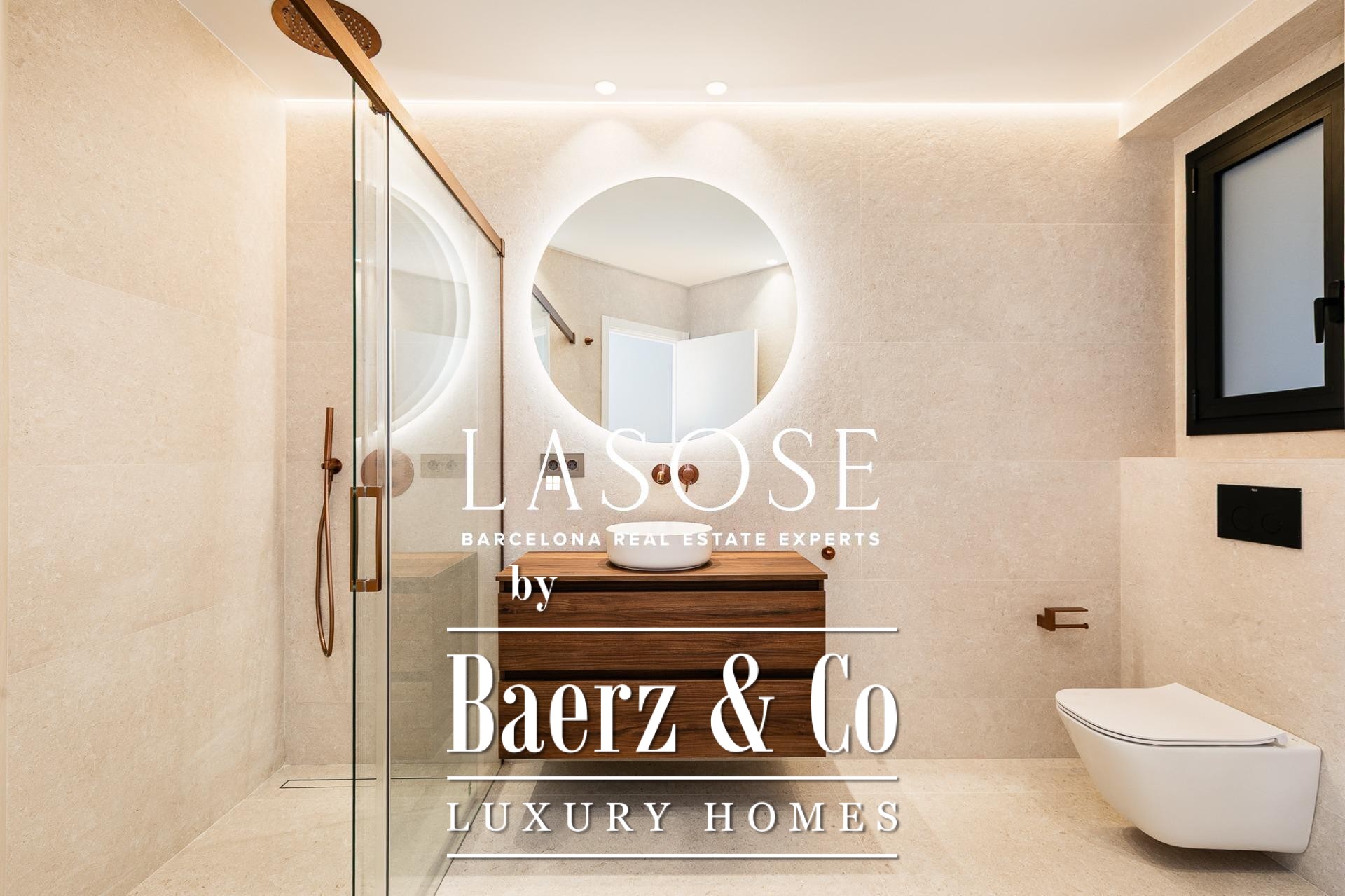 The apartment has undergone a complete refurbishment finished with high-end materials. Light flows in through expansive southeast-facing windows, illuminating generous interior volumes and the open 90 m² living-dining area. Here, doors open onto a panoramic corner terrace overlooking the tree-lined boulevards and Plaça Mossèn Jacint Verdaguer. The kitchen, by Santos and fitted with Bosch appliances, centers around a social island with an integrated wine cellar and coffee zone, complemented by an adjacent pantry room for discreet storage.