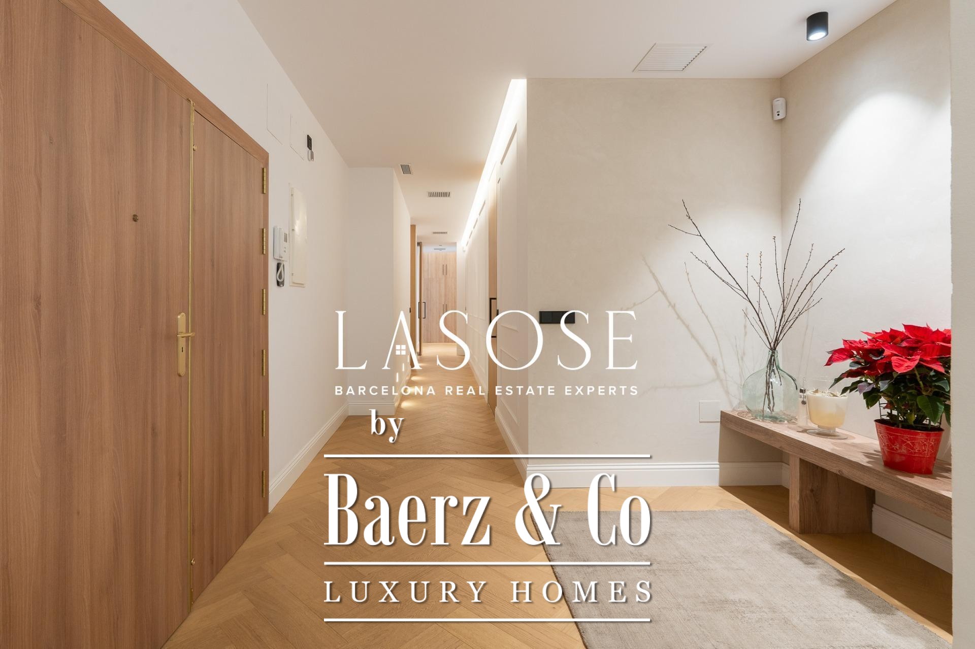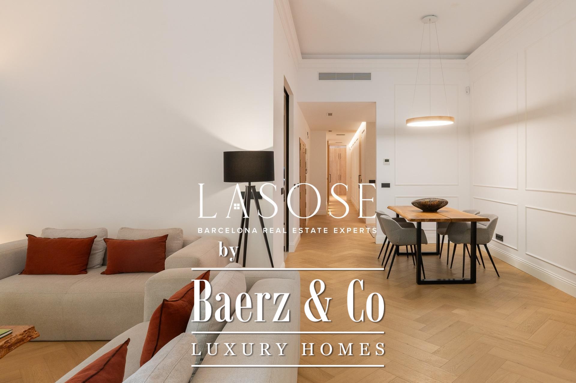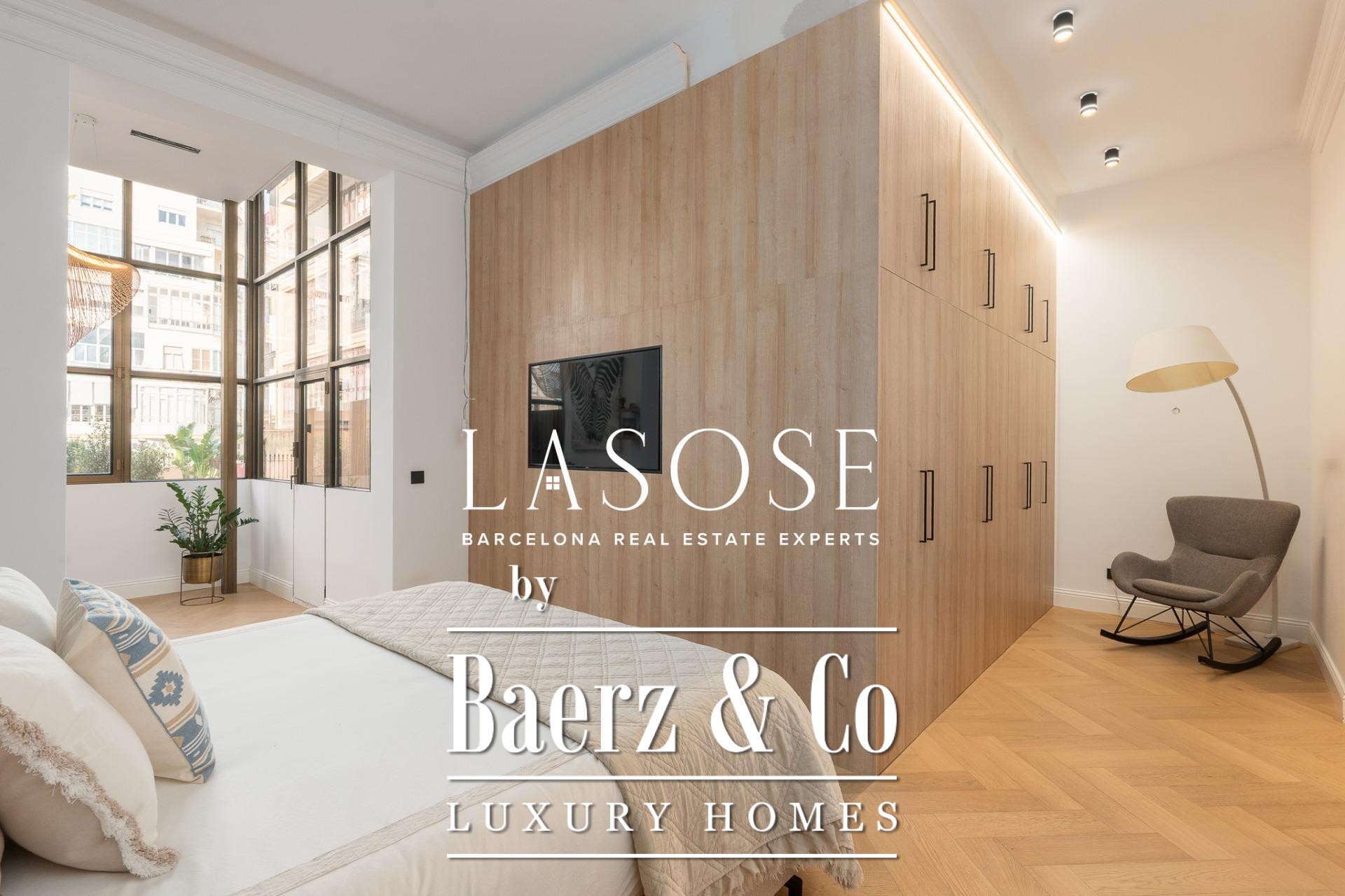 The apartment’s layout is defined by a spacious independent living and dining room with high ceilings, three bedrooms—including a refined en-suite, one double, and one single—and two full bathrooms. A fully equipped kitchen features contemporary design with premium materials, providing a seamless blend of modernity and tradition. A balcony of about 4.61 square meters offers light, city views, and a direct connection to the atmosphere of Carrer de Casp.