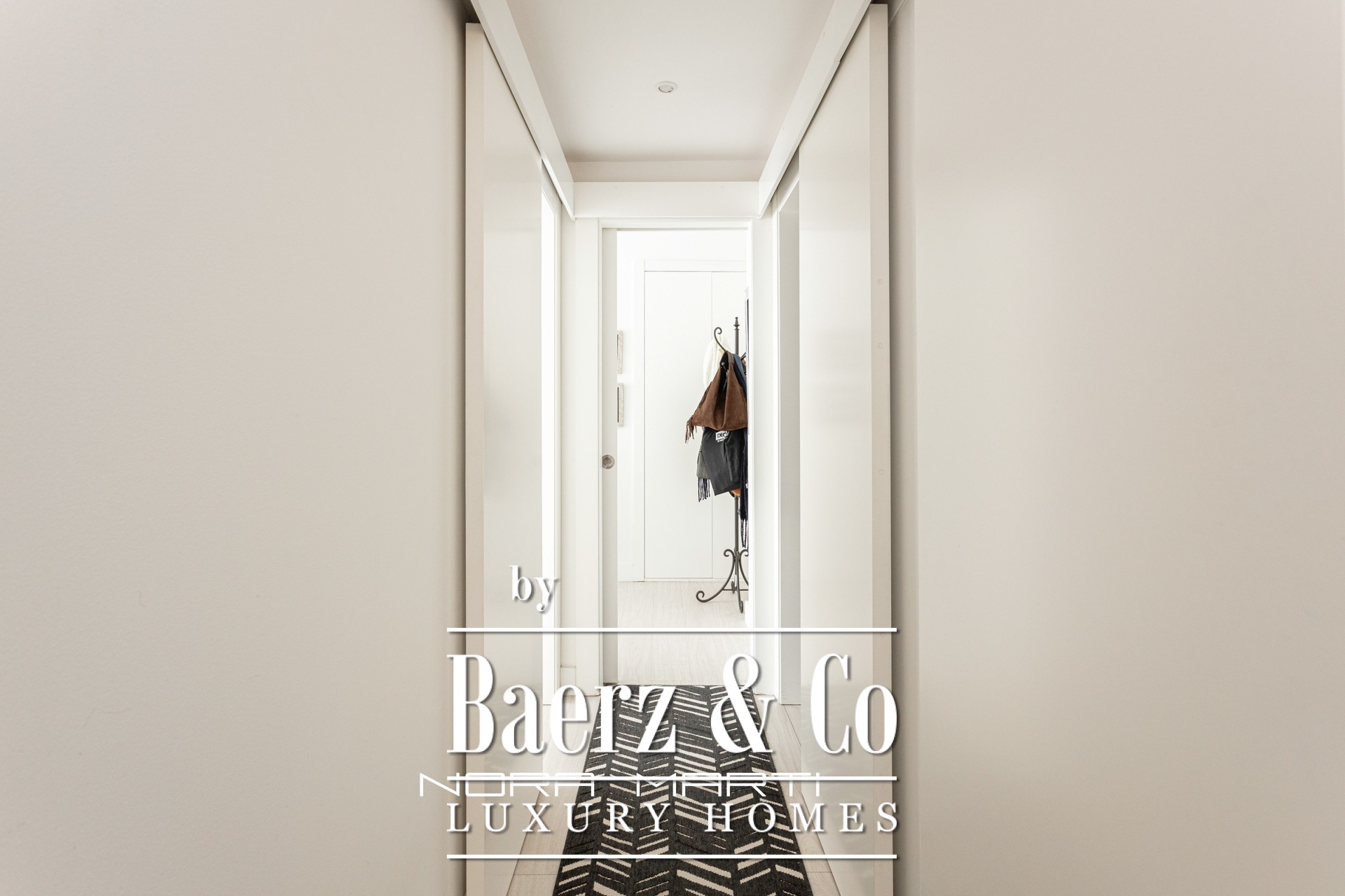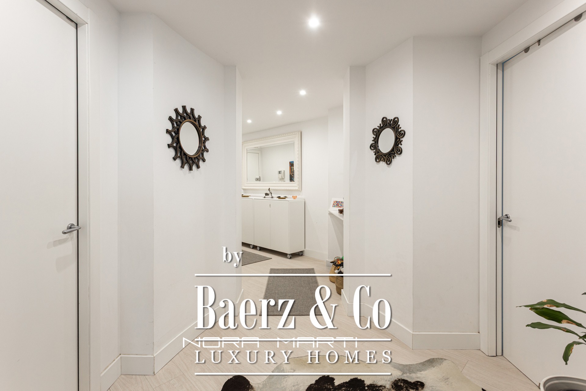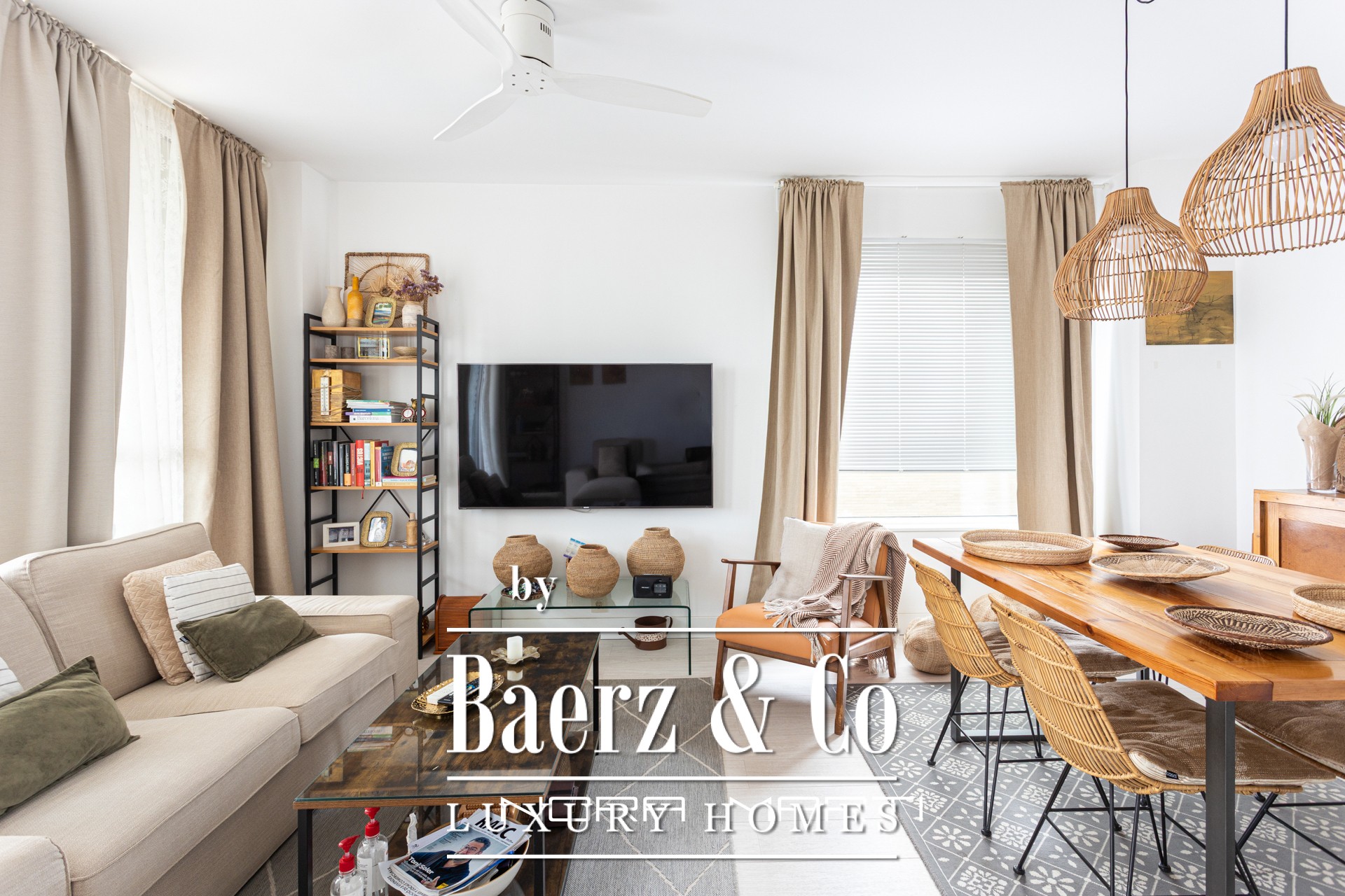 The layout is thoughtfully functional, with four bedrooms and two bathrooms, including a secluded primary suite featuring an en suite bath, dressing room, and direct access to the terrace. The generous living-dining space opens seamlessly onto the terrace, maintaining a temperate rhythm of daylight throughout, while the kitchen integrates an office zone and dedicated laundry area with exterior access.