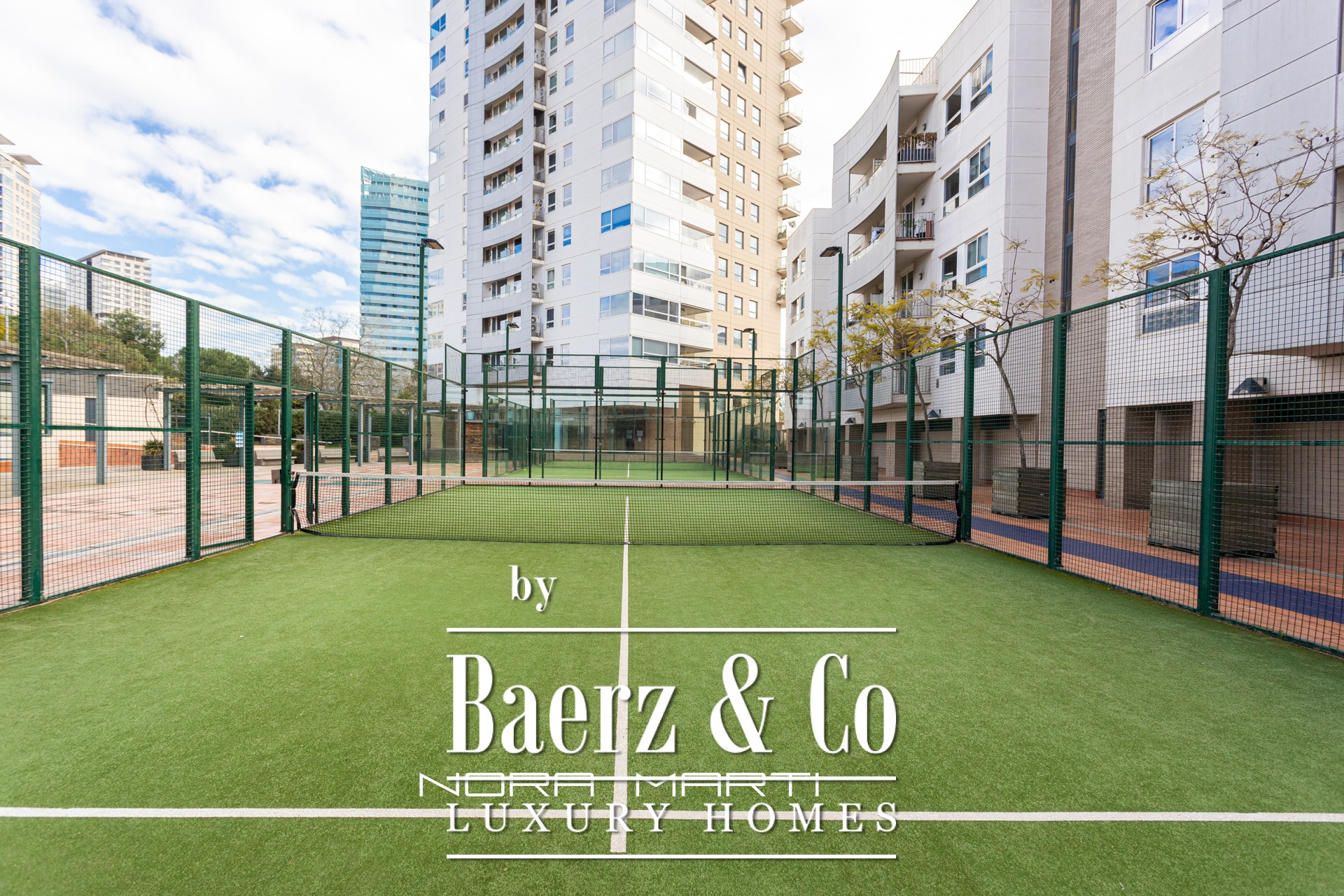 Communal amenities shape a daily life of quiet privilege: swimming pools, garden areas, gym with Technogym equipment, paddle tennis courts, playrooms, and dedicated 24-hour concierge and security. For those seeking a harmonious blend of space, comfort, and prime seaside position in Barcelona’s Diagonal Mar, this apartment offers rare integrity and lasting appeal.