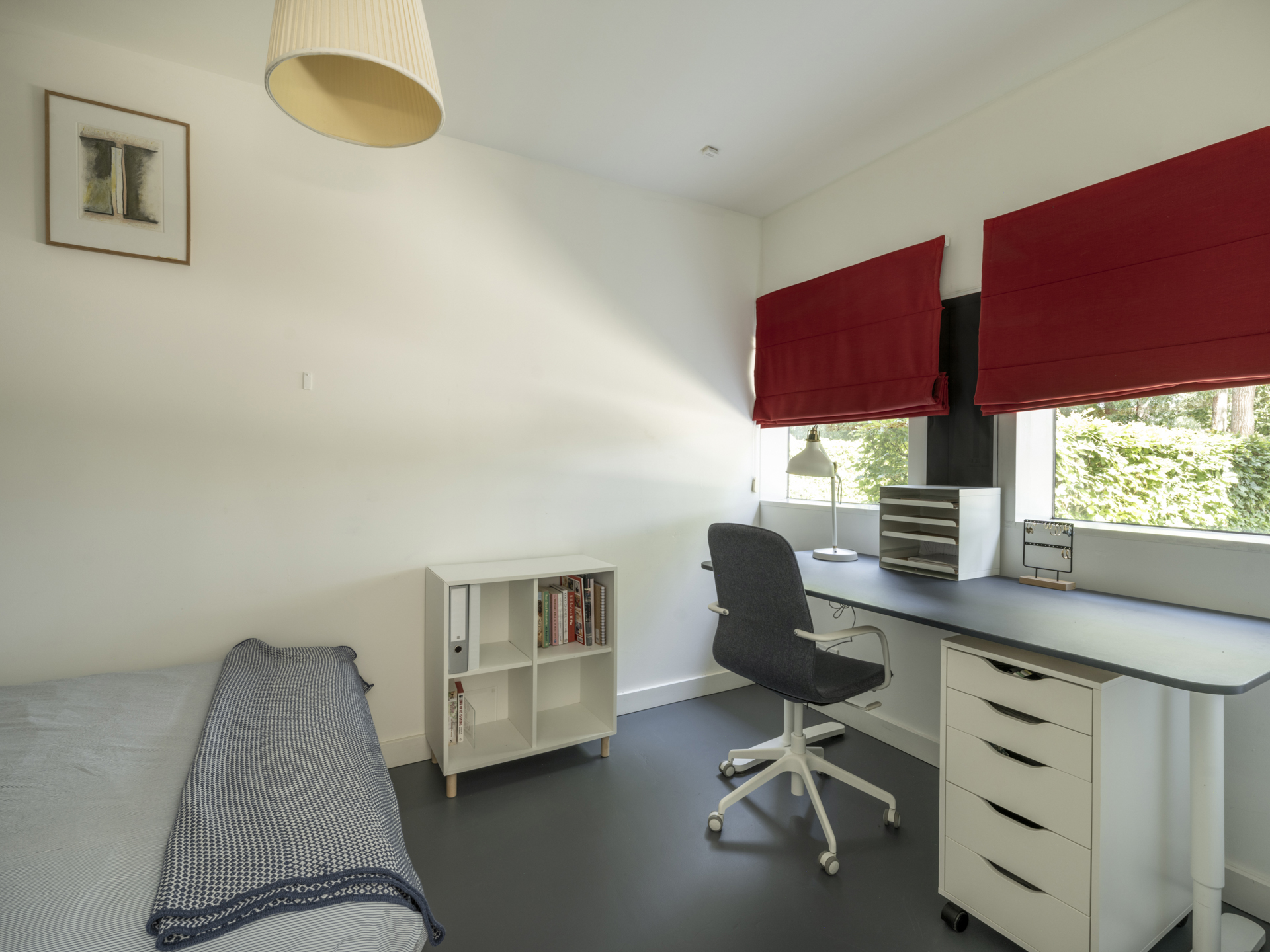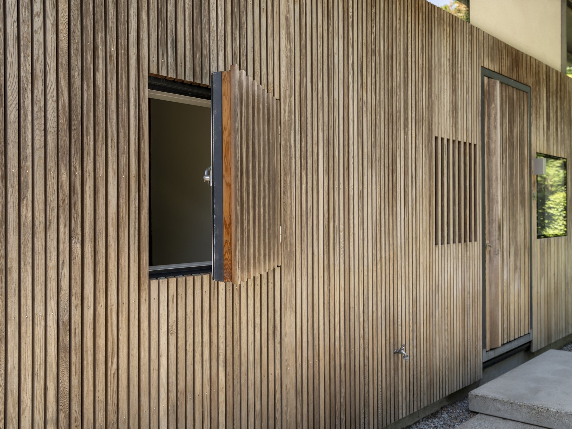 The multifunctional wooden outbuilding, built in Scandinavian style and well insulated (including triple glazing), currently serves as a workshop, hobby space, and guest accommodation, but can easily be converted into a care residence (e.g. for elderly parents).