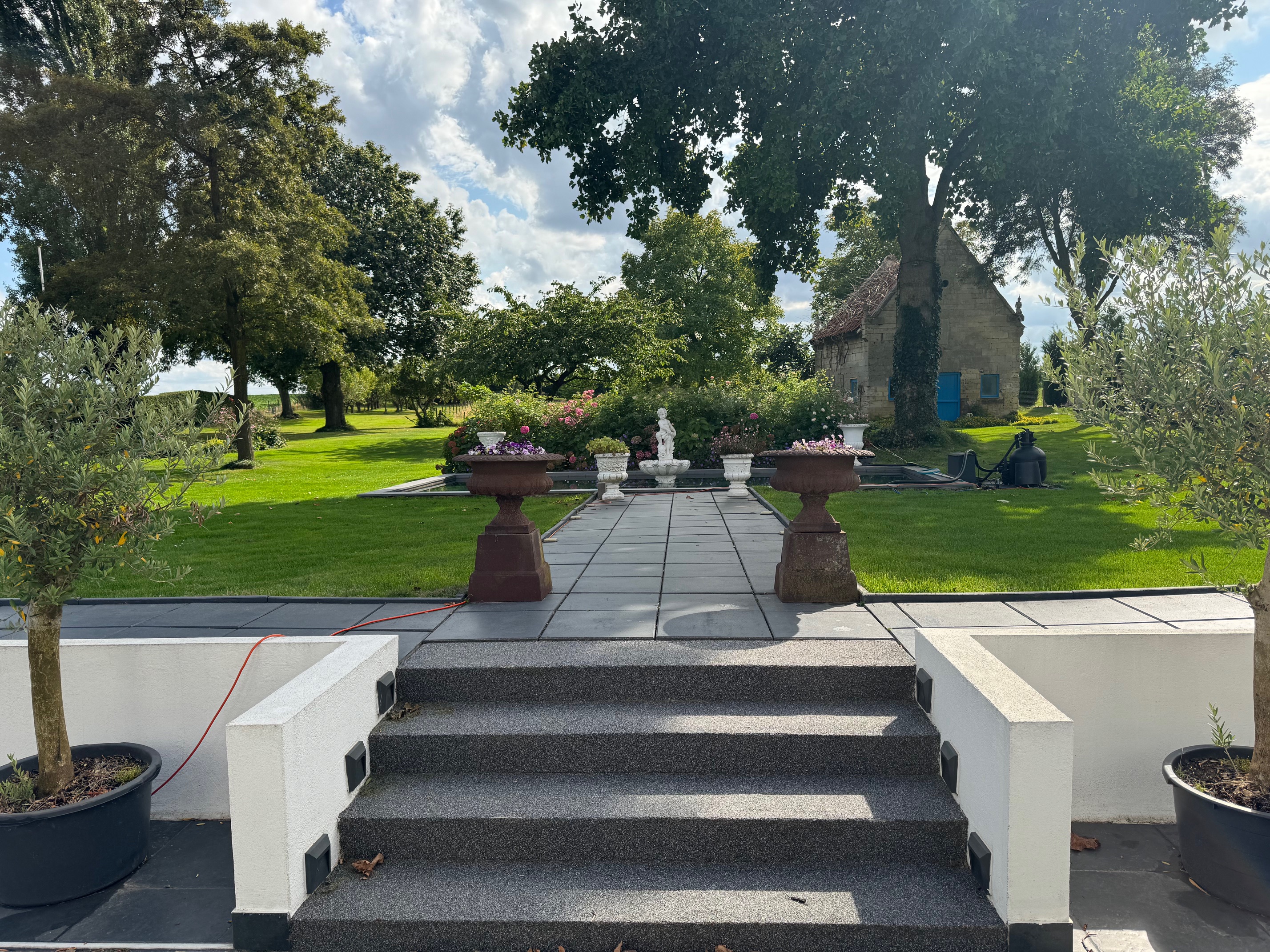 Tall historic entrance gates lead into a striking, fully paved courtyard composed in a single refined material palette. Château gravel, a large French fountain and sight lines toward the rare marlstone windmill lend the space a quiet, timeless grandeur. The courtyard serves as the serene centre of the estate – a place where light, order, peace and quite converge.