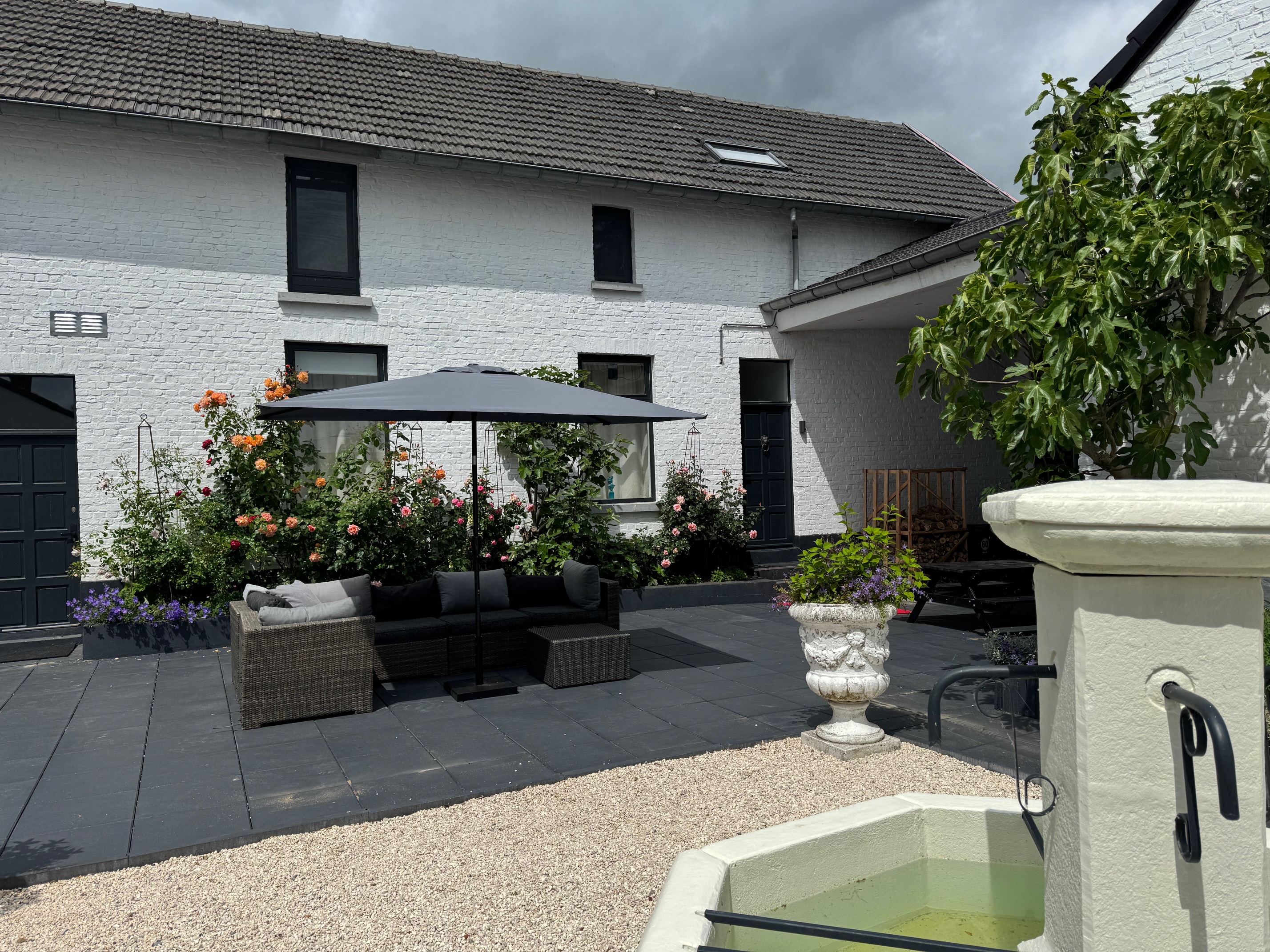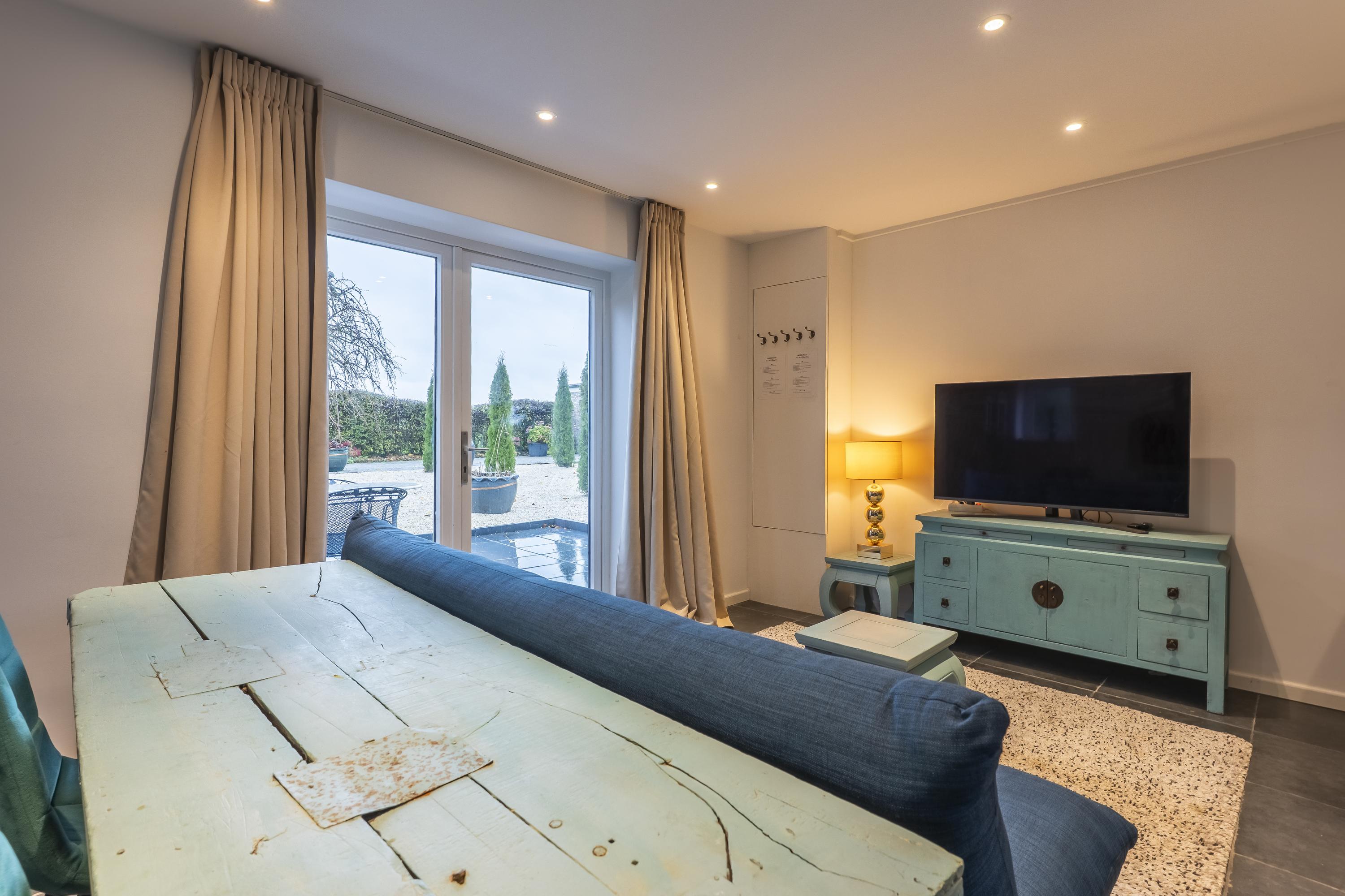 The main residence is conceived around light, proportion and a strict architectural consistency. The spacious living kitchen, fitted with Gaggenau appliances, forms the heart of the home. The adjoining living area exudes understated luxury with generous windows, a modern wood stove, and direct access to both the courtyard and the garden terraces. Large anthracite tiles extend seamlessly outdoors, creating a unified interior–exterior composition. A study (or additional bedroom) on the ground floor and the elegant Golden Bathroom complete the ground level.