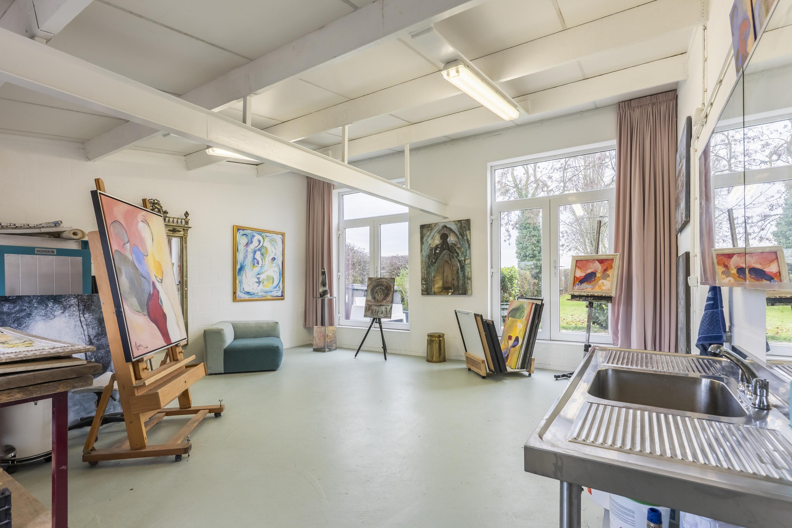 Accessed via its own paved road with parking, the studio/workshop features tall windows, framing views across garden and landscape. Fully serviced, it is perfectly suited as a studio, design space, consulting room or private office.