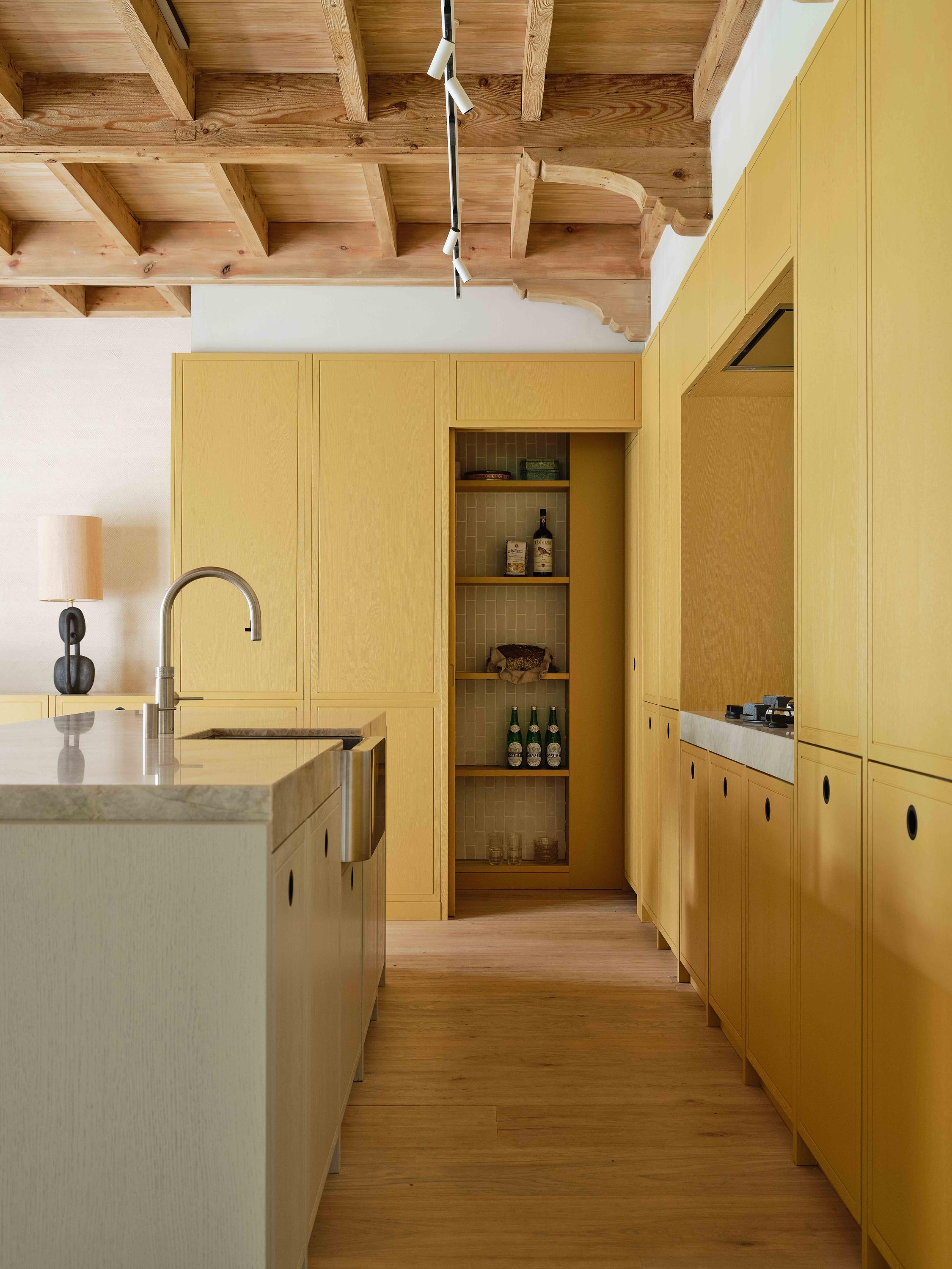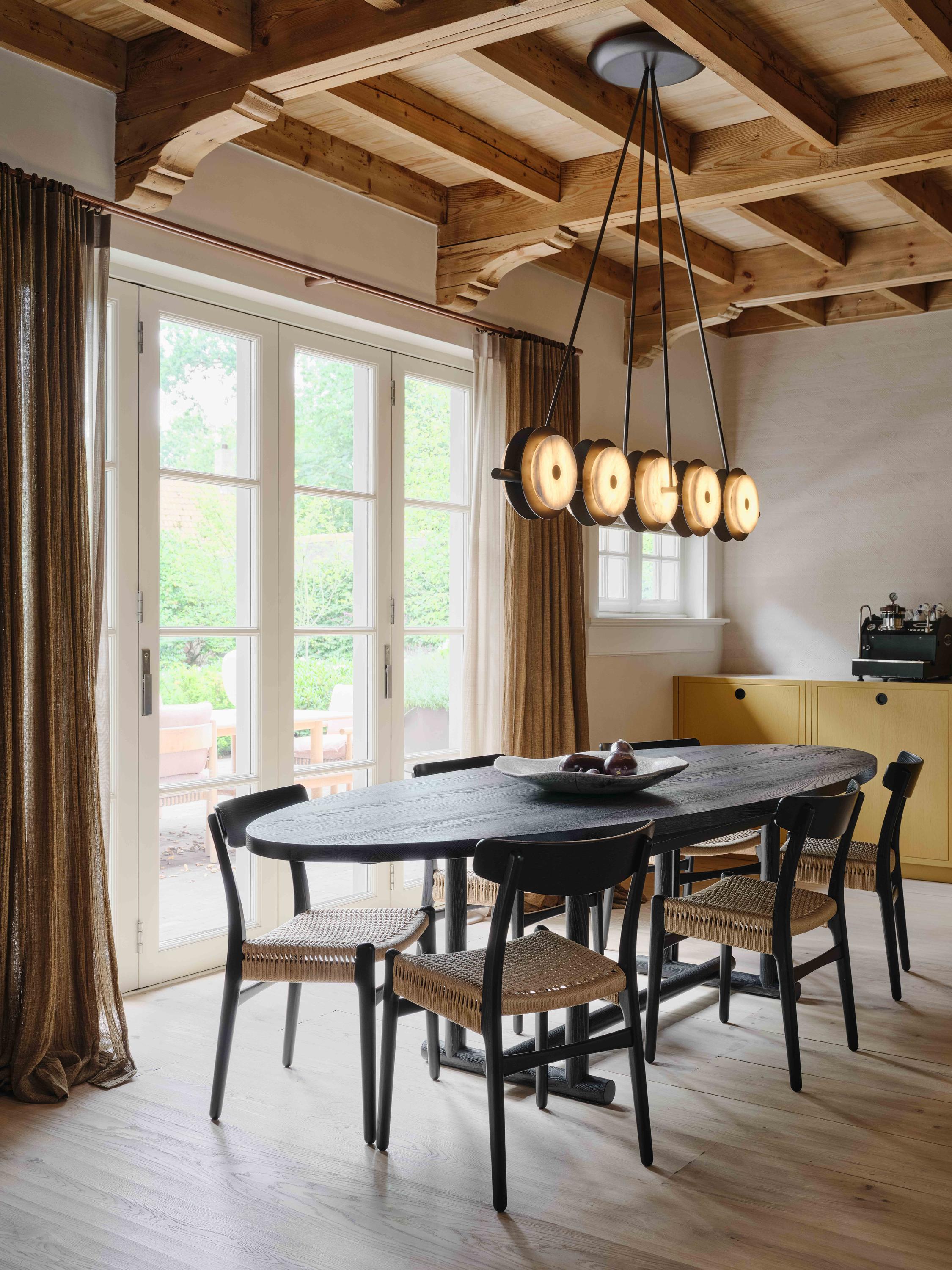 Let’s go inside: the entrance leads to a spacious hall with a cloakroom, a modern toilet and access to the basement. From here, you walk through to the spacious kitchen-diner, the central hub of the home. This features a cooking island, natural stone worktops and high-quality built-in appliances. Thanks to the French doors, there is a direct connection to the outdoors.