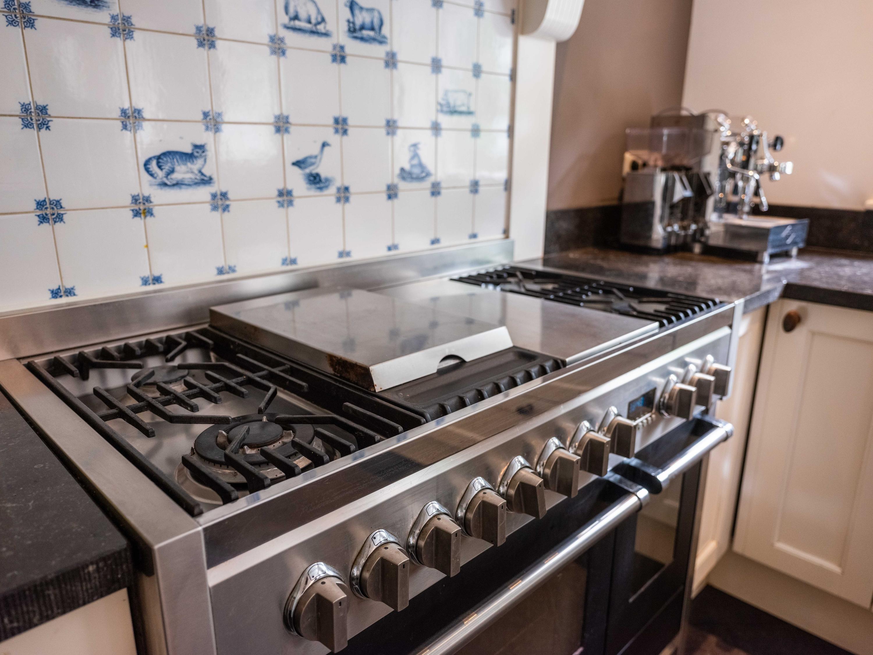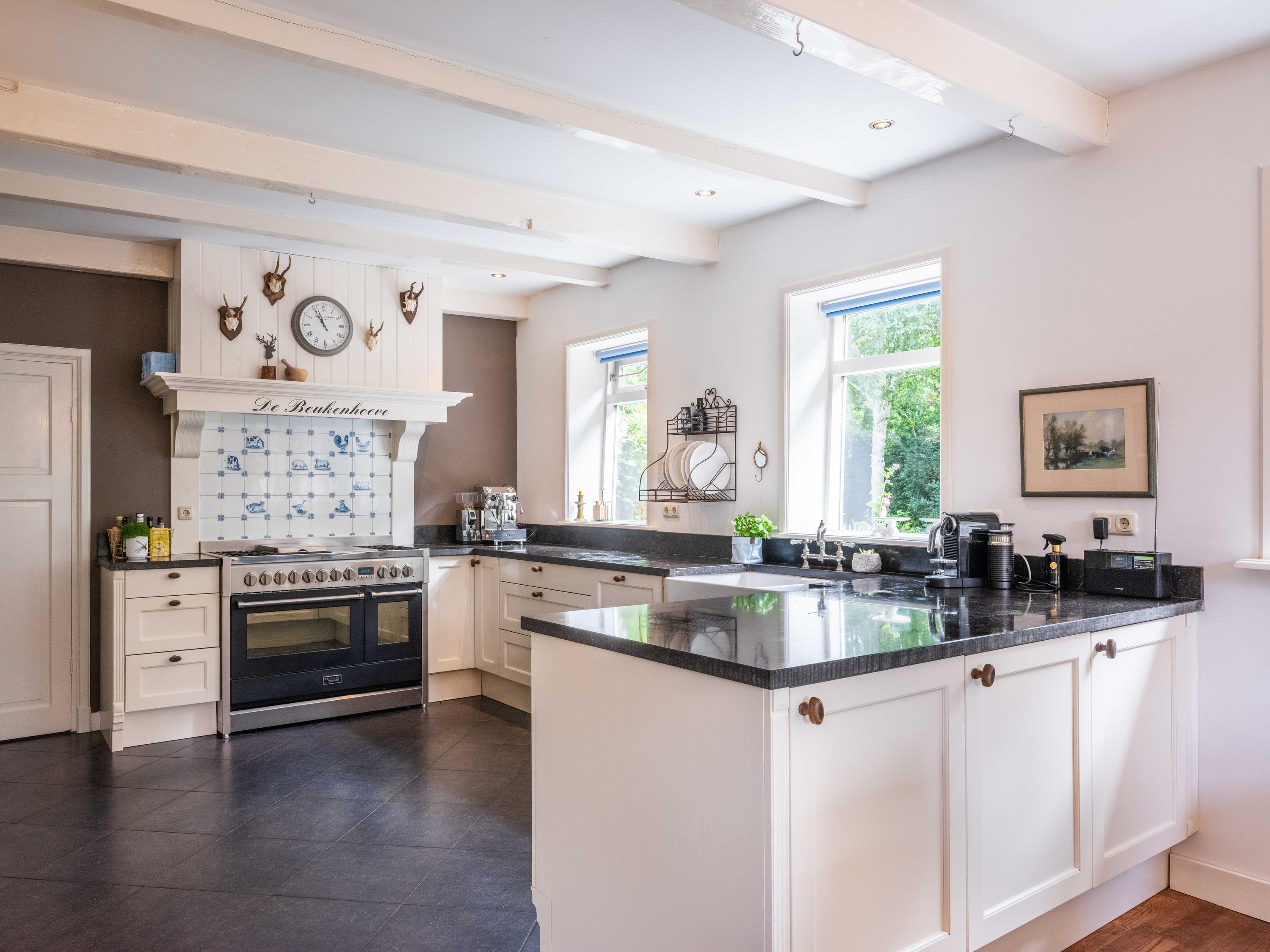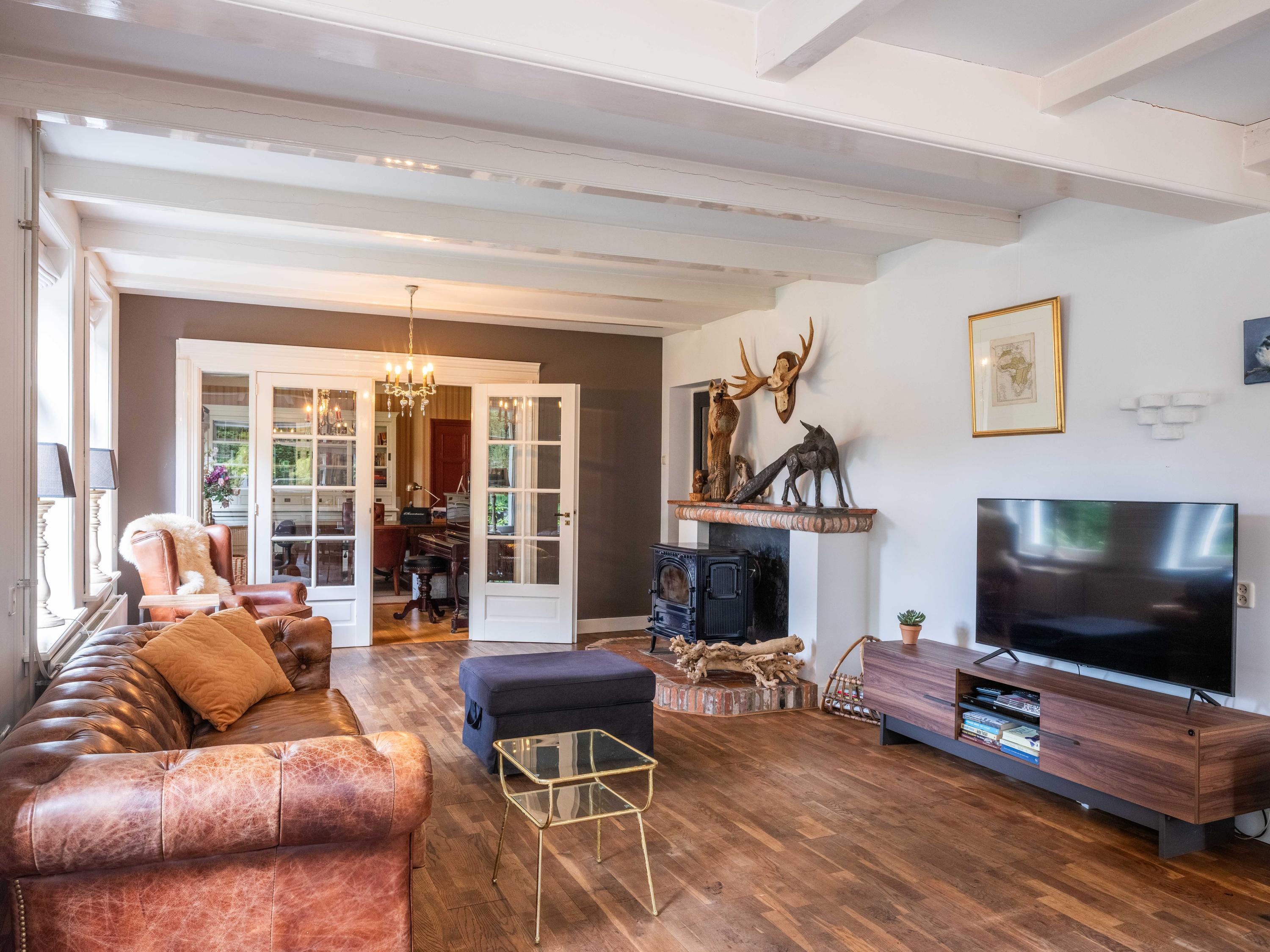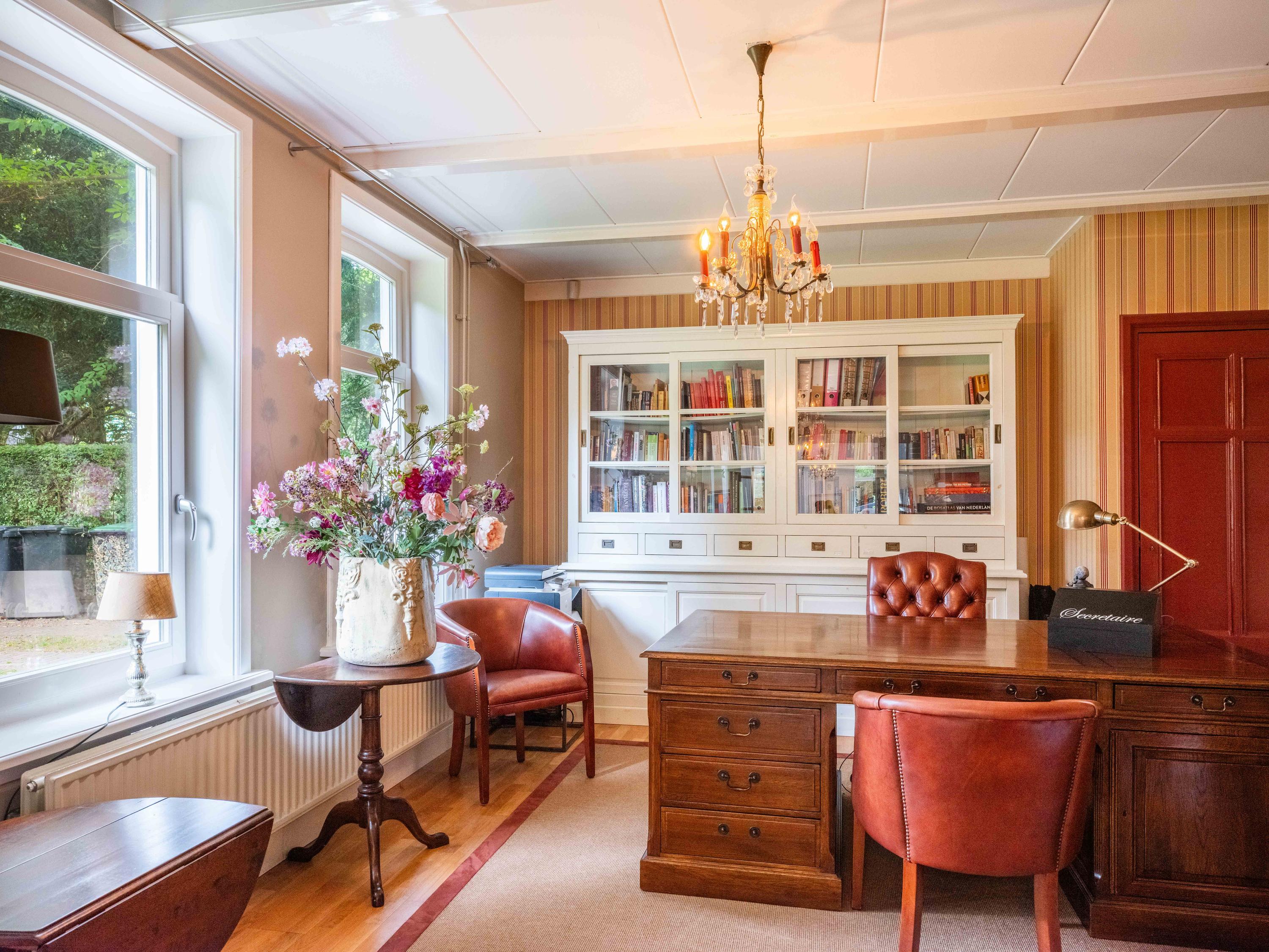 The spacious living room of 18 meters long is sunny and light because of the many windows. En-suite doors divide the space into an office and living room. The living room has a cozy wood-burning stove and a door to the front terrace. The spacious country style open kitchen has a striking mantelpiece with large stove. Adjacent to the kitchen is a large laundry room as well as a separate linen room. There is also a pantry with full-length built-in cupboards and a kitchenette with a door that leads to a second terrace and garden adjacent to the house.