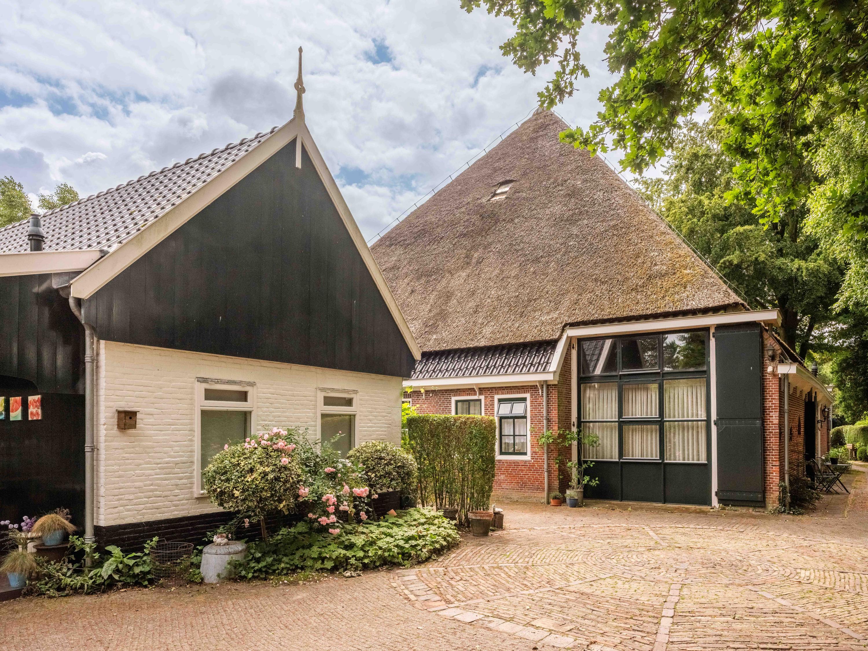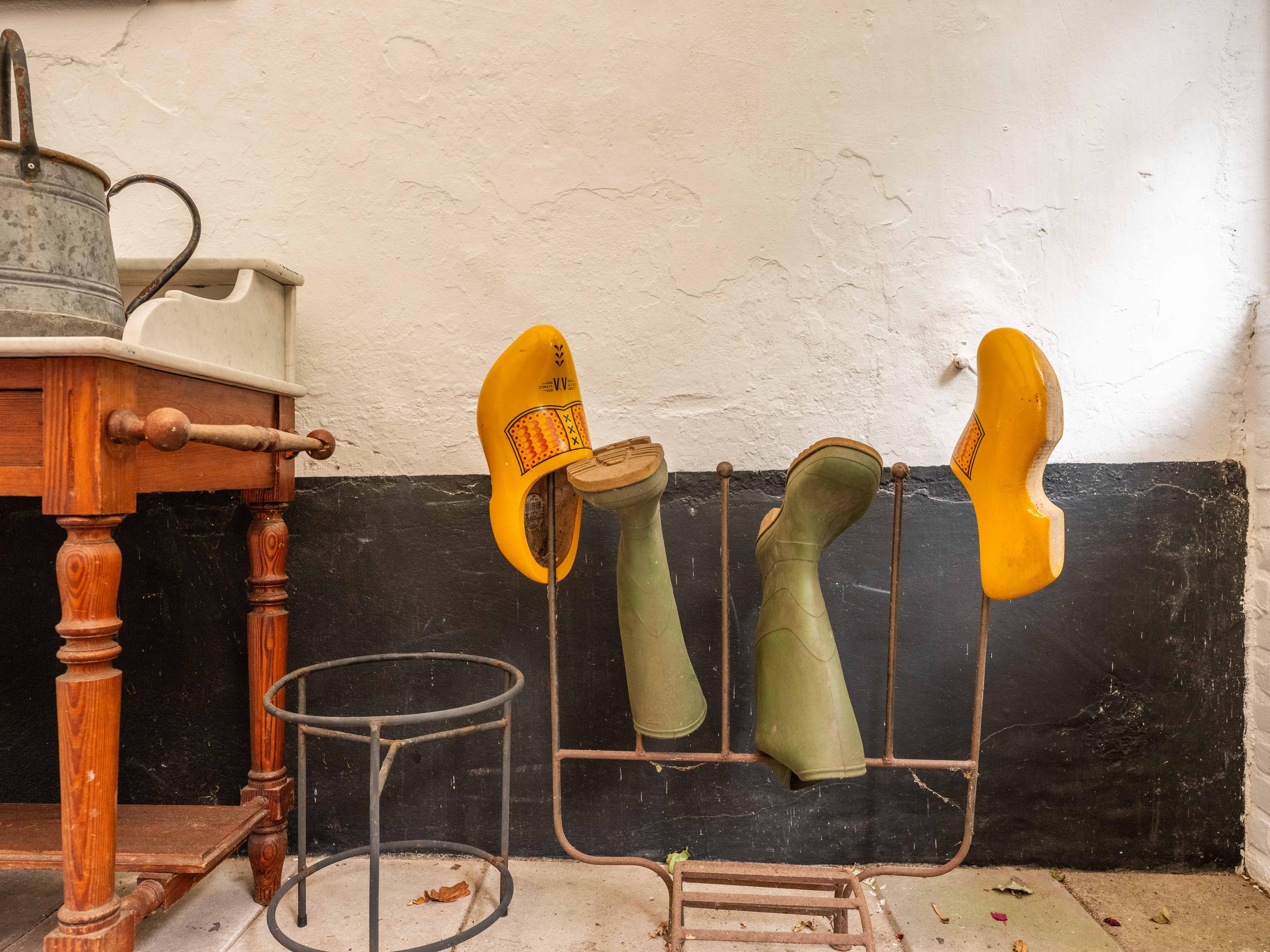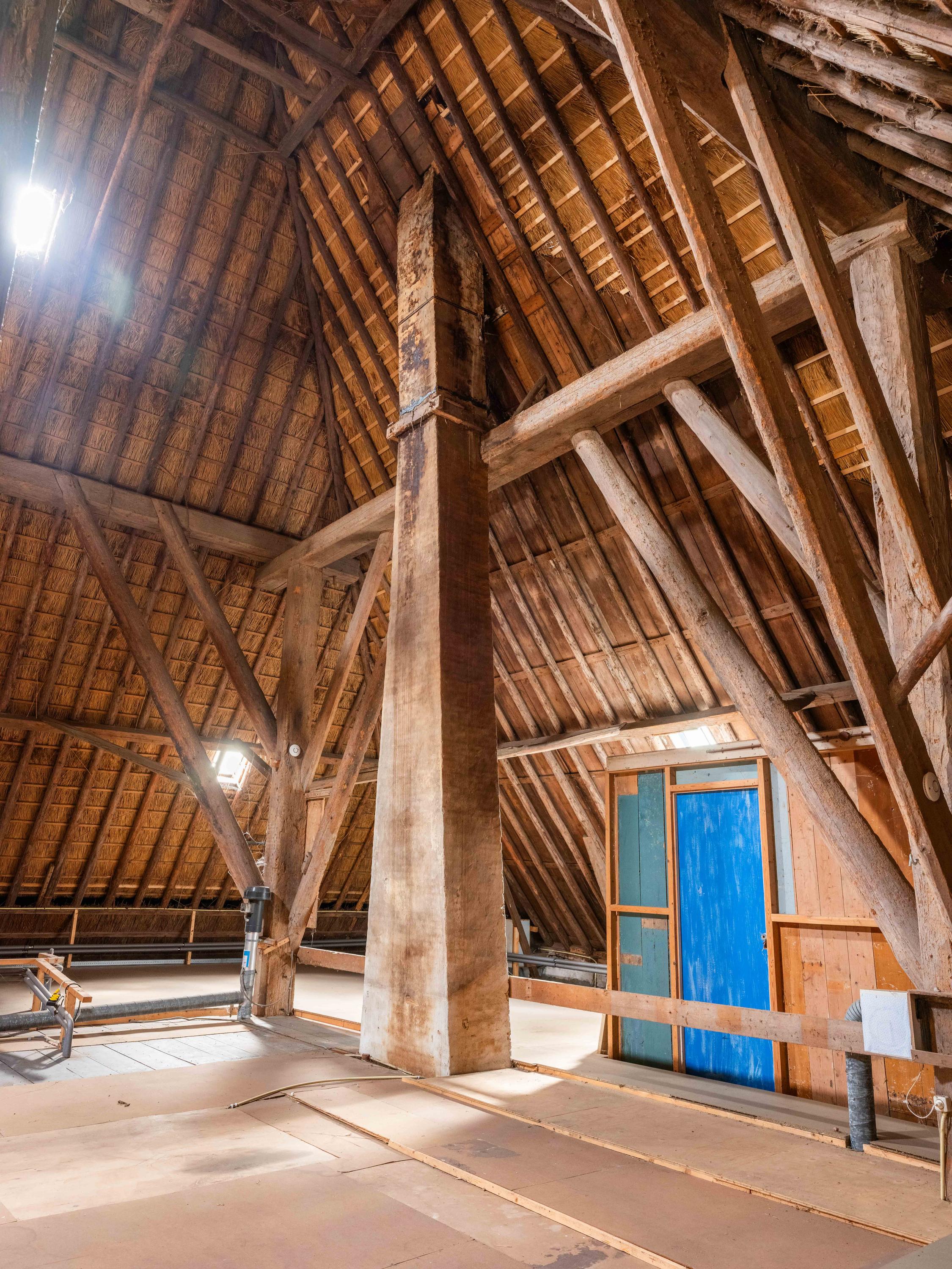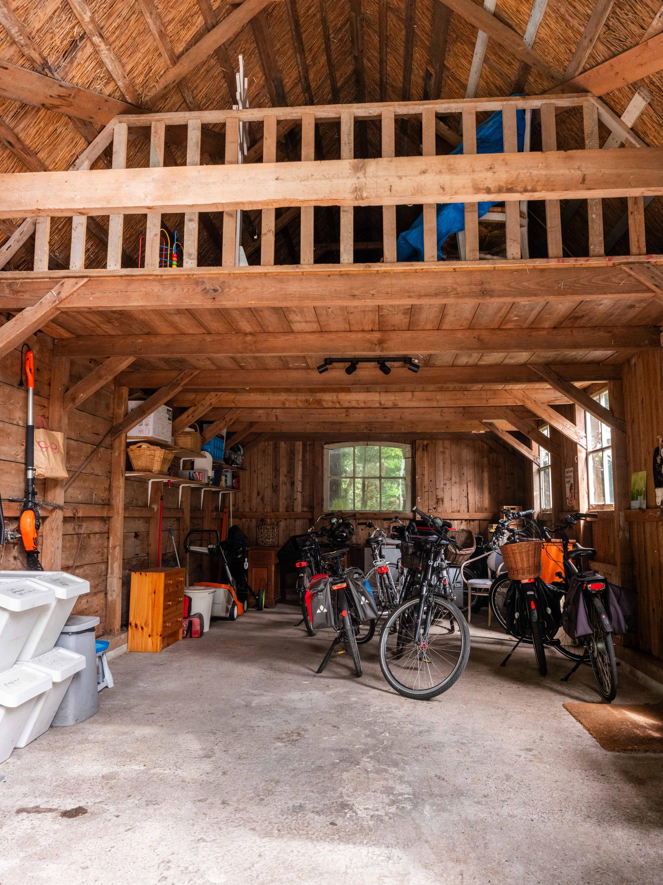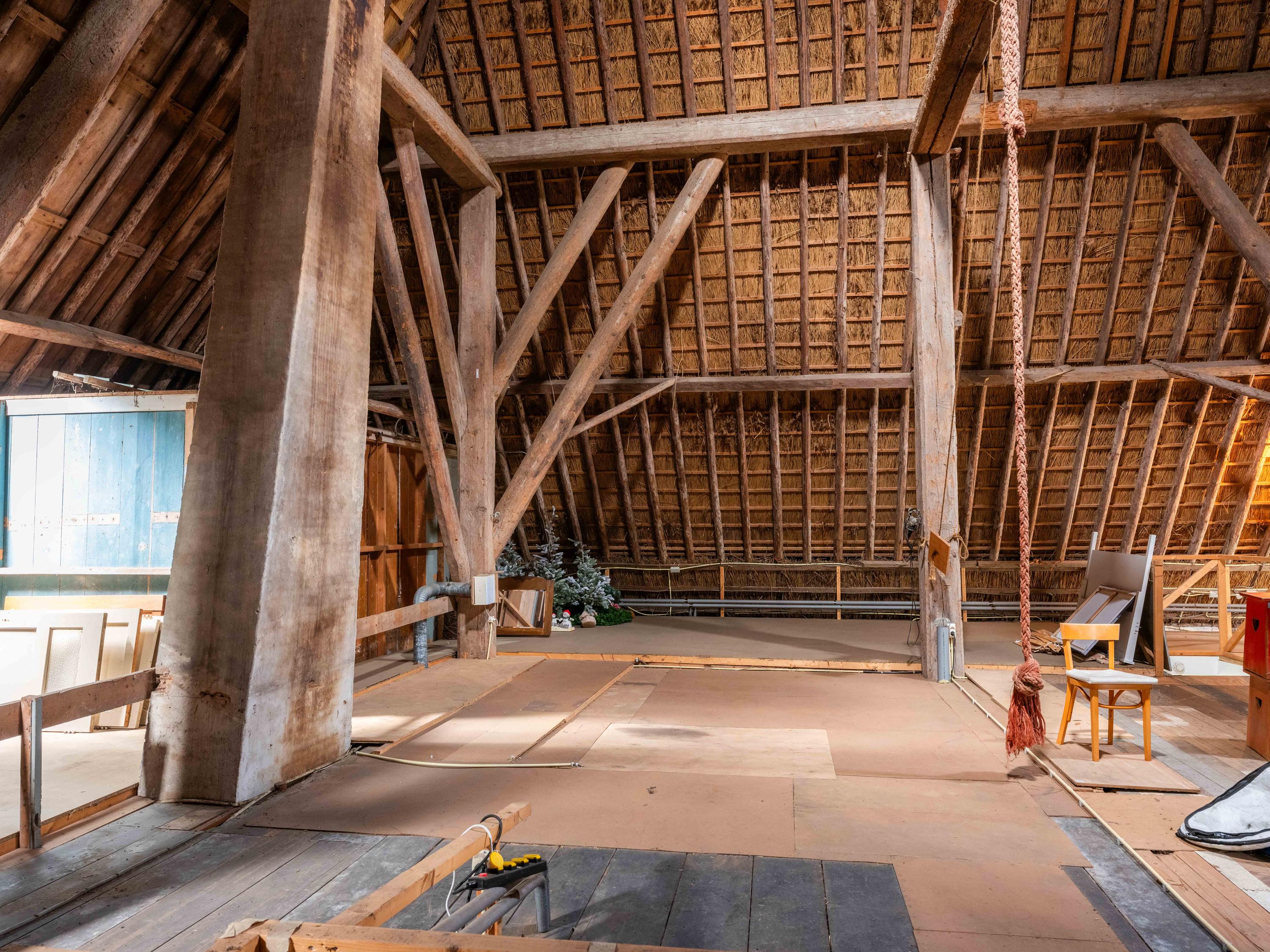 The first floor of the farmhouse, now an indoor storage space, can still be completely styled as you see fit. It is a huge space with a striking view of the wooden beams and thatched roof. The old farmhand's room now serves as a heated storage space.