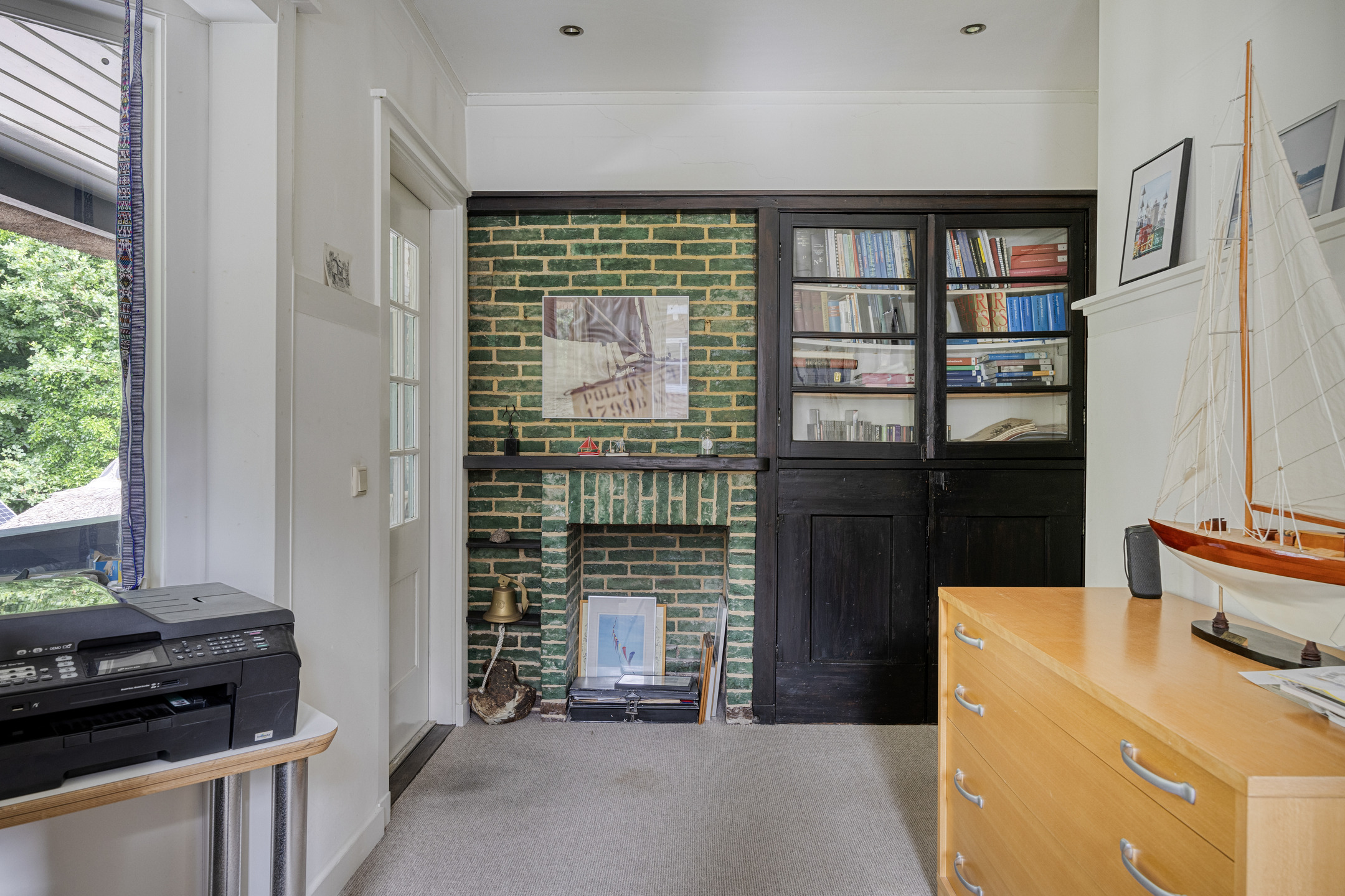 Original brick fireplaces and built-in cabinets;