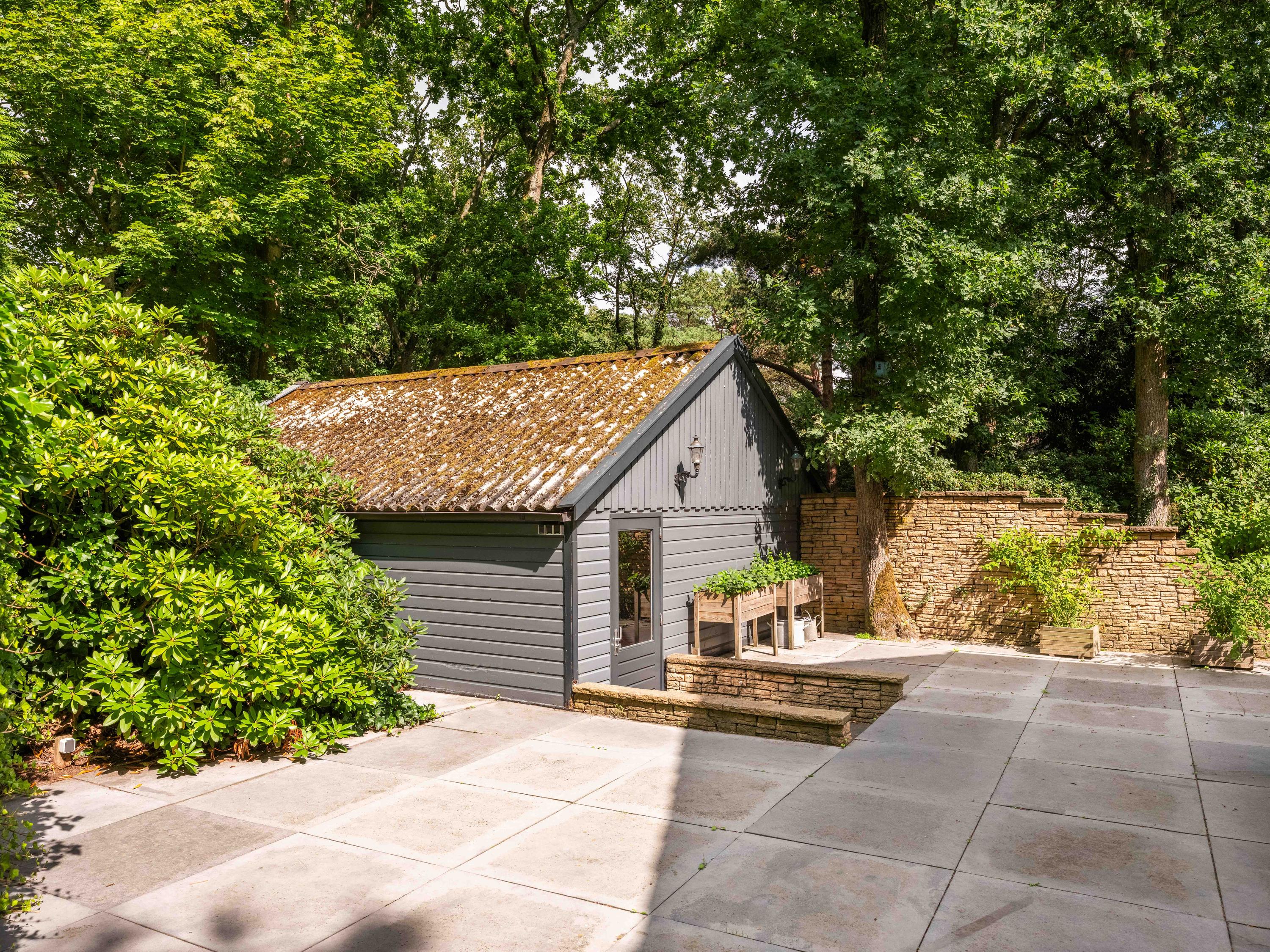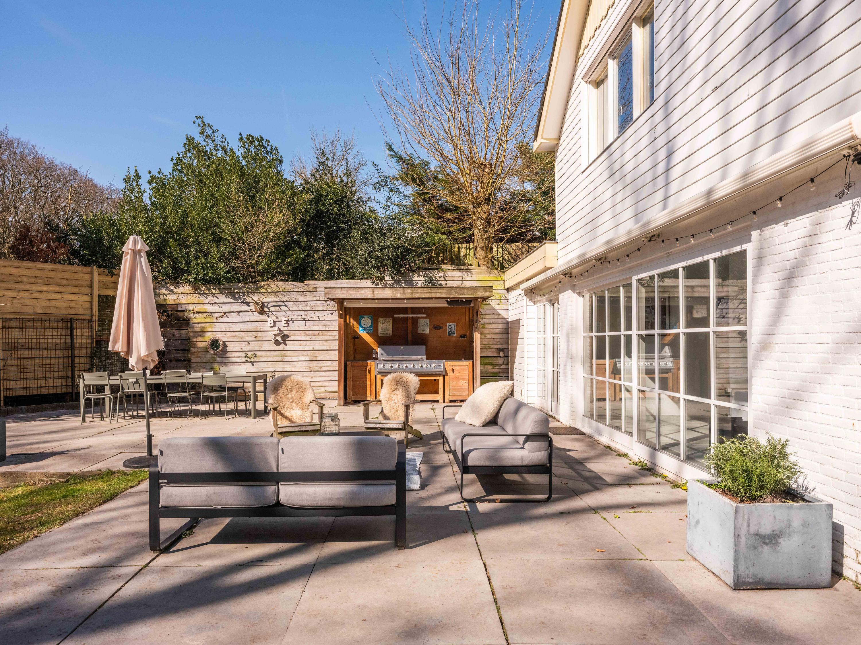 The house is surrounded by a lovely garden, completely enclosed by newly installed fencing. In the garden we find a sauna, outdoor kitchen and a barbecue connected to the gas mains. The double garage has electric doors and there is also a separate room for bicycles and garden equipment. In front of the garage there is room to park several cars.