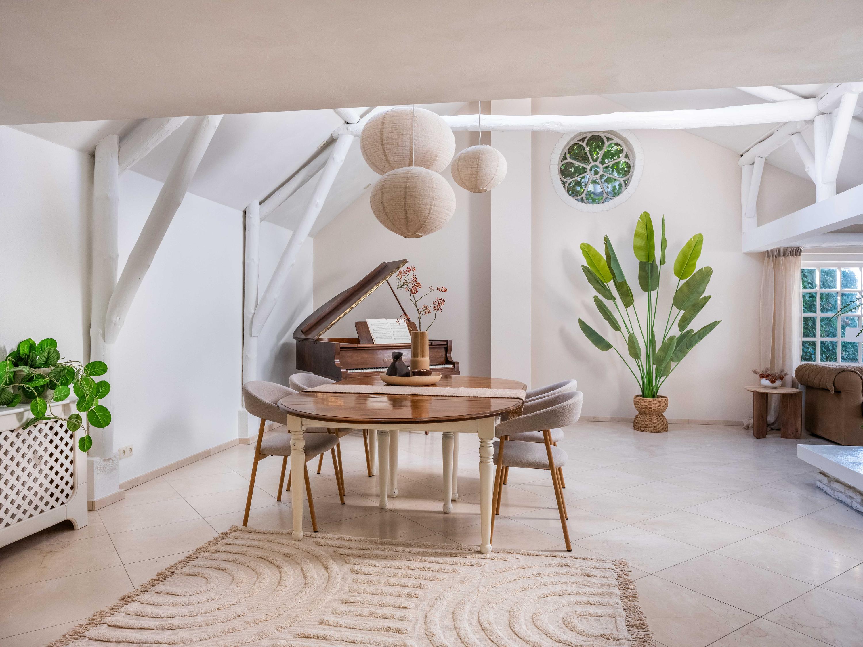 The spacious living room has a cozy gas fireplace (formerly fireplace) in the center of the room. The room is cozy with many authentic details. Think of the wooden beams in sight, a high ceiling up to the ridge and round stained-glass windows. At the back left we find the open kitchen with built-in appliances. From the kitchen we enter the utility room with the connection for the washer and dryer, the central heating system and a door to the outside.