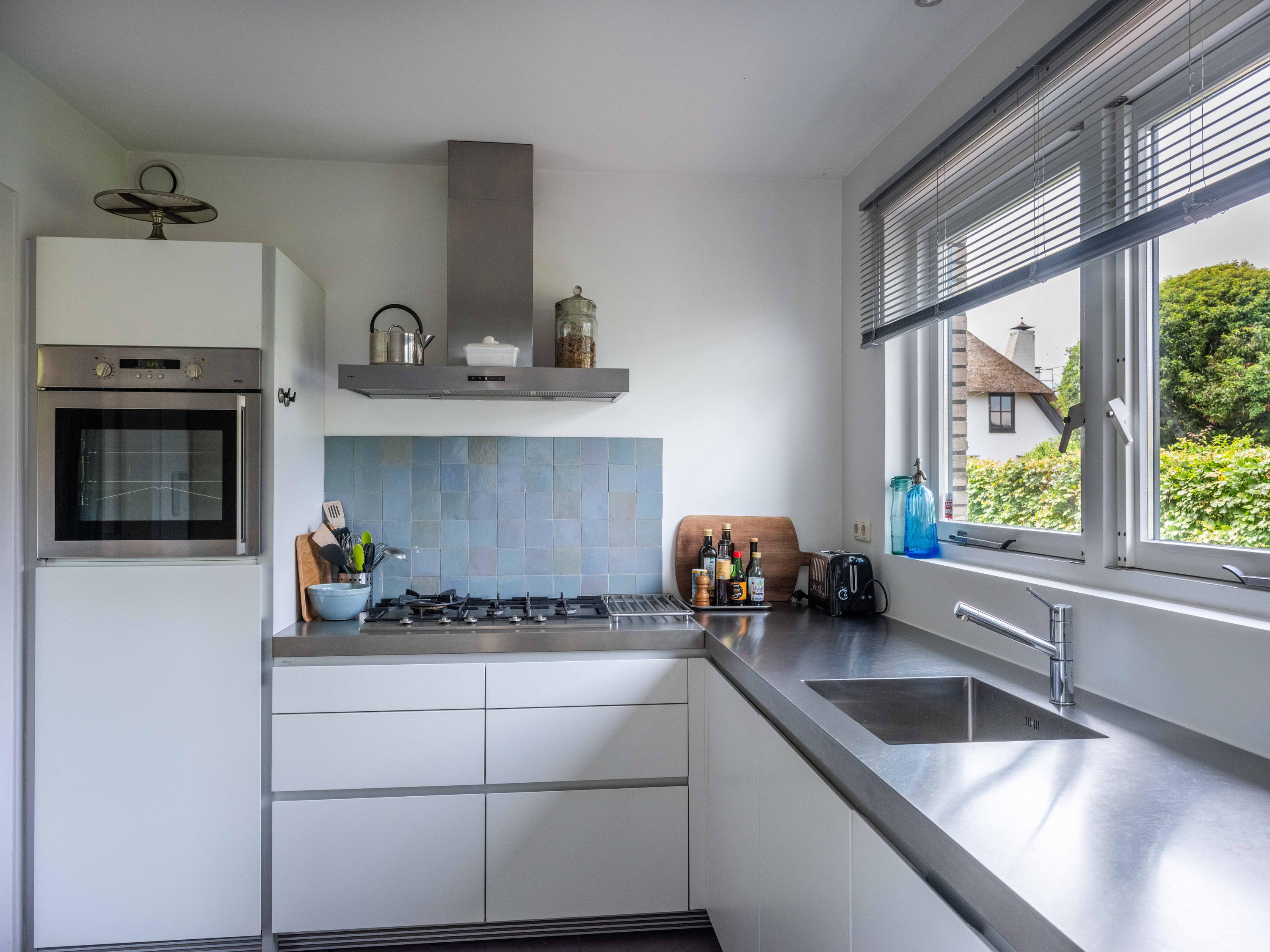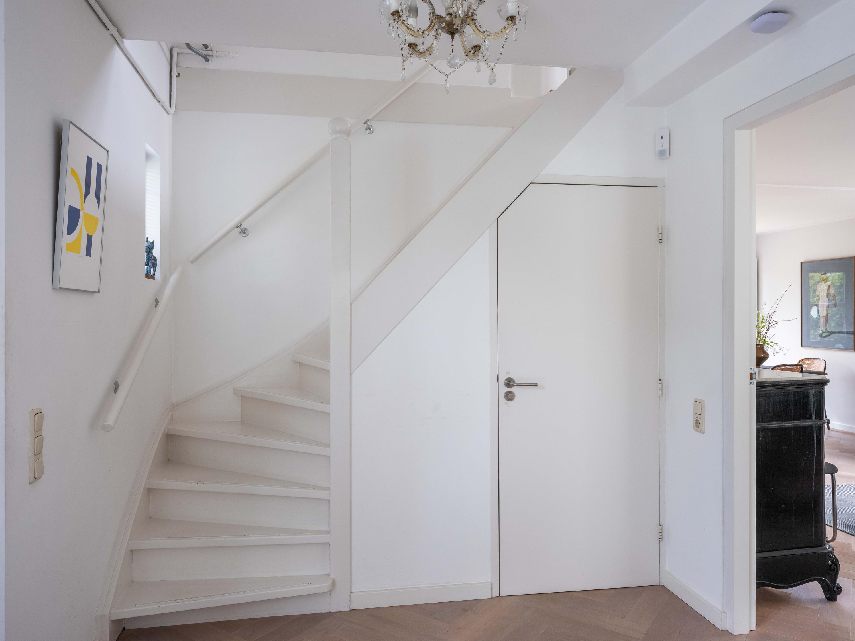Entering through a well-proportioned hall, the rhythm of oak flooring and generous light define the expansive living area. French doors connect to a thoughtfully landscaped garden, offering multiple terraces and a sense of calm, while a dedicated work or hobby room extends the sense of purpose. The Bulthaup kitchen is appointed with an Atag oven, 5-burner stove, dishwasher and refrigerator. A former garage, now a large storage room with utility connections, enhances the sense of practical elegance.