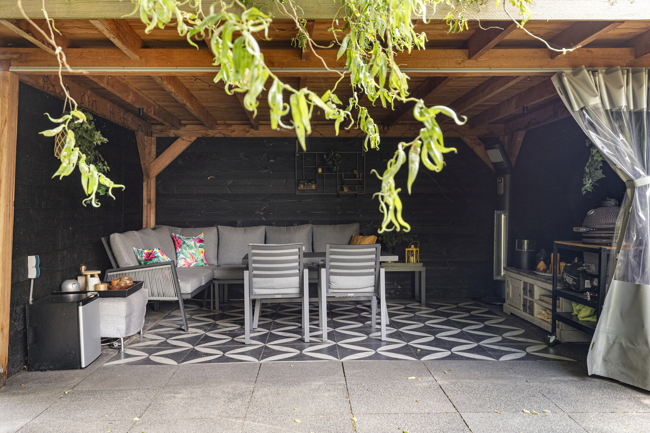 The recently renovated L-shaped kitchen is fully equipped with built-in appliances, including a dishwasher, induction hob, extractor hood, double sink with mixer tap, oven, and fridge-freezer combination. A window screen has also been installed.