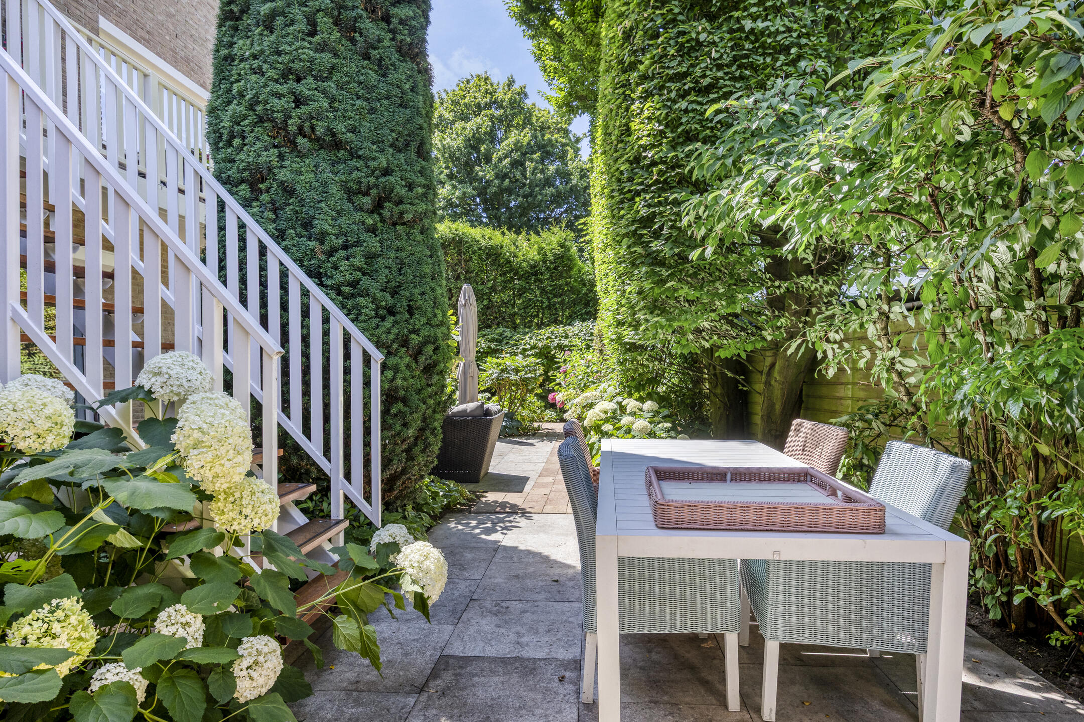 A large driveway with electric charging point introduces the property, complemented by a private garage. Expanses of glass and a serene conservatory suffuse the main living area with light, where a wooden floor and open fireplace create a welcoming atmosphere. The kitchen, with its modern island and extensive built in appliances, includes features such as a climate cabinet, Quooker and steam oven. Adjacent balconies and gardens offer seamless transitions between indoor and outdoor life, with sun throughout the day and practical roll down shutters, sun awnings and twenty solar panels ensuring both comfort and efficiency.