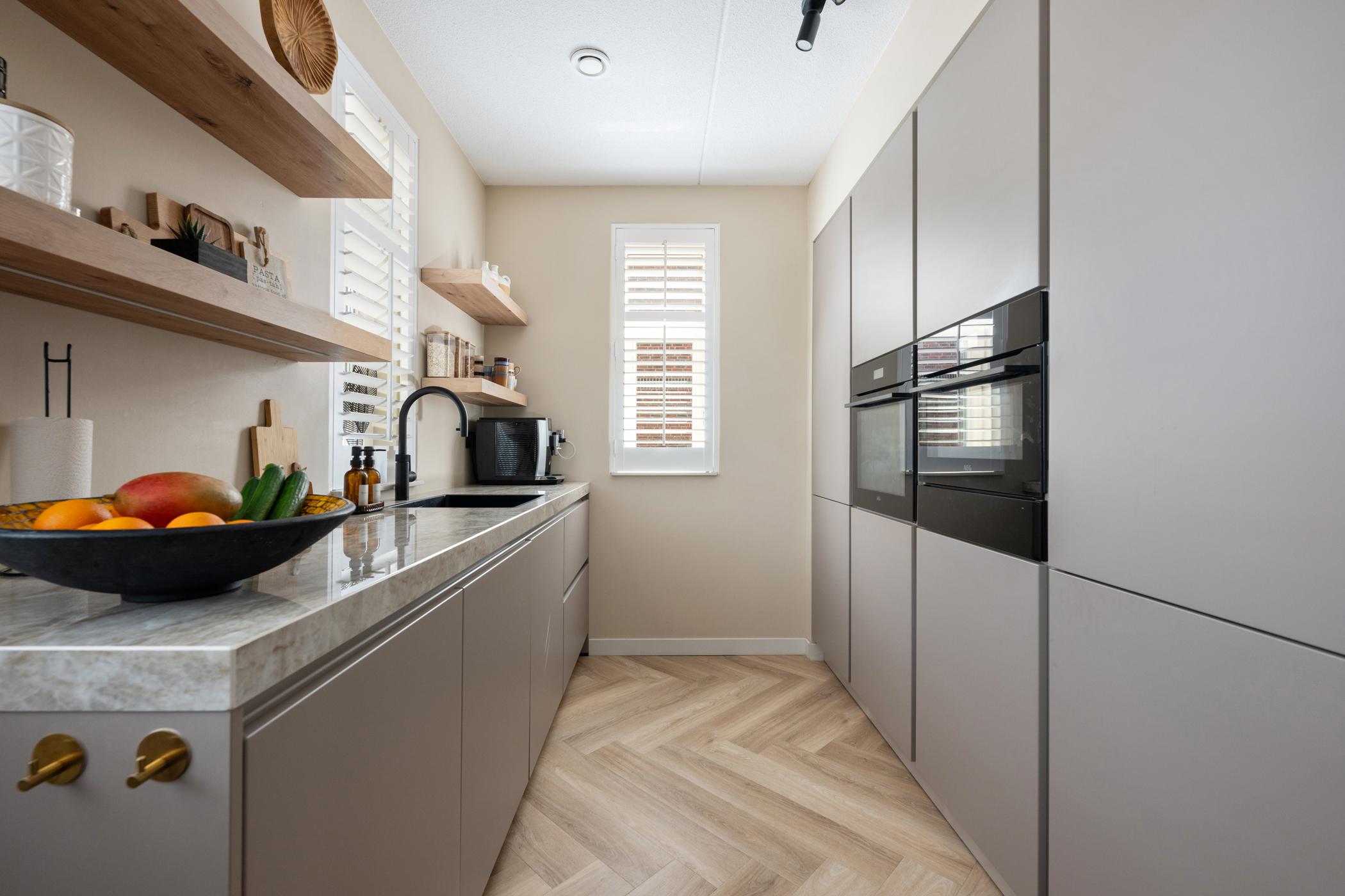 The inviting living room is bright and spacious, with the seating area at the rear. At the front, you’ll find the generous kitchen with a stylish island, finished with a luxurious marble countertop. The kitchen is fully equipped with high-end built-in appliances, including an induction cooktop with integrated extractor, oven, combination microwave, warming drawer, Quooker, fridge-freezer, and dishwasher.