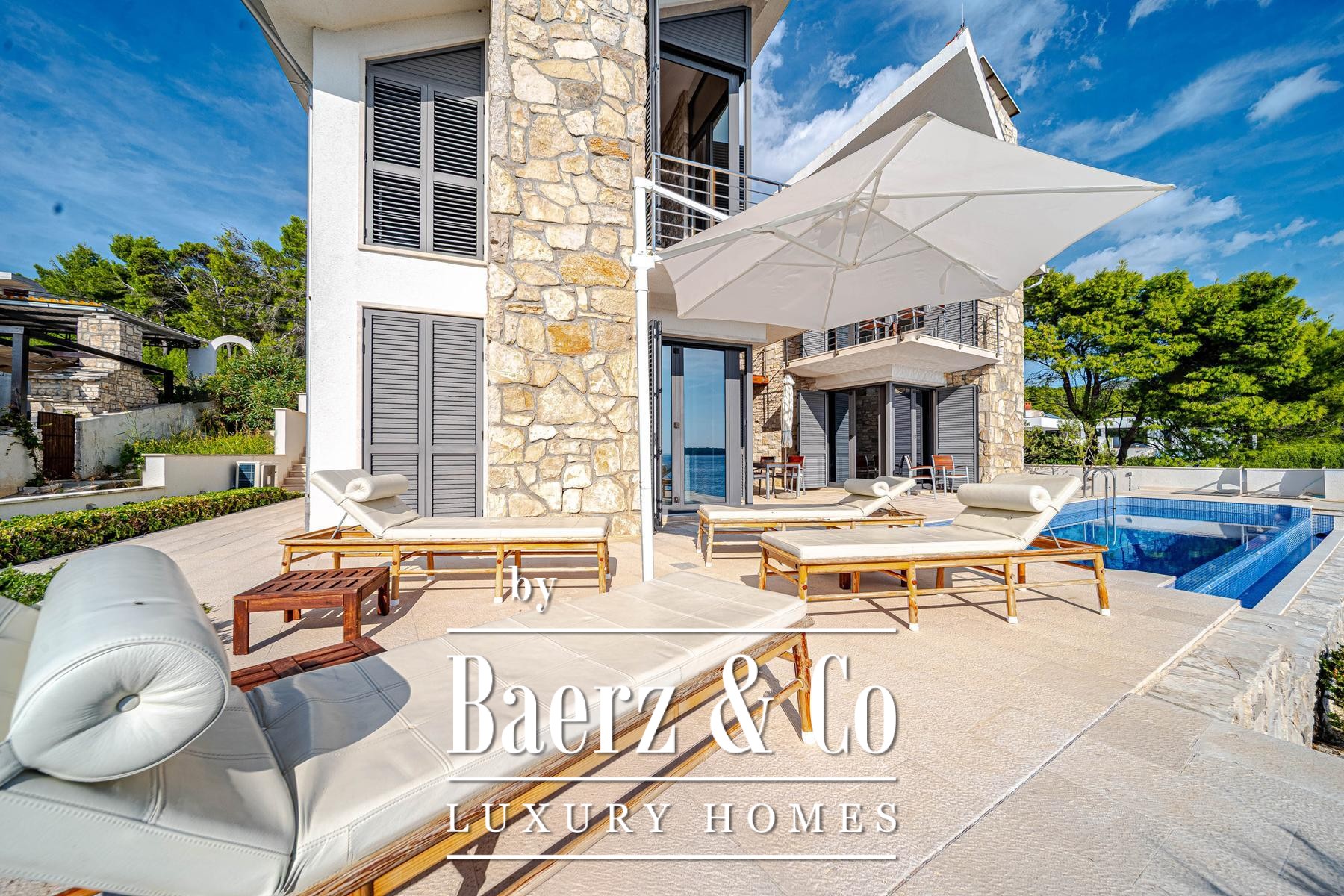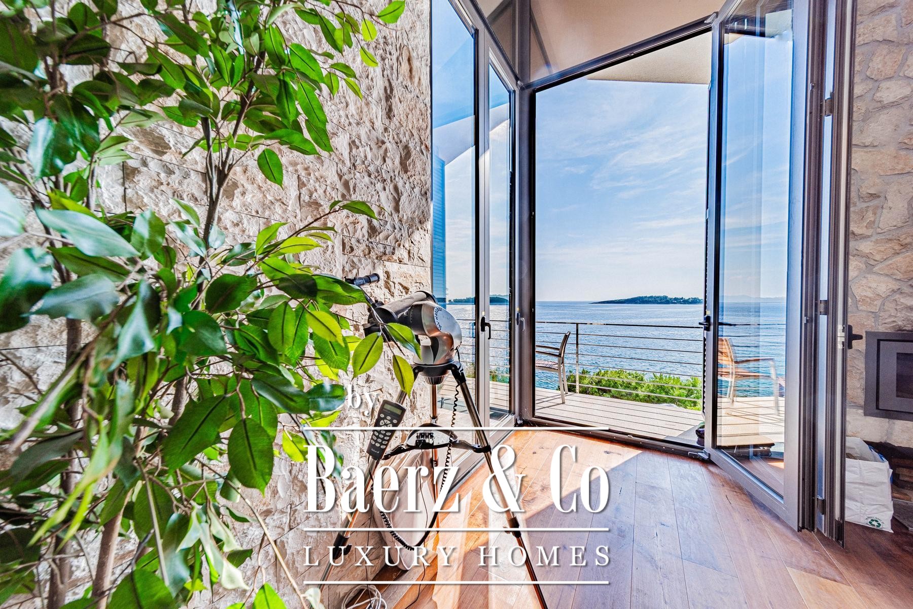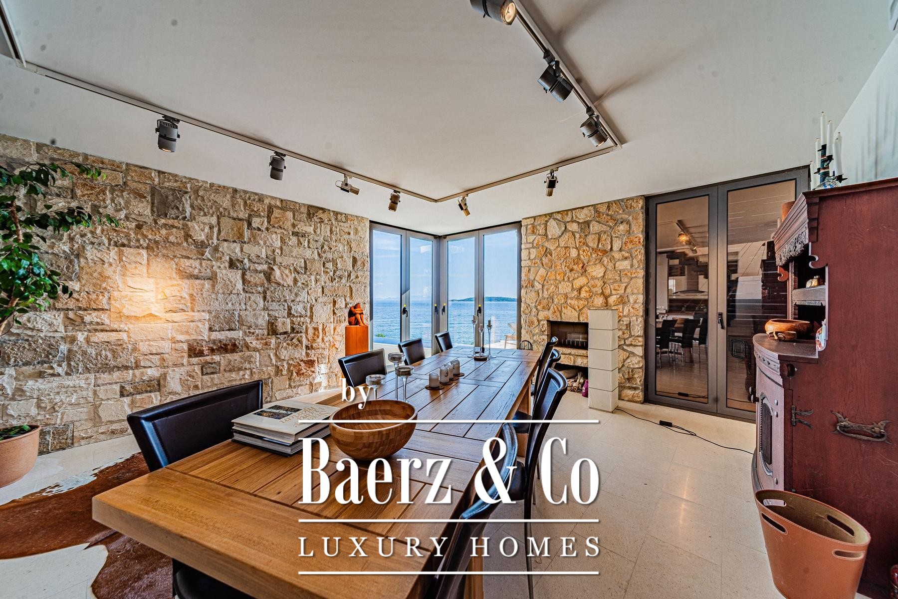 This villa Blato is set directly on the seashore in Croatia, presenting 260 m² of interior living across a 500 m² plot. Architectural clarity defines the residence, composed of two independent units linked by broad terraces, each functioning as a self-contained home. The main floor of both units offers combined living, dining, and kitchen spaces, while upstairs, each provides two bedrooms, all with en suite bathrooms and private terraces.