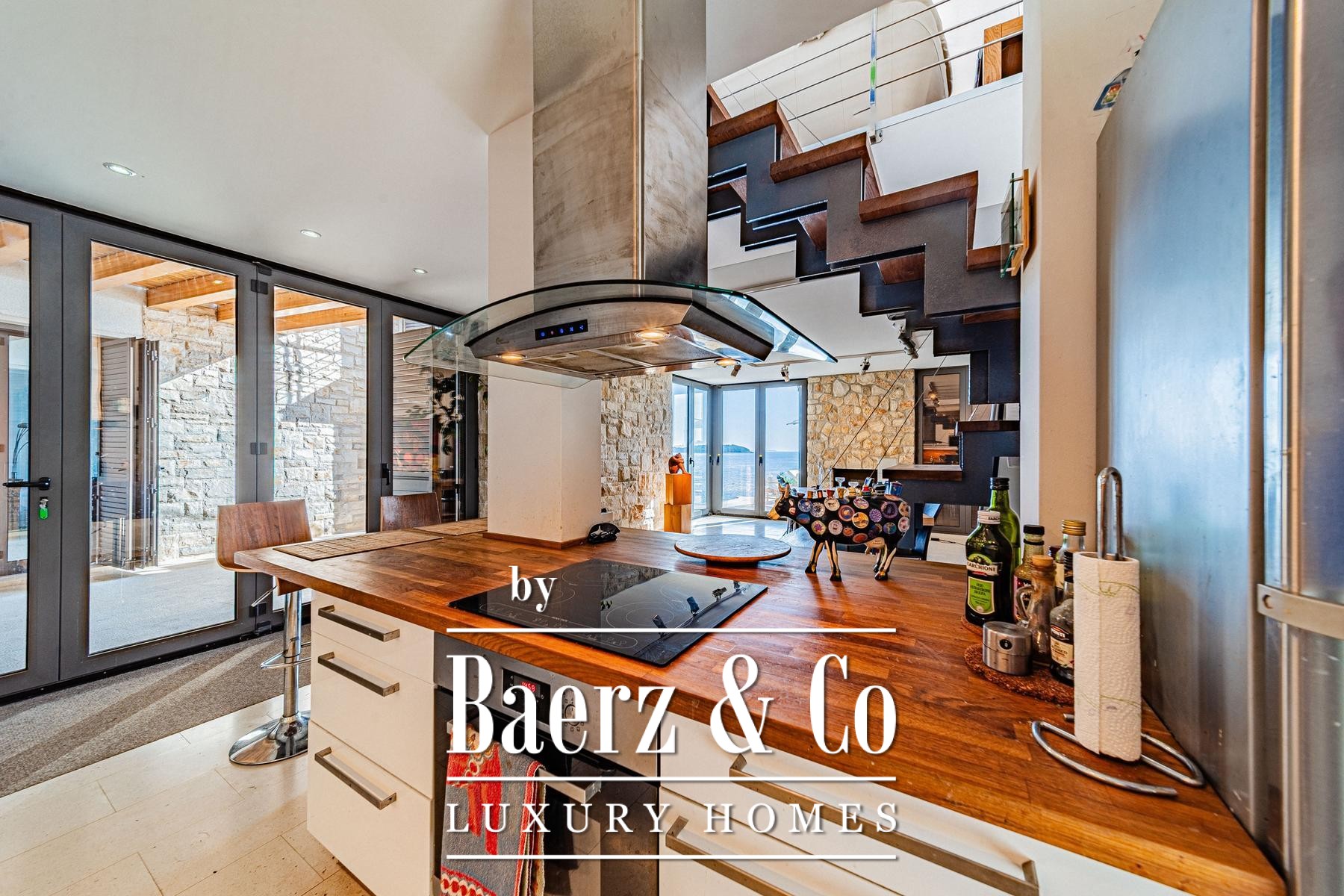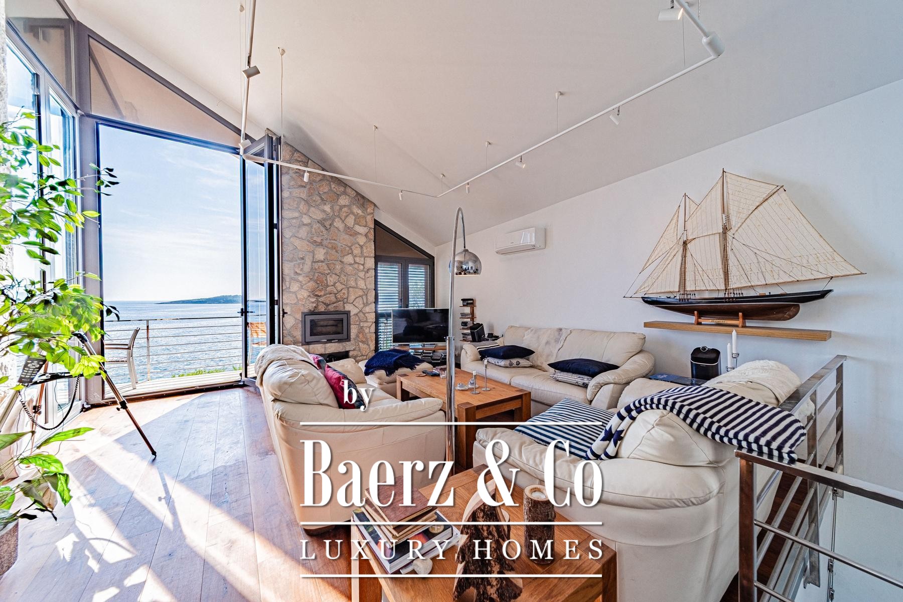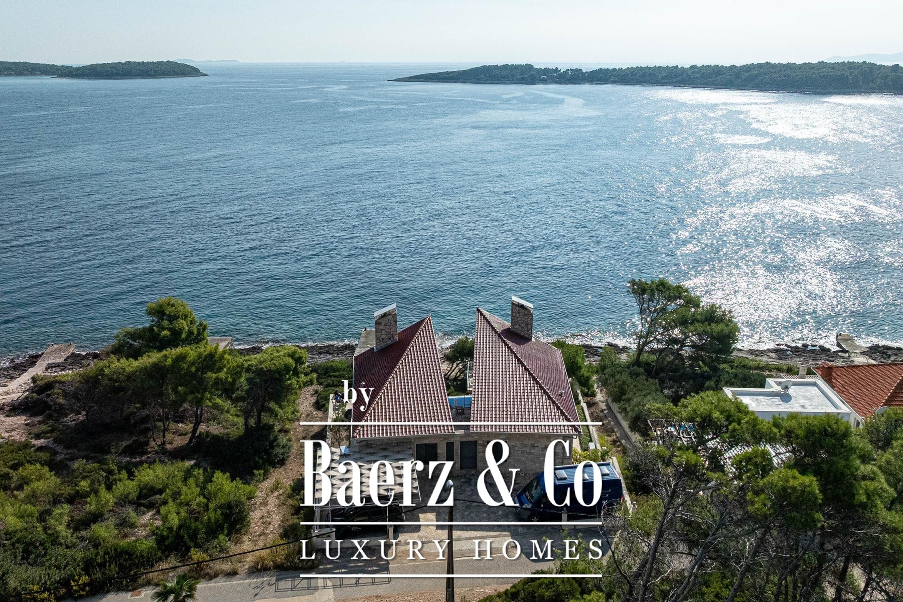 This villa Blato is set directly on the seashore in Croatia, presenting 260 m² of interior living across a 500 m² plot. Architectural clarity defines the residence, composed of two independent units linked by broad terraces, each functioning as a self-contained home. The main floor of both units offers combined living, dining, and kitchen spaces, while upstairs, each provides two bedrooms, all with en suite bathrooms and private terraces.