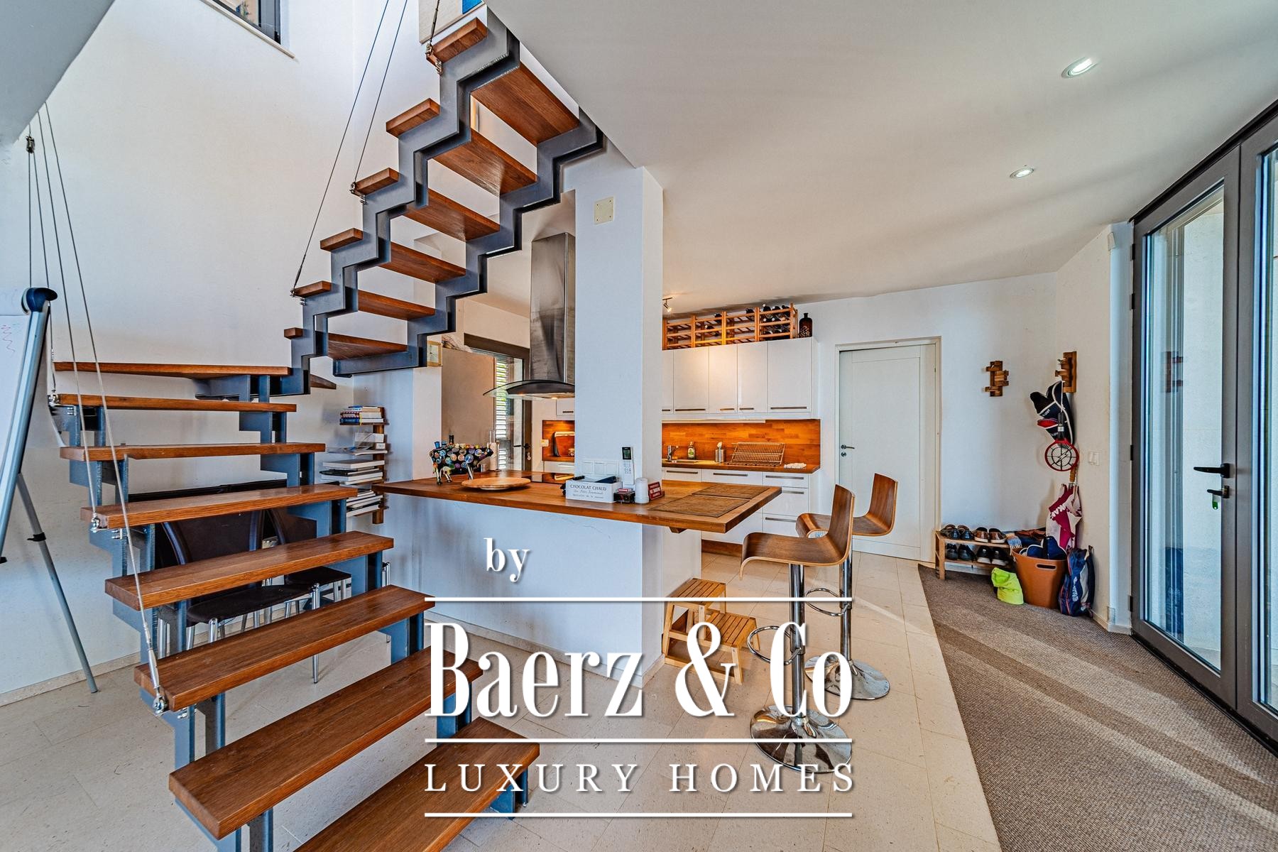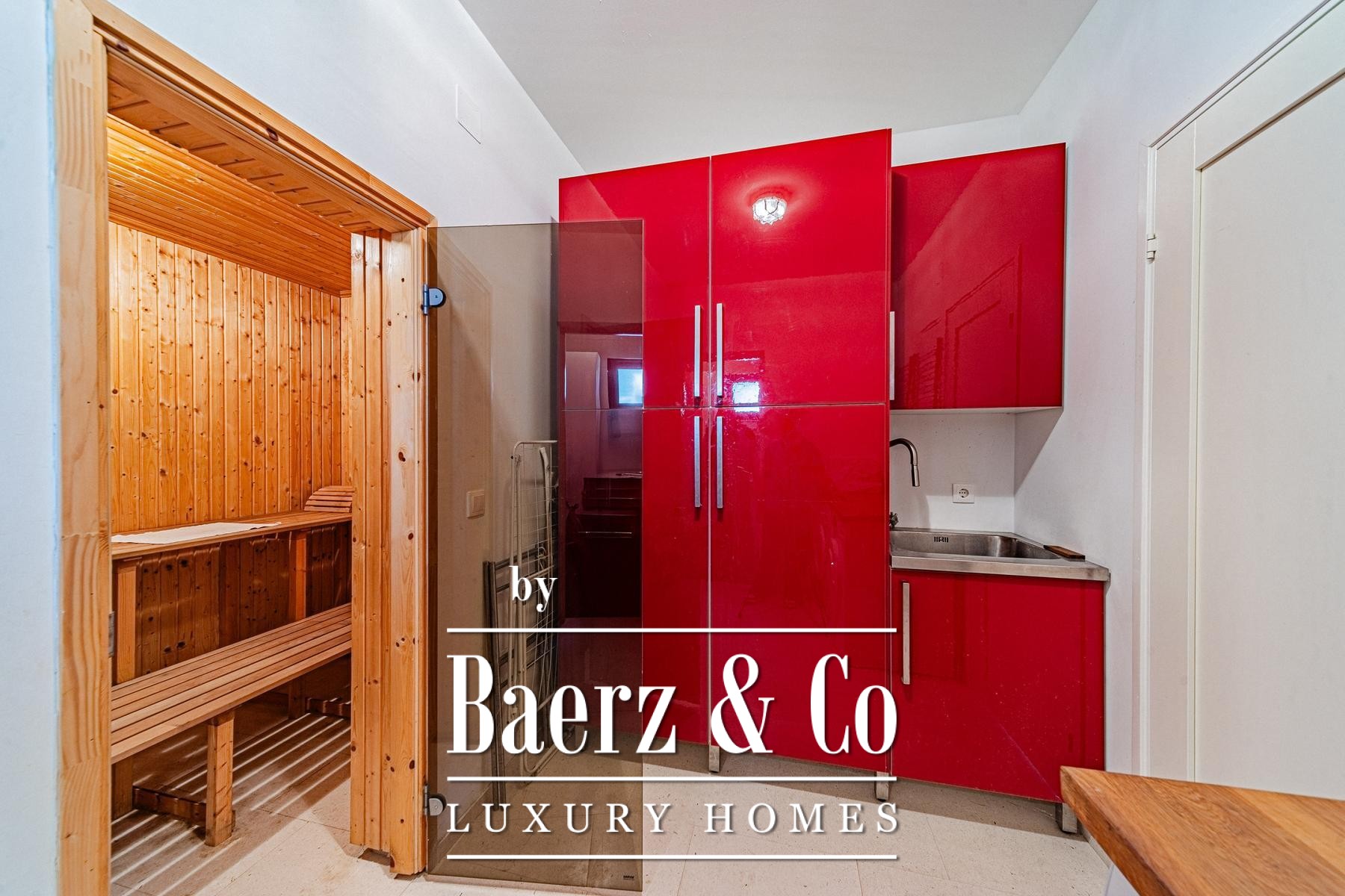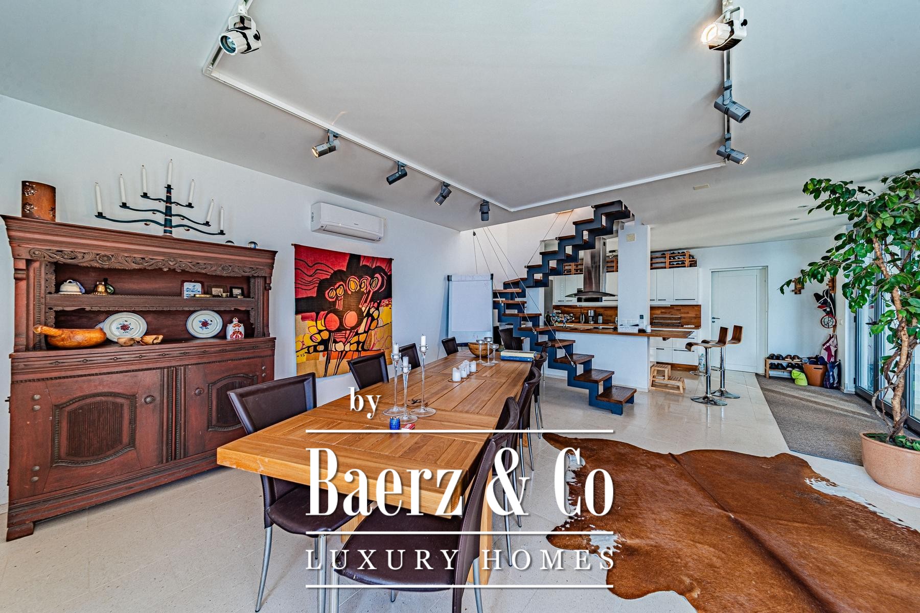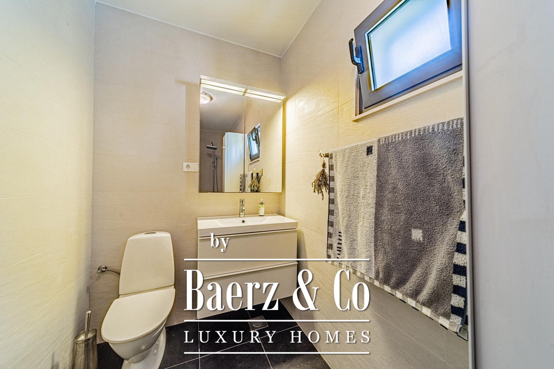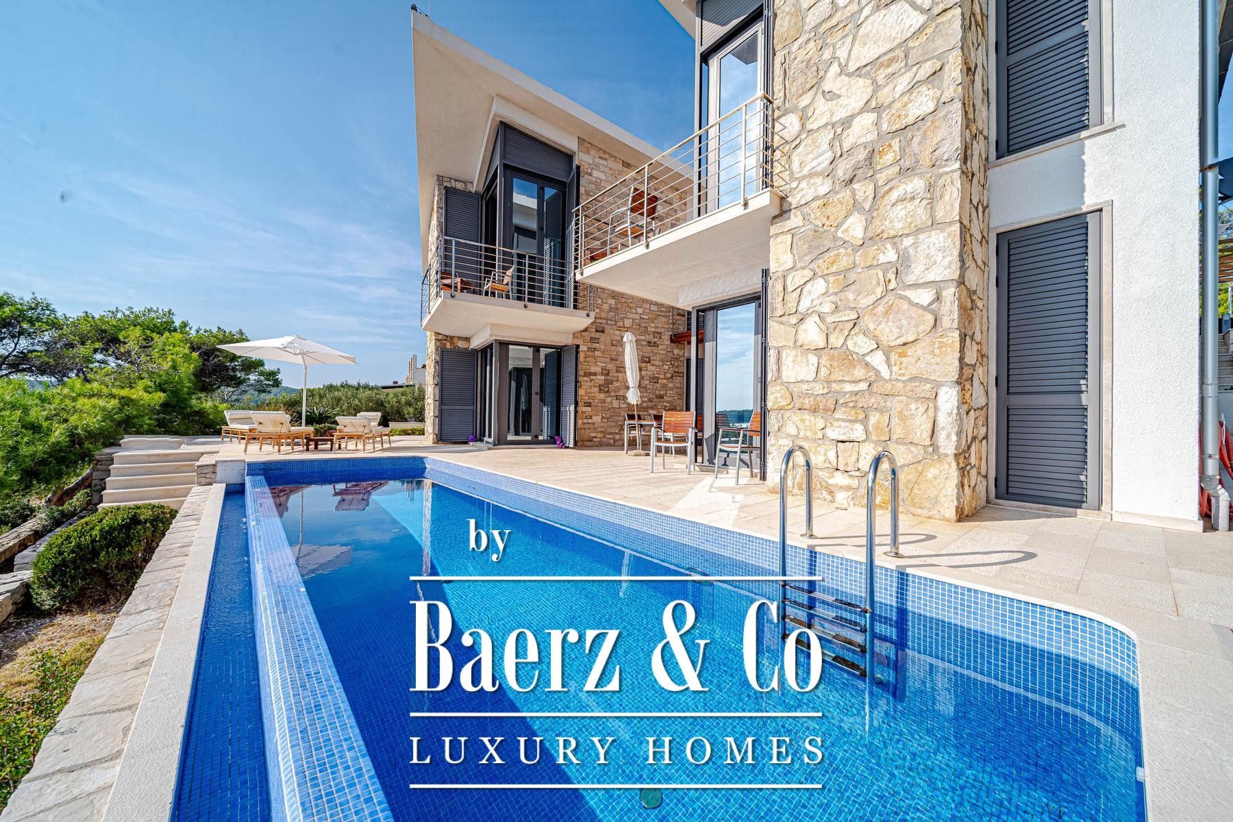 The landscape in front of the villa features pale stone paving, a swimming pool and dedicated areas for sunbathing, all designed to encourage easeful living by the sea. A pedestrian path brings you just 15 metres to the water, where a small pier allows for boat mooring and private retreat. Throughout, the materials and interior finishes display thoughtful attention to detail, imparting a sense of understated exclusivity.