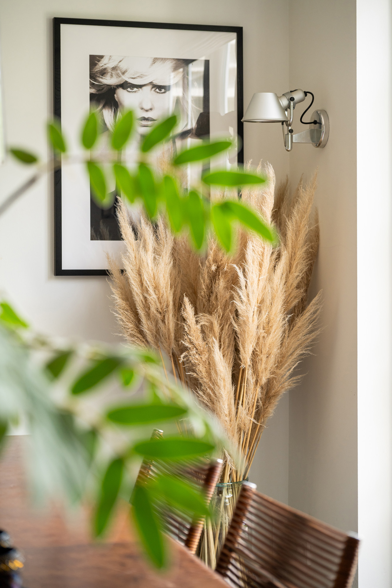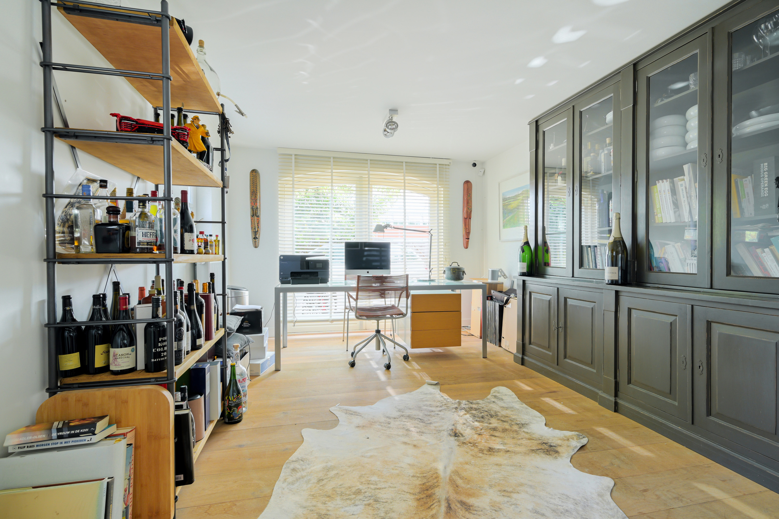 This room, fully fitted with wide wooden floorboards, features a modern mantelpiece with a wood-burning insert. The lofty, open ceiling enhances the airy atmosphere. Large windows offer stunning views of both gardens.