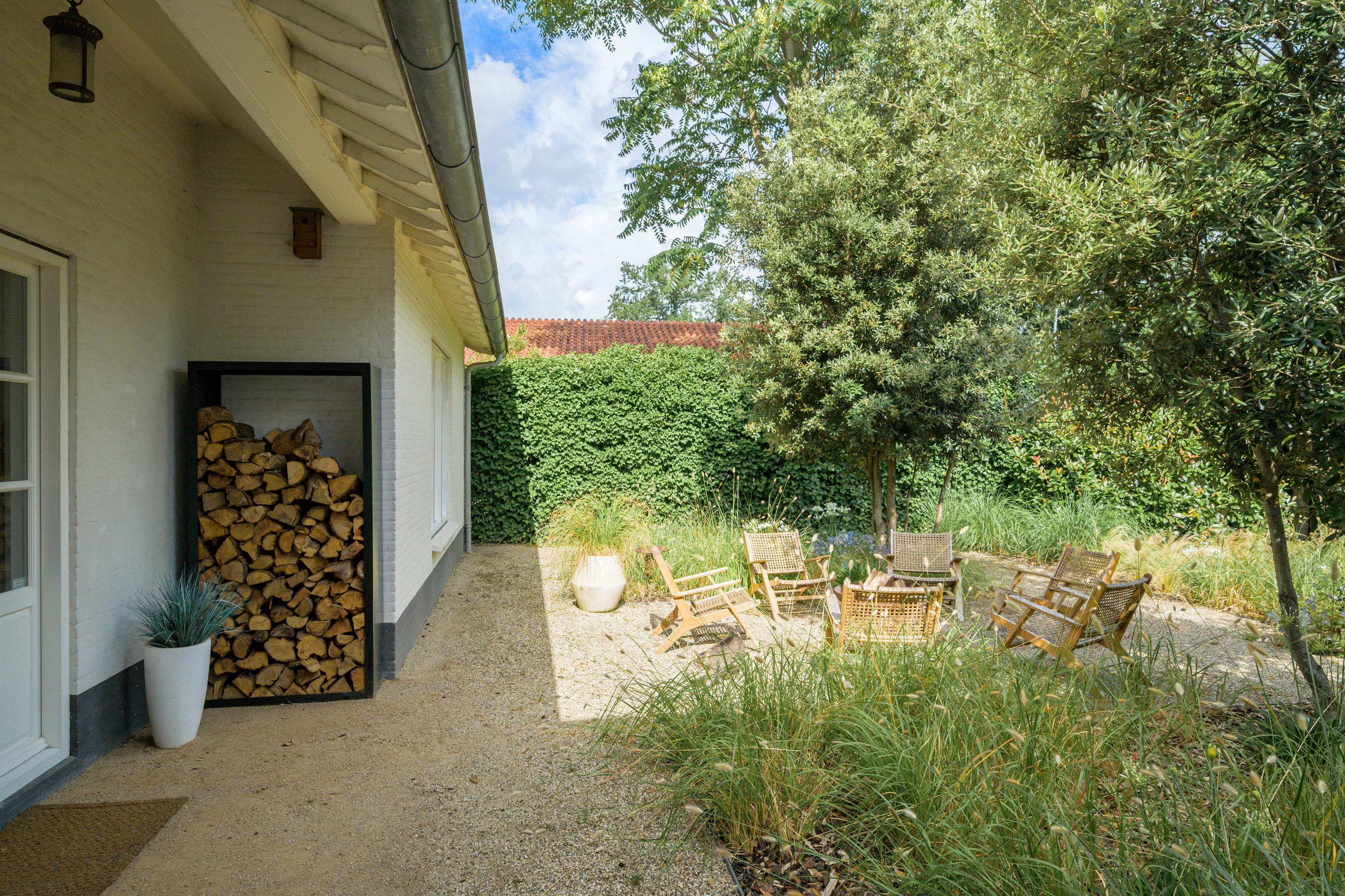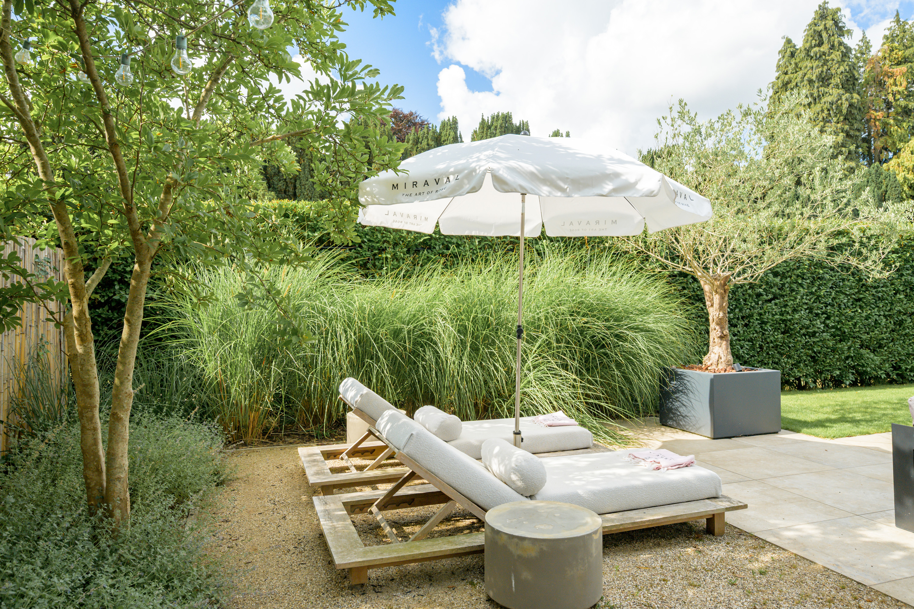 The garden, designed by Ronnie Renette (Arterior), features a lawn, a modern sleek swimming pool with automatic solar cover and heat pump, and multiple terraces.