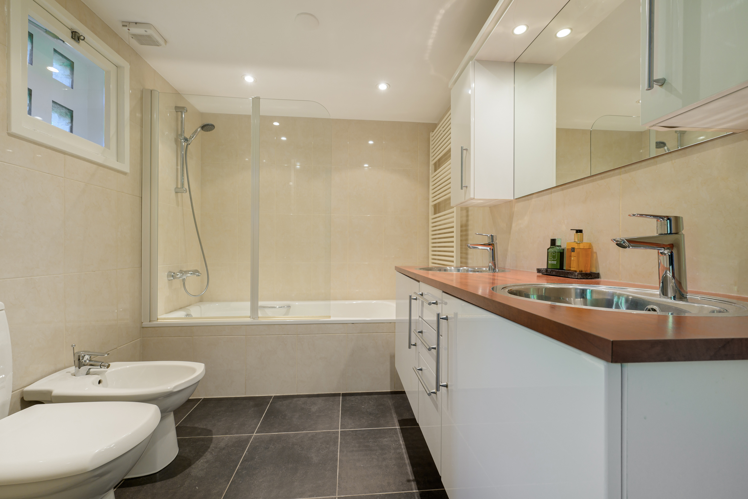 Bathroom with bathtub, toilet, bidet, vanity unit with double sink, and designer radiator.