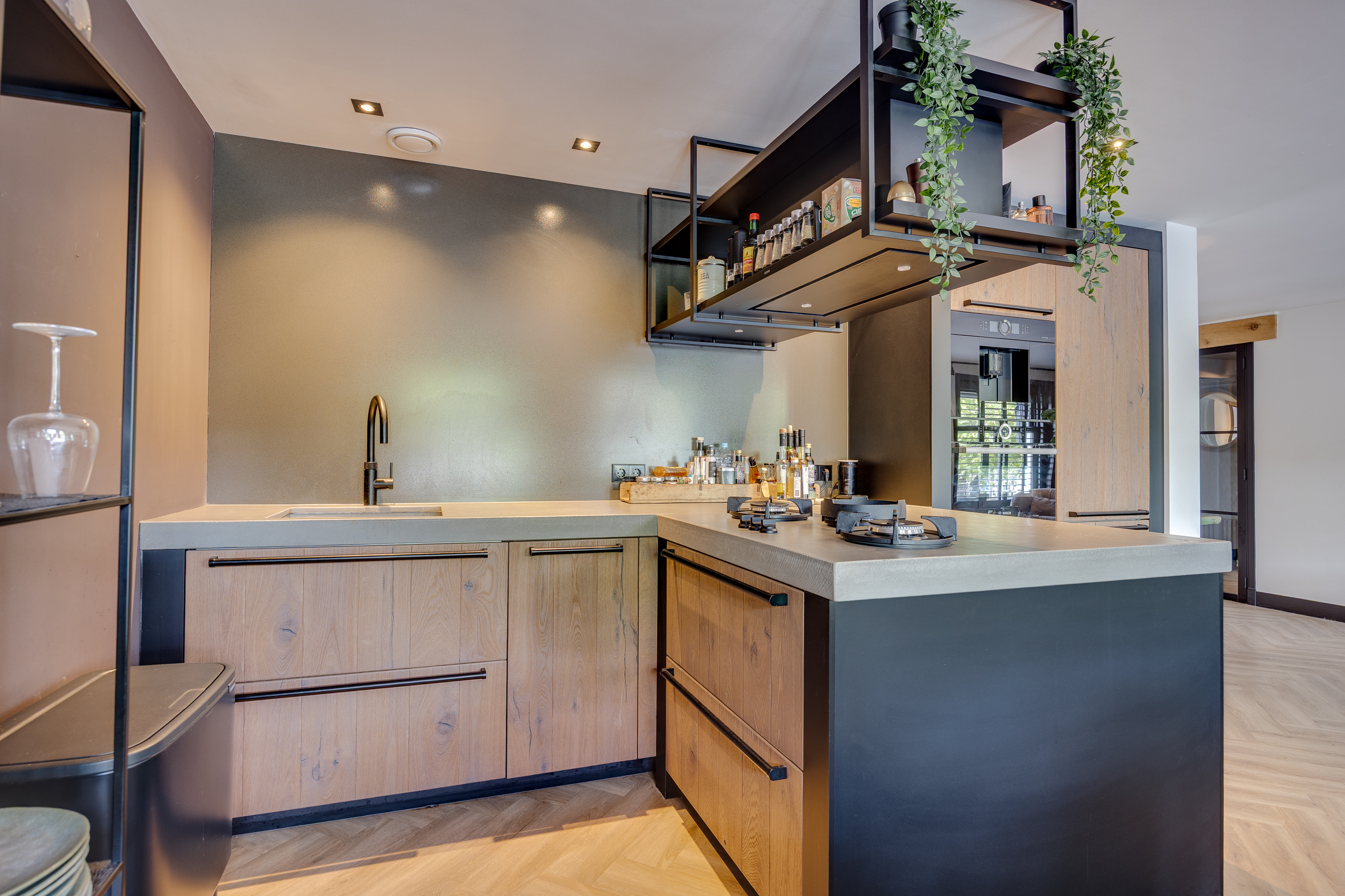 The open-plan kitchen (KBK Kerker, 2020) is a dream for every cooking enthusiast: equipped with high-quality built-in appliances, including Pitt Cooking, a combi oven, combi microwave, built-in coffee machine, Quooker Combi Flex (7 liters), double refrigerator, and a luxurious self-cleaning plasma extractor hood from Wave. The spacious dining table is perfect for enjoying long dinners in style.