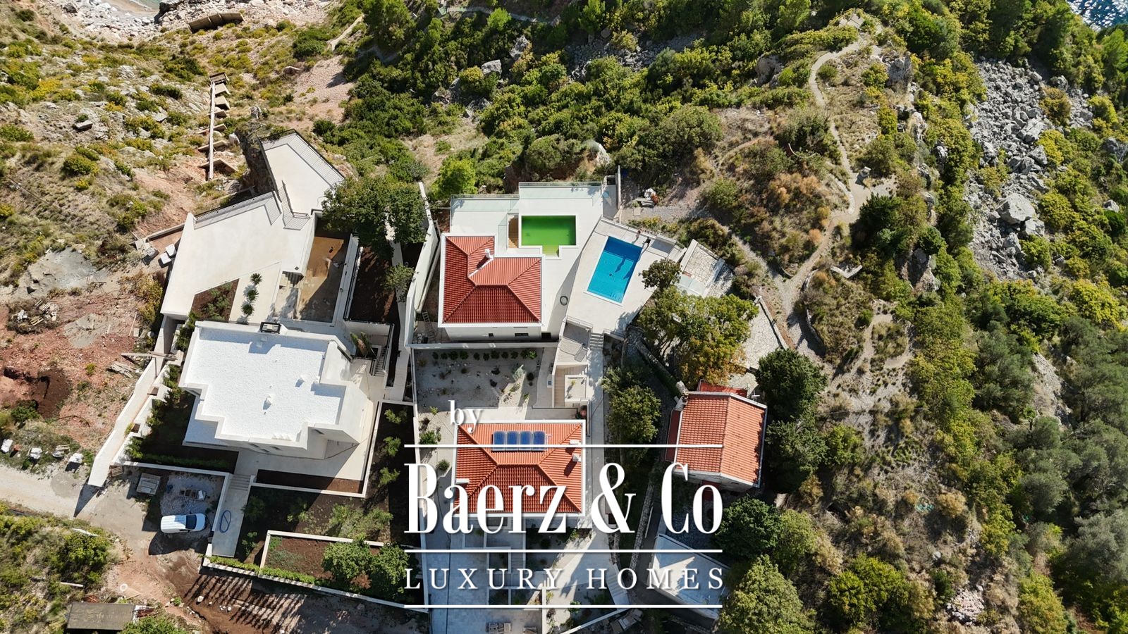Structure of the villa: hallway, living room with kitchen and dining table, 3 bedrooms, 5 bathrooms, a technical room, a laundry room and 3 terraces. The villa has a sea view and the view of the mountains that surround it.