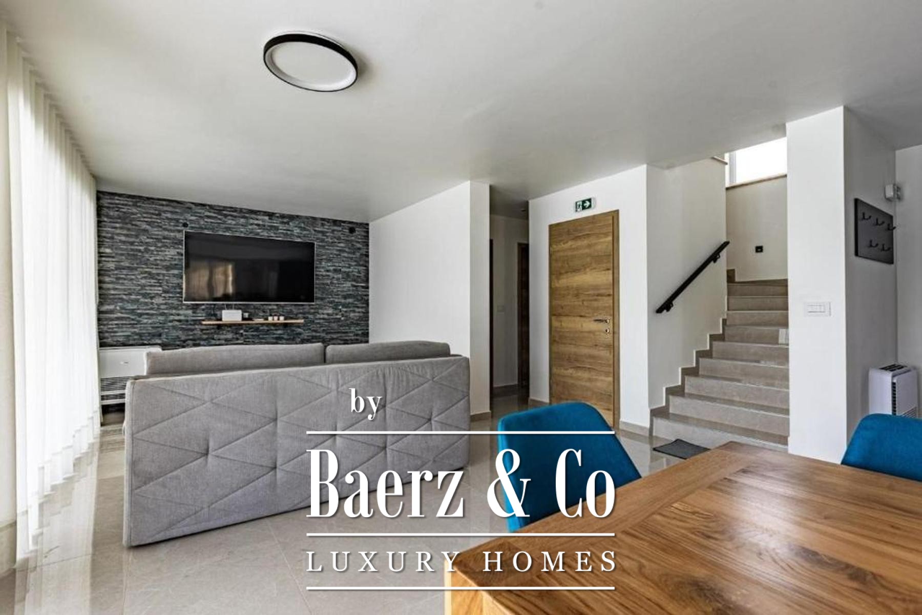 The main villa comprises two levels with a total of 299.56 m², complemented by an auxiliary building of 87 m² to the rear. The architectural concept optimises natural light, with a northern wall for heat retention and a southern façade that balances seasonal sunlight, maintaining a stable and luminous interior atmosphere year-round. The ground level’s open-plan living and kitchen area flows onto a covered terrace, revealing captivating views of the surrounding nature. Provision for wellness facilities invites further personalisation, while three thoughtfully designed ground-floor apartments offer a flexible and functional living experience.