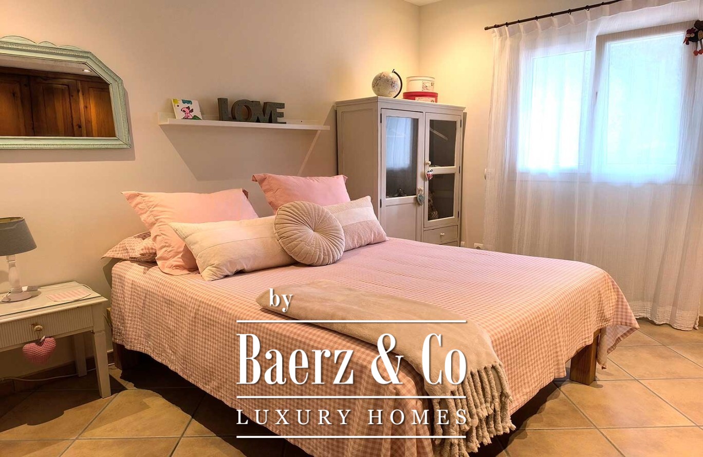 Outdoors, a generous swimming pool anchors a landscape unified by mature trees and immaculate artificial grass, creating both serenity and ease of care. The villa in Ciutadella de Menorca combines authenticity and privacy with immediate access to the Mediterranean coast, presenting a rare lifestyle opportunity.