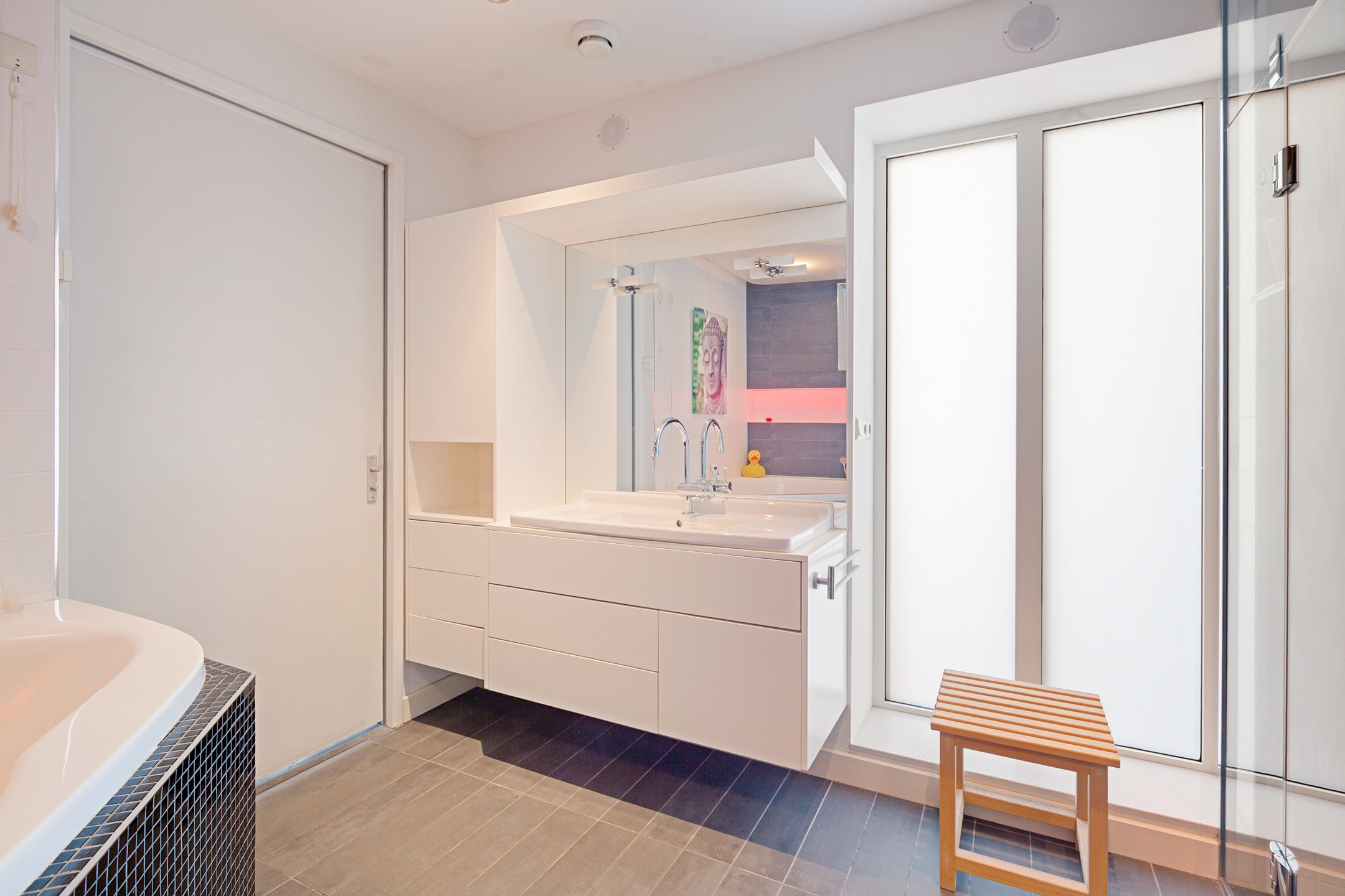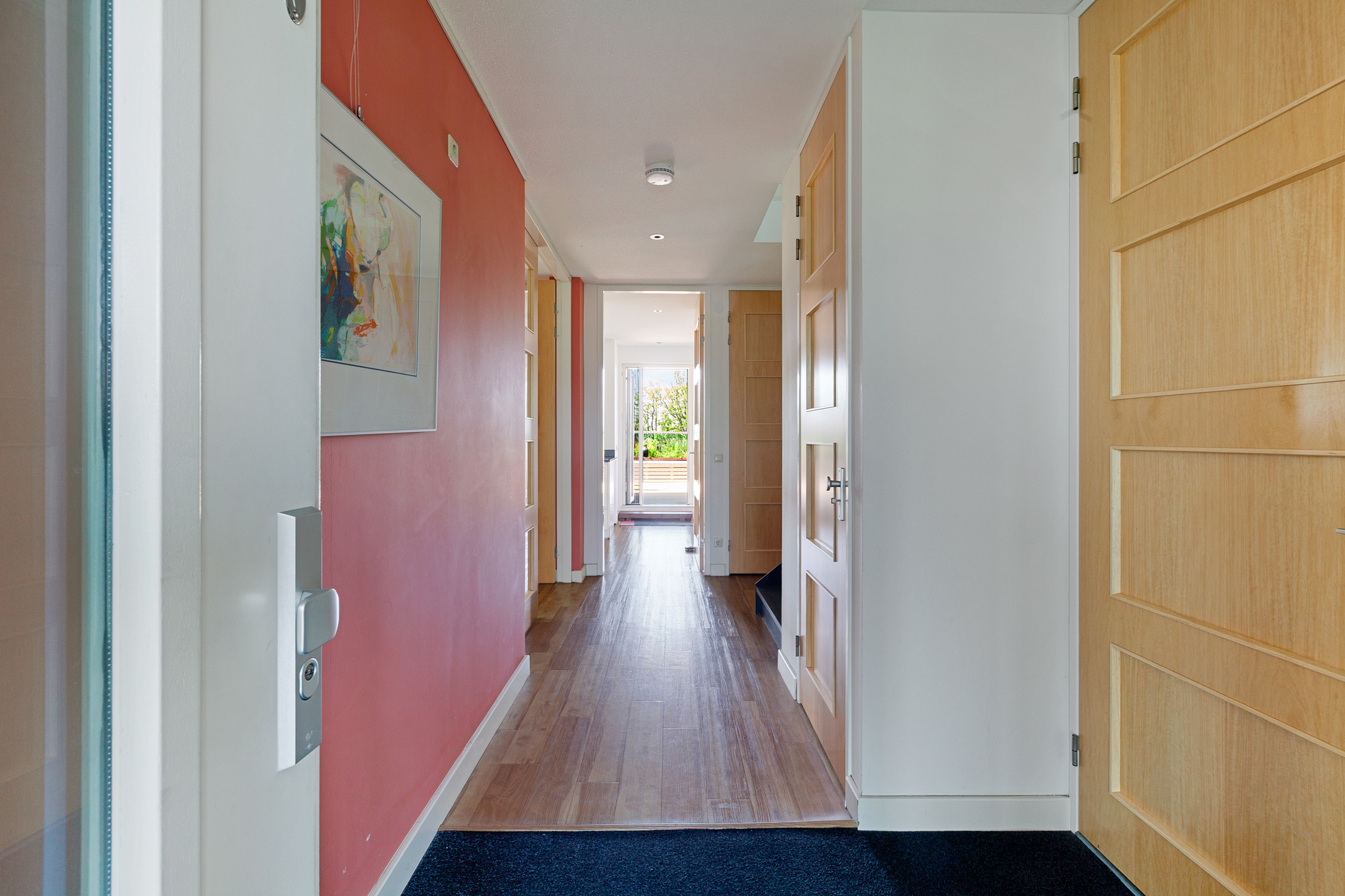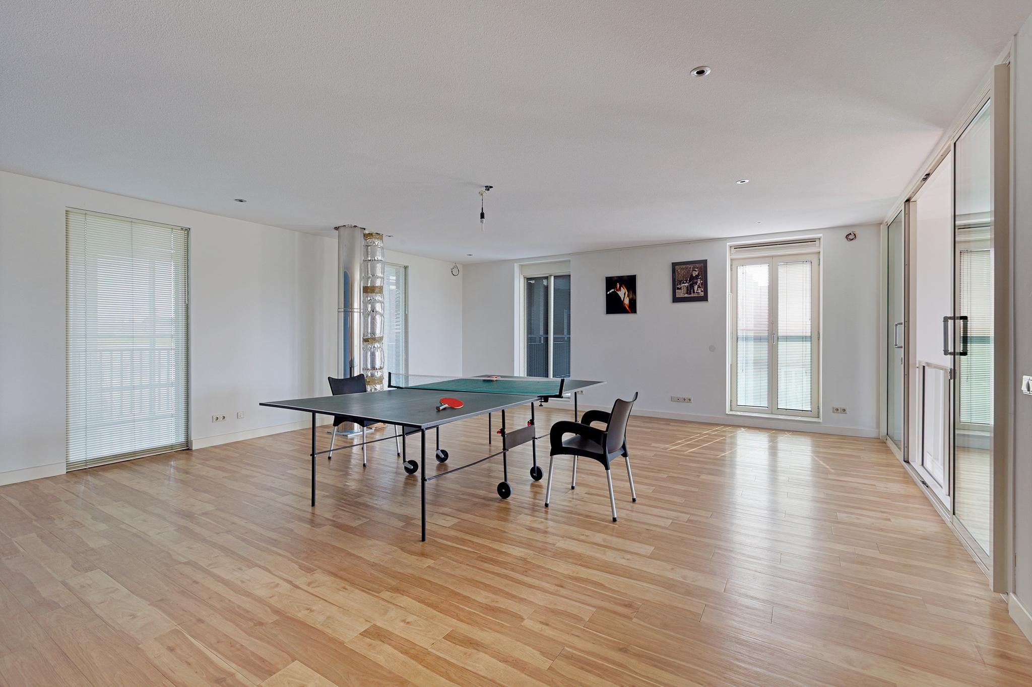 Entrance to the apartment. Spacious hallway providing access to various rooms. Exceptionally large living room with a cozy seating area and a large fireplace/stove. The bright dining area immediately stands out due to the unique ceiling height of no less than 5.50 meters, thanks to the mezzanine! During construction, this height was deliberately created to allow for the installation of a striking chandelier. The dining area provides access to a lovely sunroom on the terrace and to the open kitchen. The kitchen is modern, offers ample cupboard space, and is equipped with luxurious built-in appliances, including a fridge, freezer, microwave, oven, induction cooktop, extractor hood, dishwasher, and Quooker. The master bedroom is located on the northeast side of the apartment and is beautifully furnished with ample built-in wardrobes. From this bedroom, you can access a luxurious and spacious bathroom equipped with a walk-in shower, (whirlpool) bath with star ceiling, sauna, toilet, and a vanity unit – a wonderful space to fully unwind.