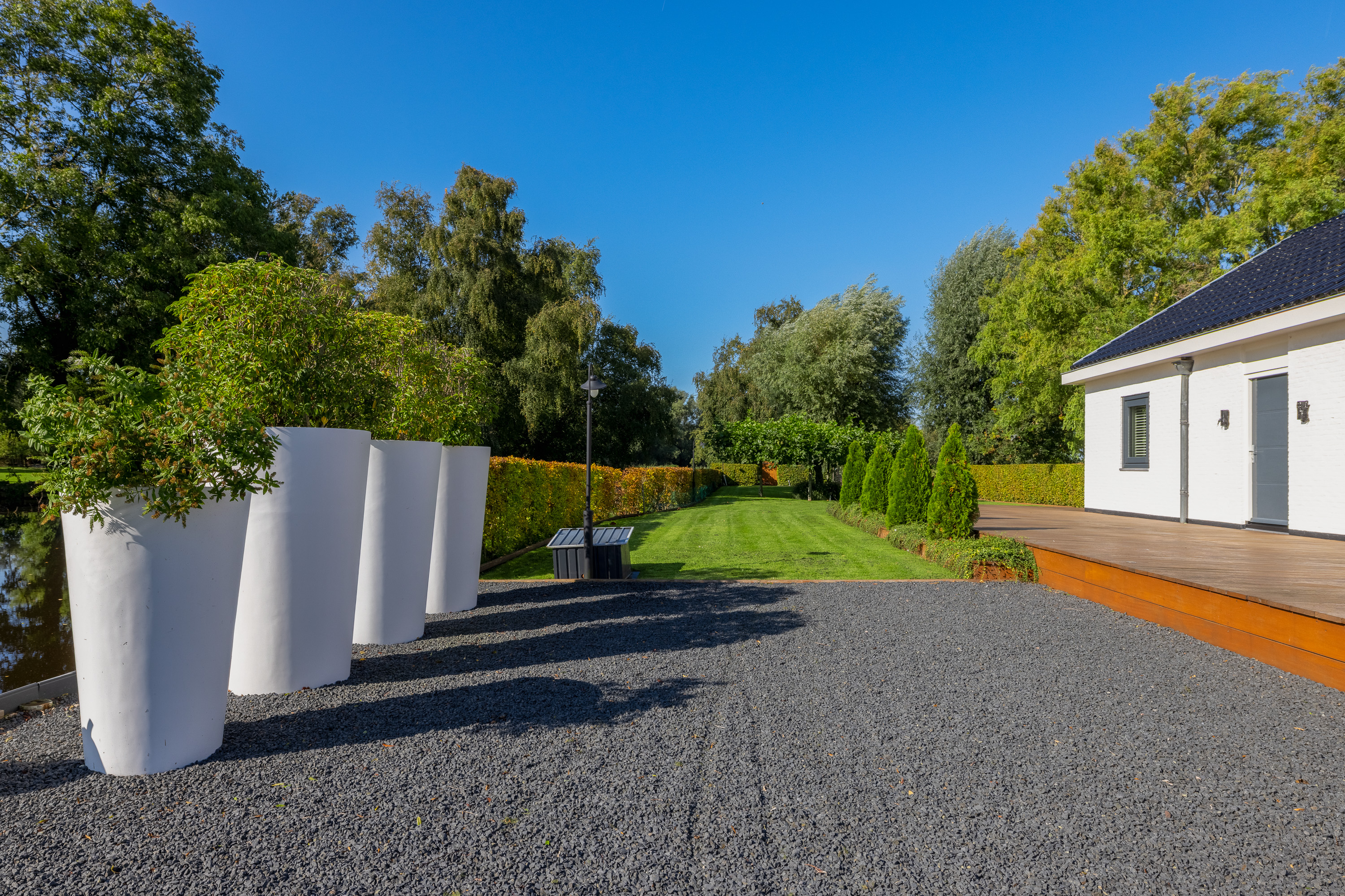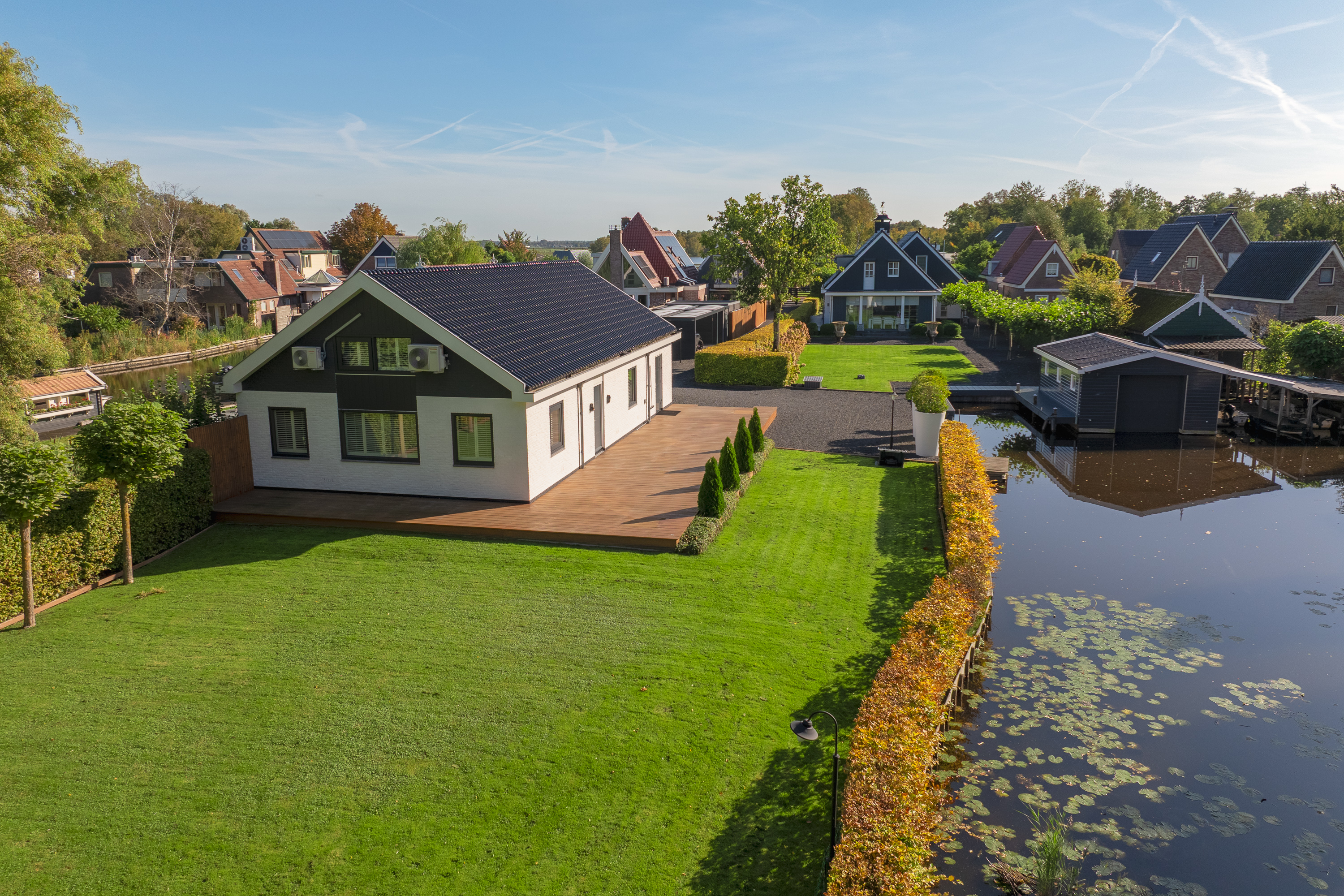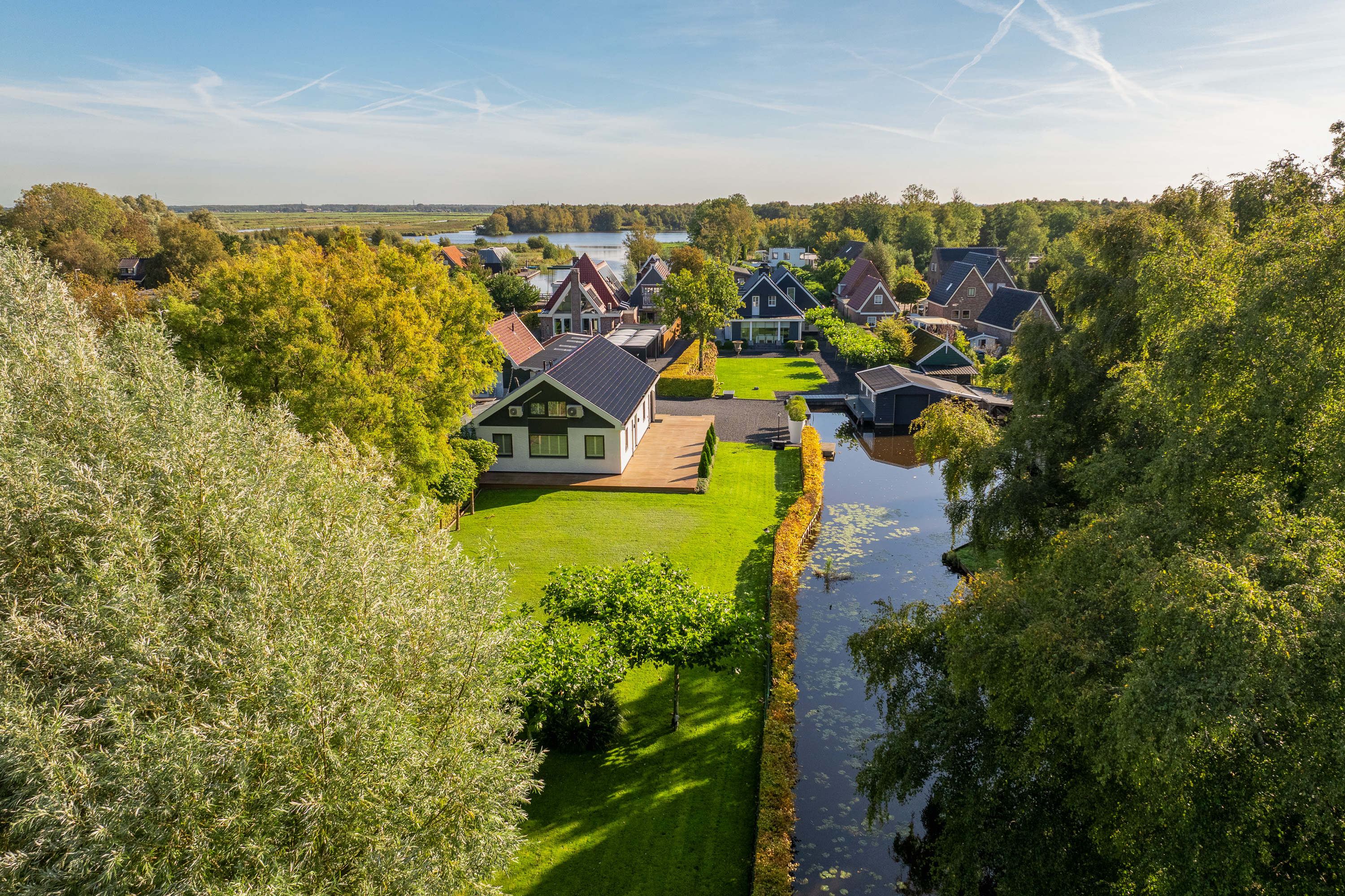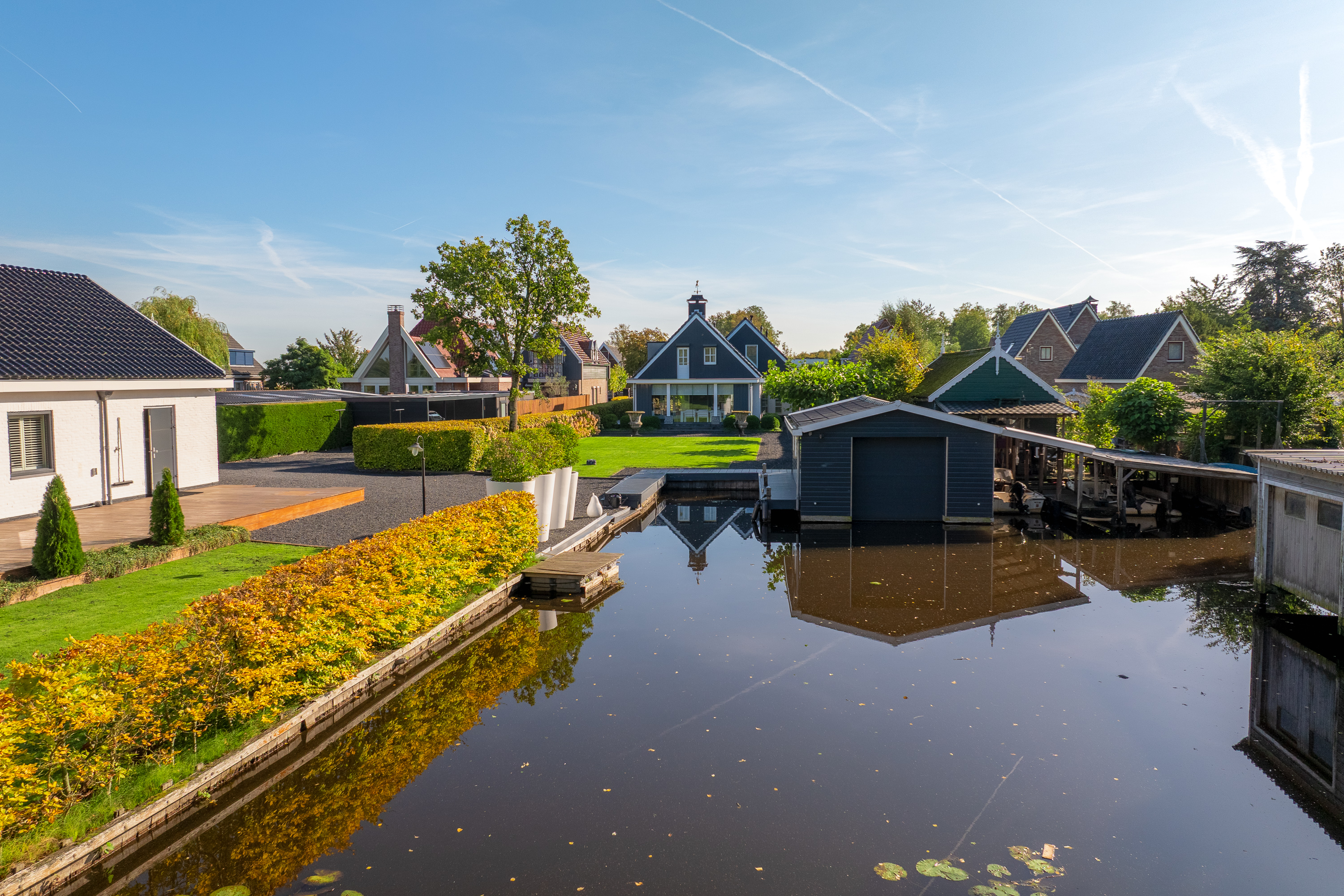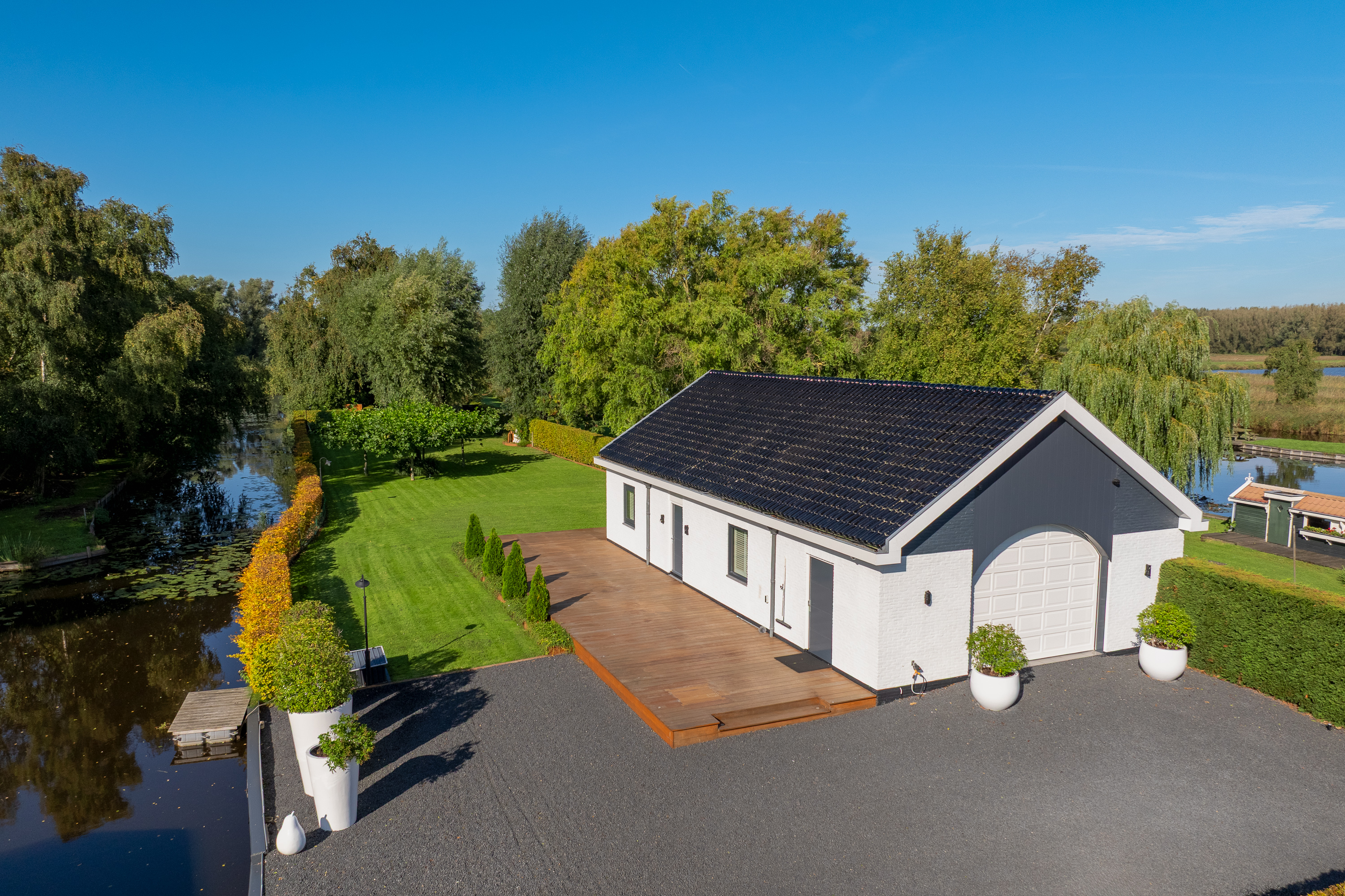 The beautifully landscaped garden is an oasis of peace and elegance. Sleek terraces, mature trees, and perfect positioning toward sun and water create an environment where privacy and relaxation take center stage. From the private boathouse, you step directly into your boat for a trip across open waterways — from Het Twiske to the canals of Amsterdam.