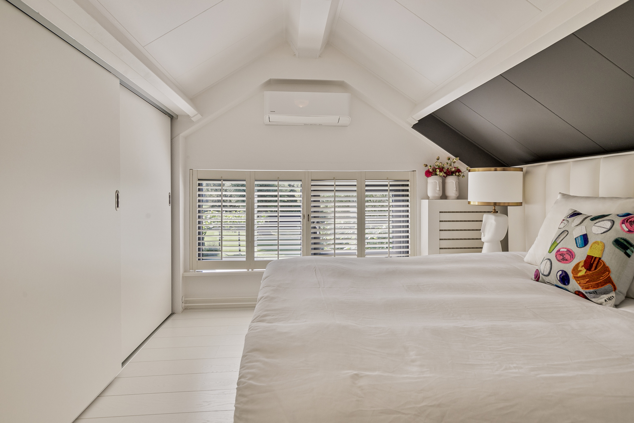 Spacious bedroom, storage room, and attic space.