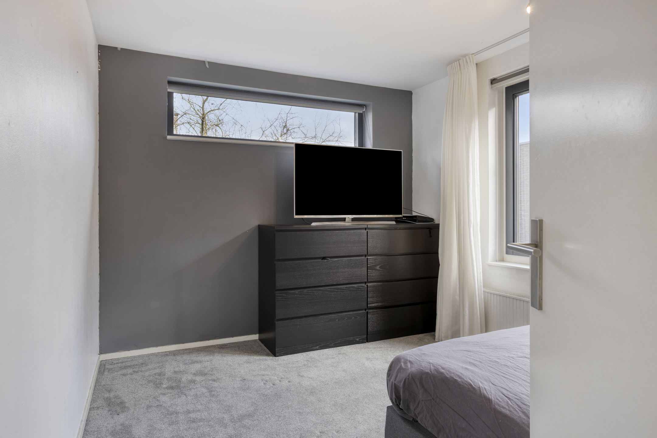 Eerste verdieping: bordes met toegang tot de vide die nu wordt gebruikt als atelier, de berging en de twee hele ruime kamers (30 m²). De berging is voorzien van een wastafel en daar zit tevens de CV-ketel. De ene kamer wordt nu gebruikt als slaapkamer en de ander als extra living. Dit kan uiteraard ook prima gebruikt worden als slaapkamer.