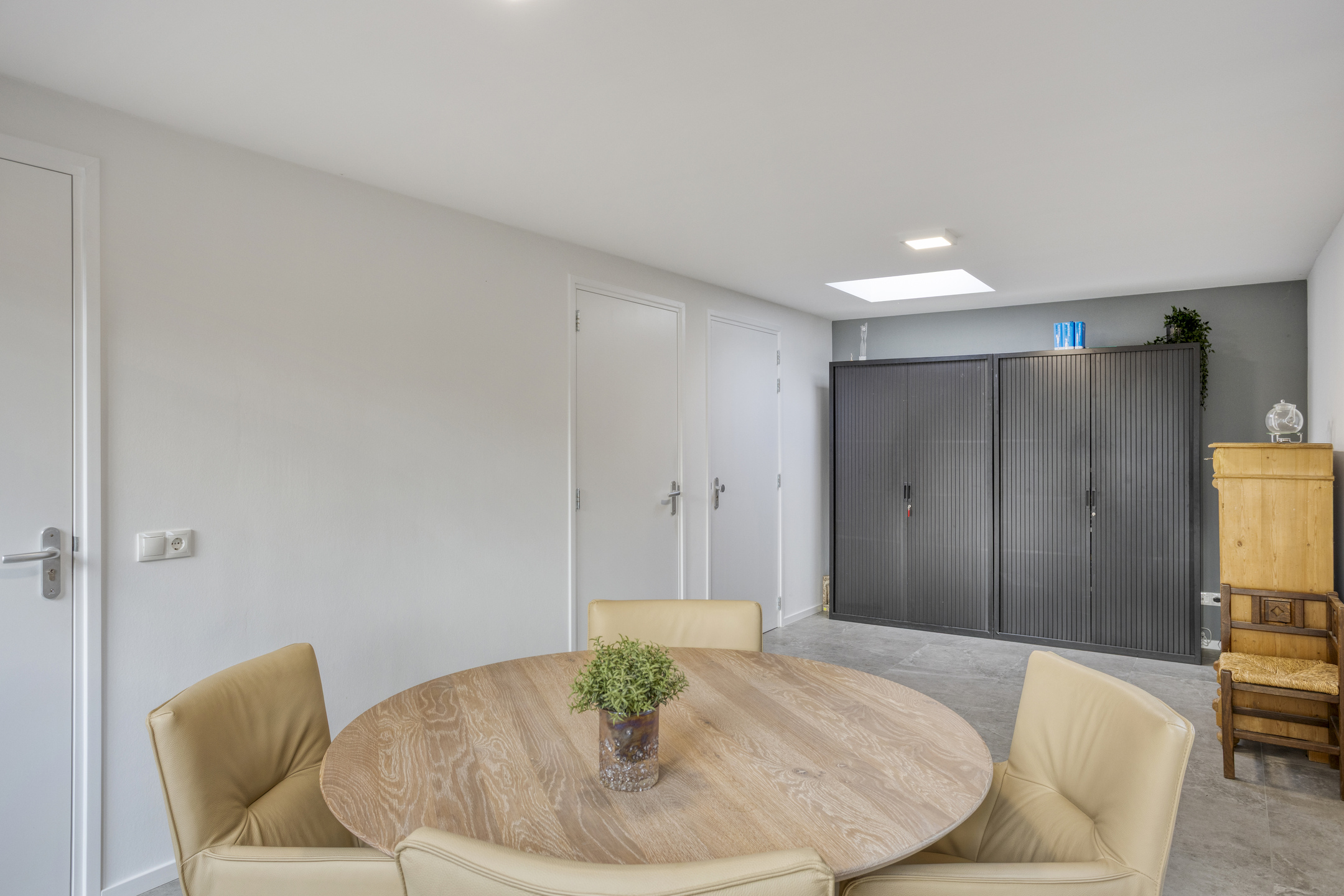 Via de hal kom je in de eetkamer, een lichte en uitnodigende ruimte dankzij de grote schuifpui. De eetkamer is voorzien van een houtkachel. Hier bevindt zich ook de trapopgang naar de eerste verdieping. Vanuit de eetkamer loop je door naar de woonkamer en de keuken. De woonkamer is ook voorzien van een sfeervolle houtkachel. De dichte keuken heeft een speels effect dank zij de bar aan het keukenblad. De keuken is uitgerust met diverse inbouwapparatuur, waaronder een 4-pits inductiekookplaat met afzuigkap, oven, koelkast, vaatwasser, stoomoven, warmhoudlade en een keukenboiler.